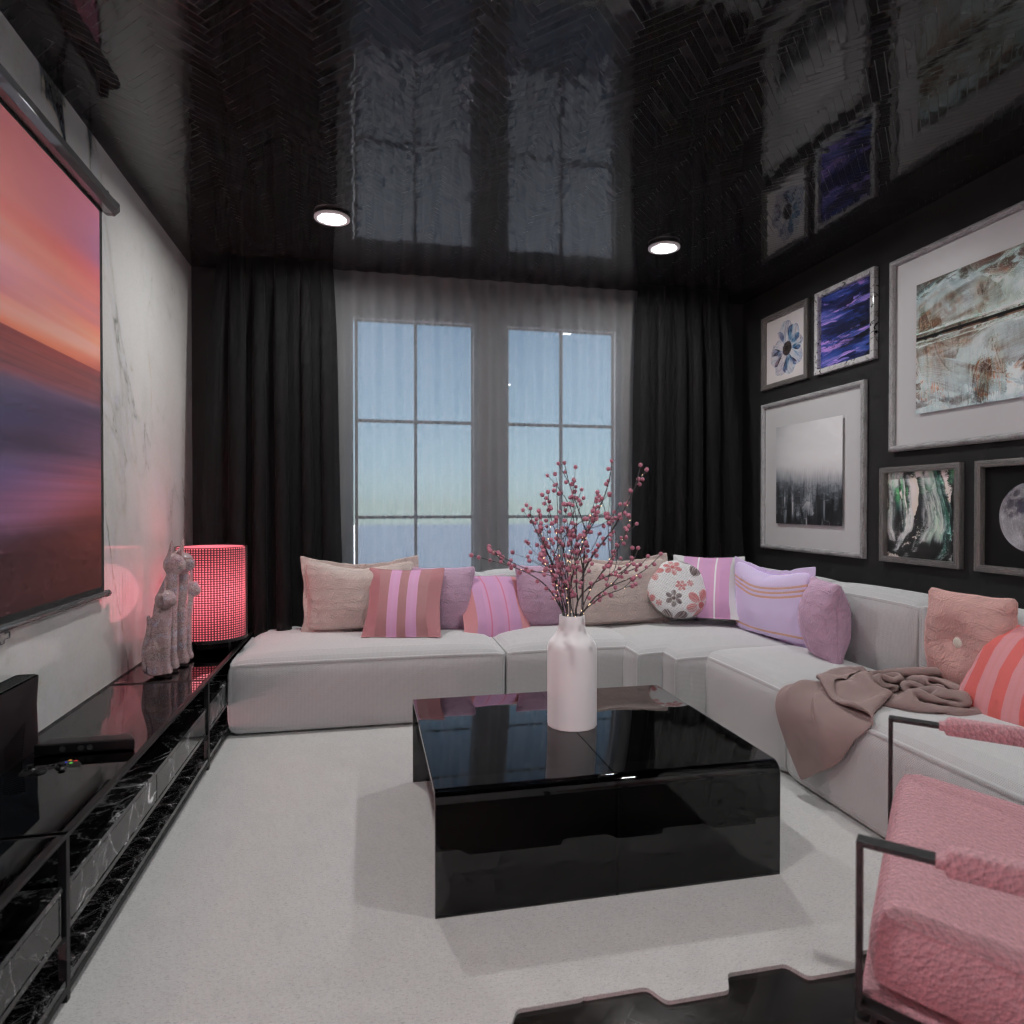 Design Sie das Wohnzimmerinterieur in Schwarz-Weiß-Farben mit einem lebhaften Akzent nach Wahl.