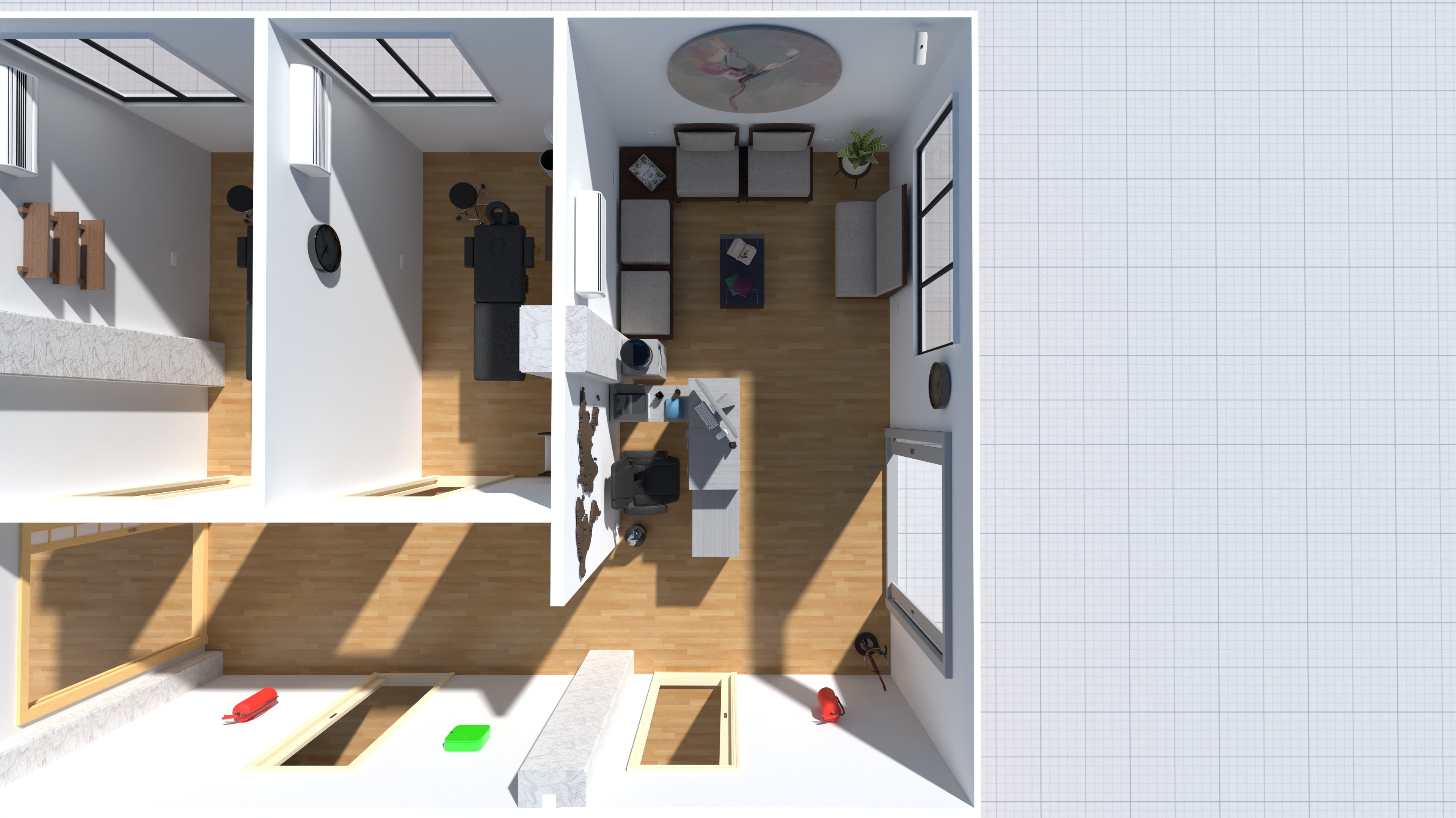 Sala de recepción + sala de espera: clínica de fisioterapia