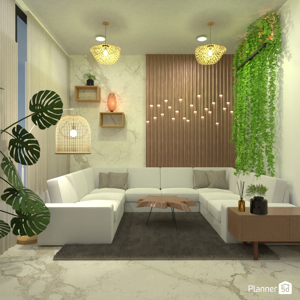 Diseña el interior de una sala de estar con texturas y colores naturales.