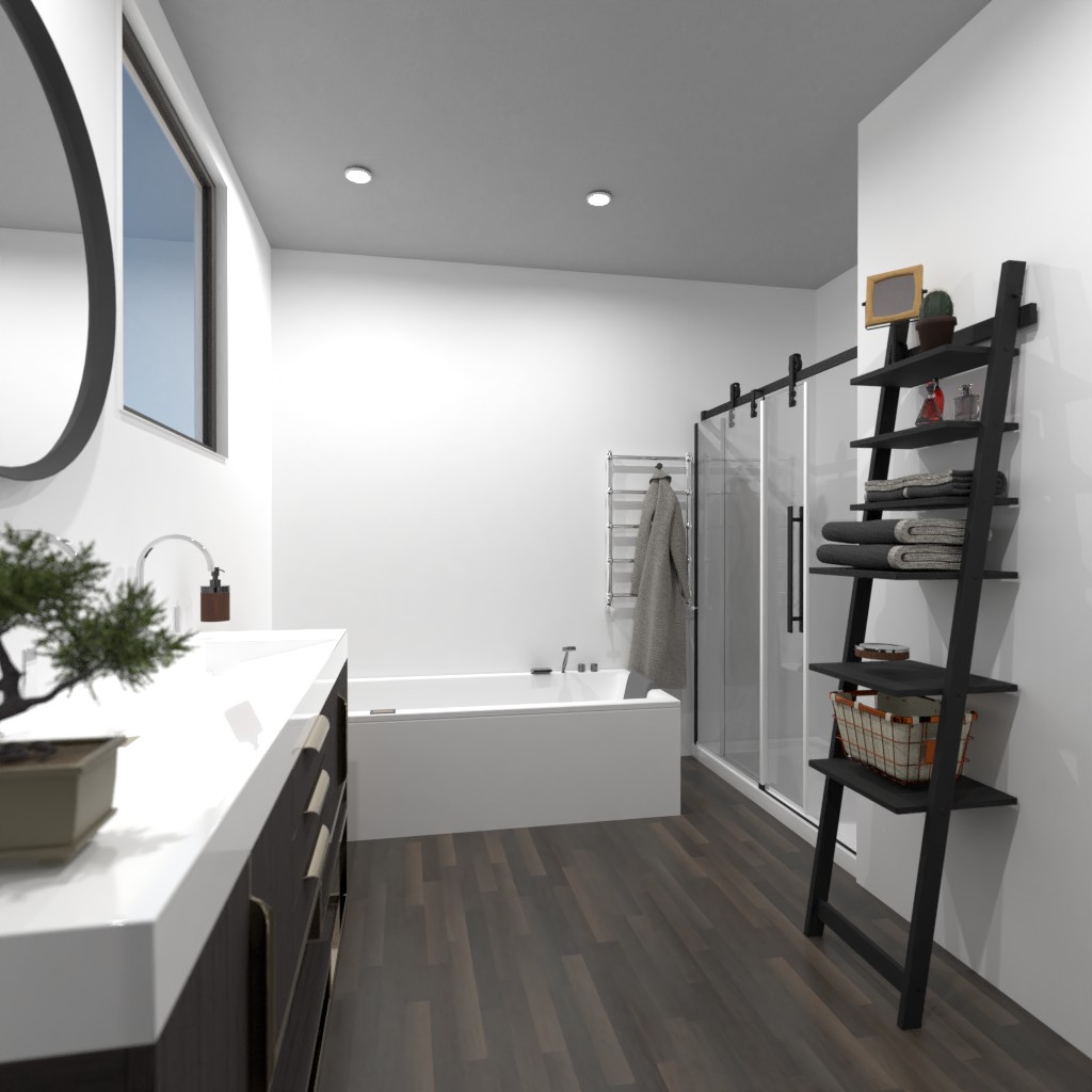 Diseñe un baño estilo loft con doble lavabo, bañera y ducha.