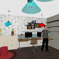 Living Room With Working Space, in red and turquoise accents.
