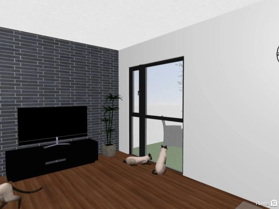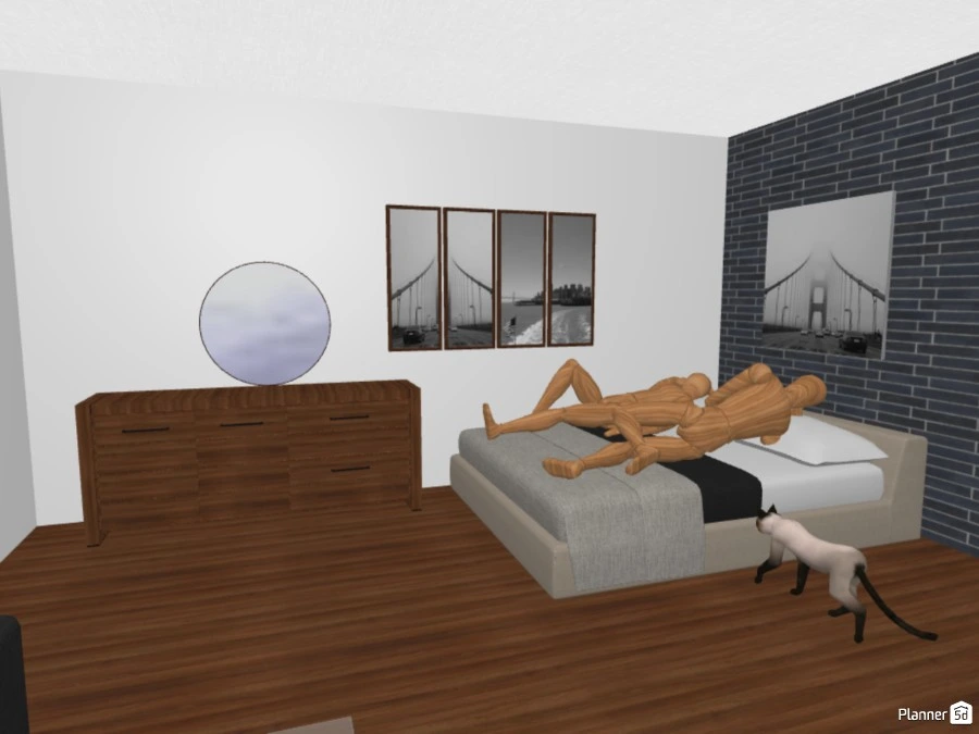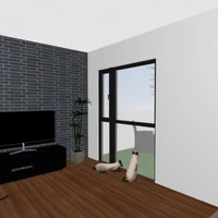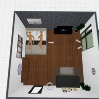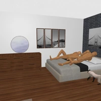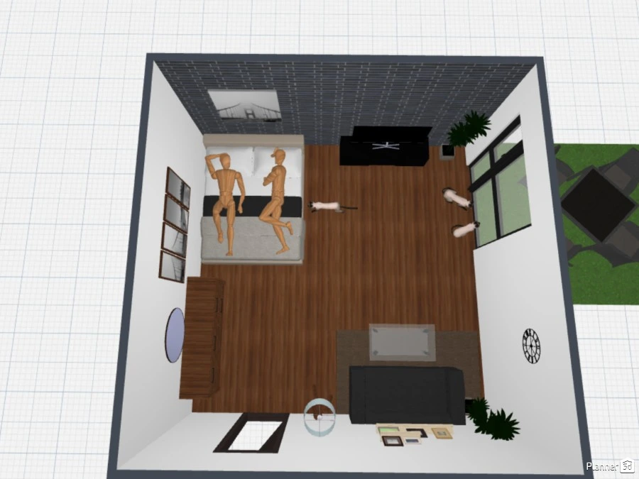 This would be a master bedroom,comes with a king size bed a dresser to fit all your cloths a circle mirror some beautiful plants a comfy couch with a glass coffee table a standing light and across the room you have a tv on a tv stand with storage and you have some fun paintings on the walls.Now heres the fun part you have a sliding glass door that leads to your pateo with a out door set and trees.