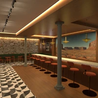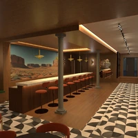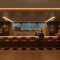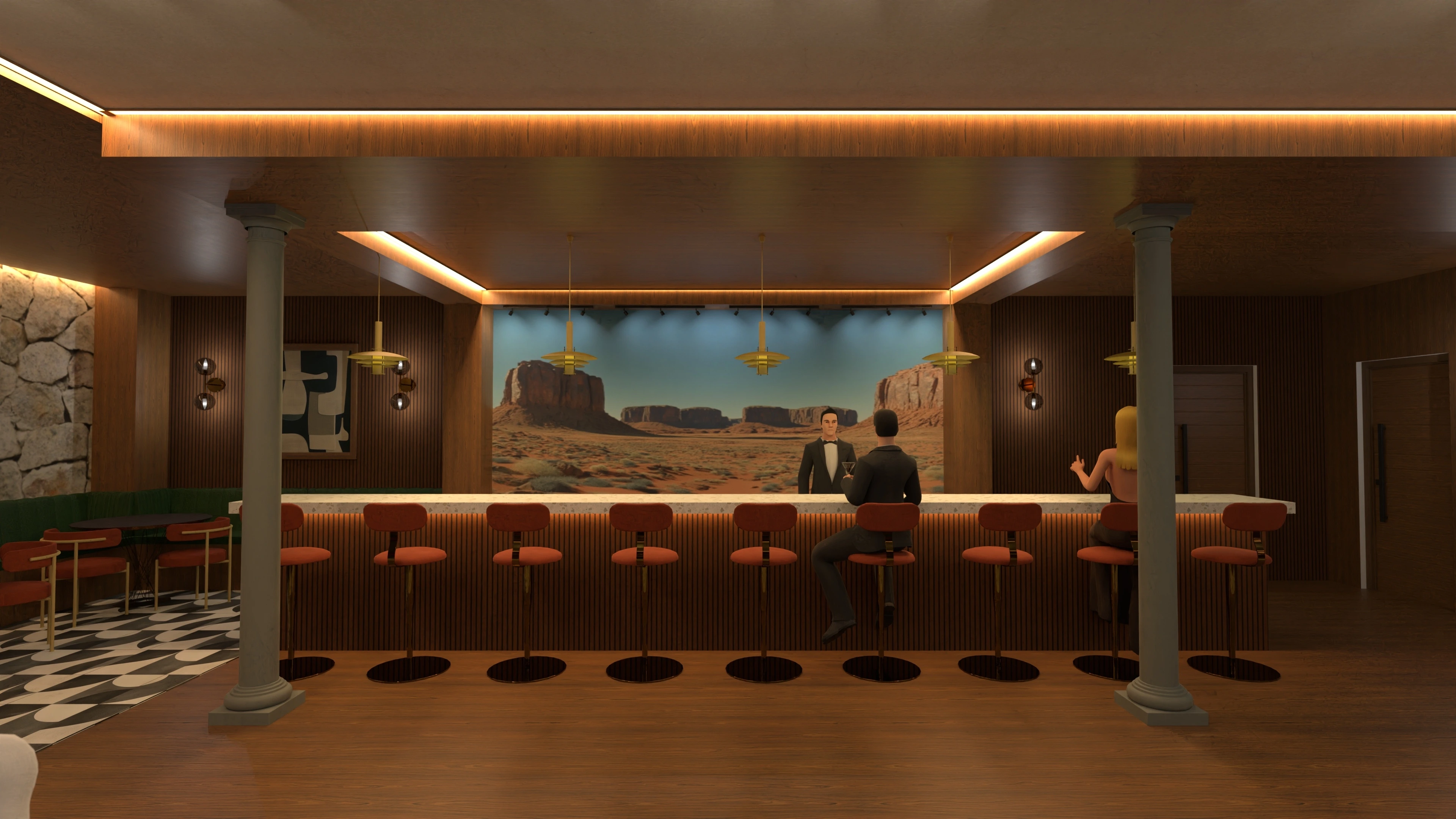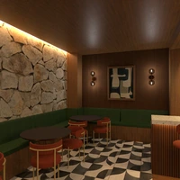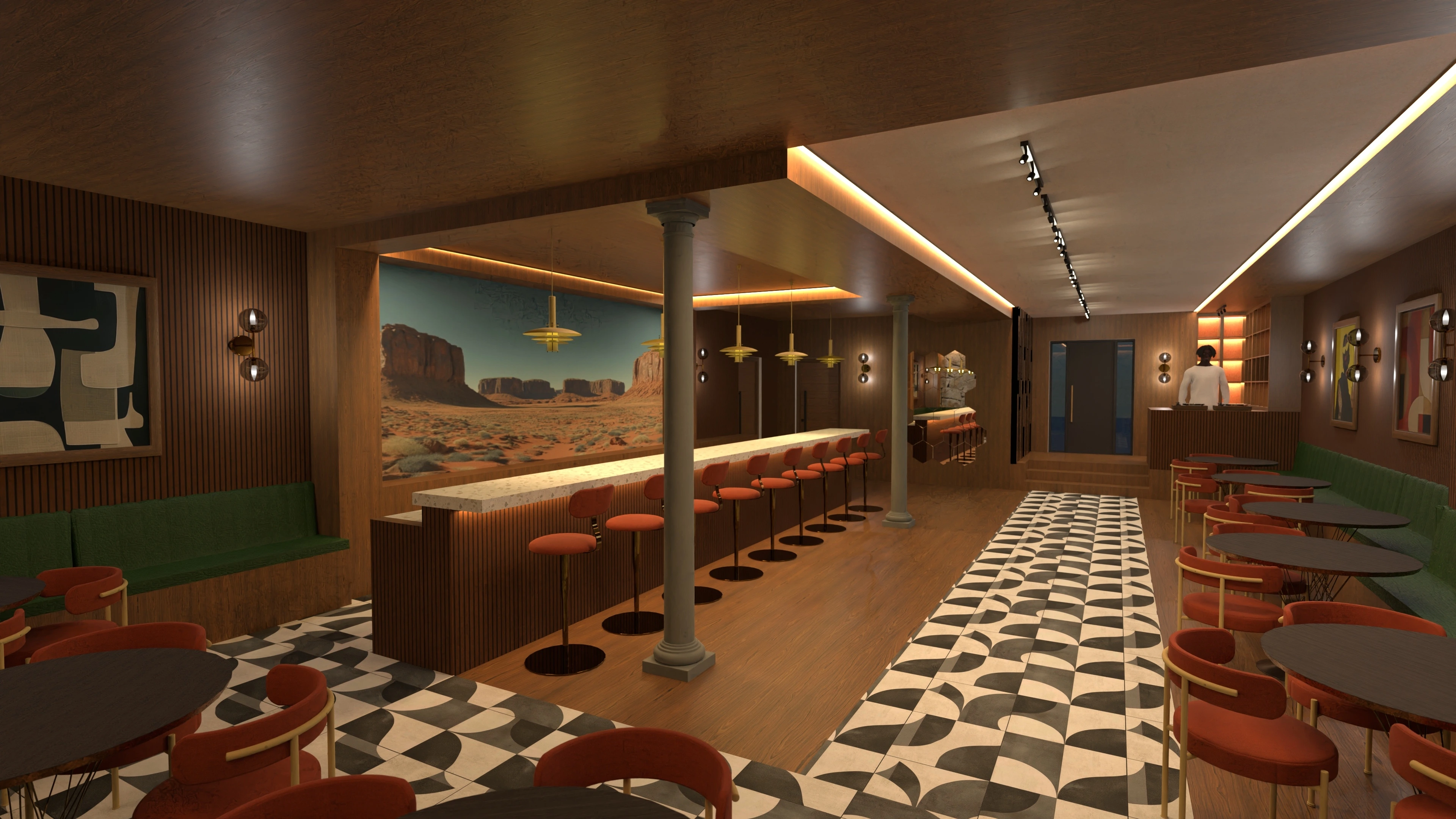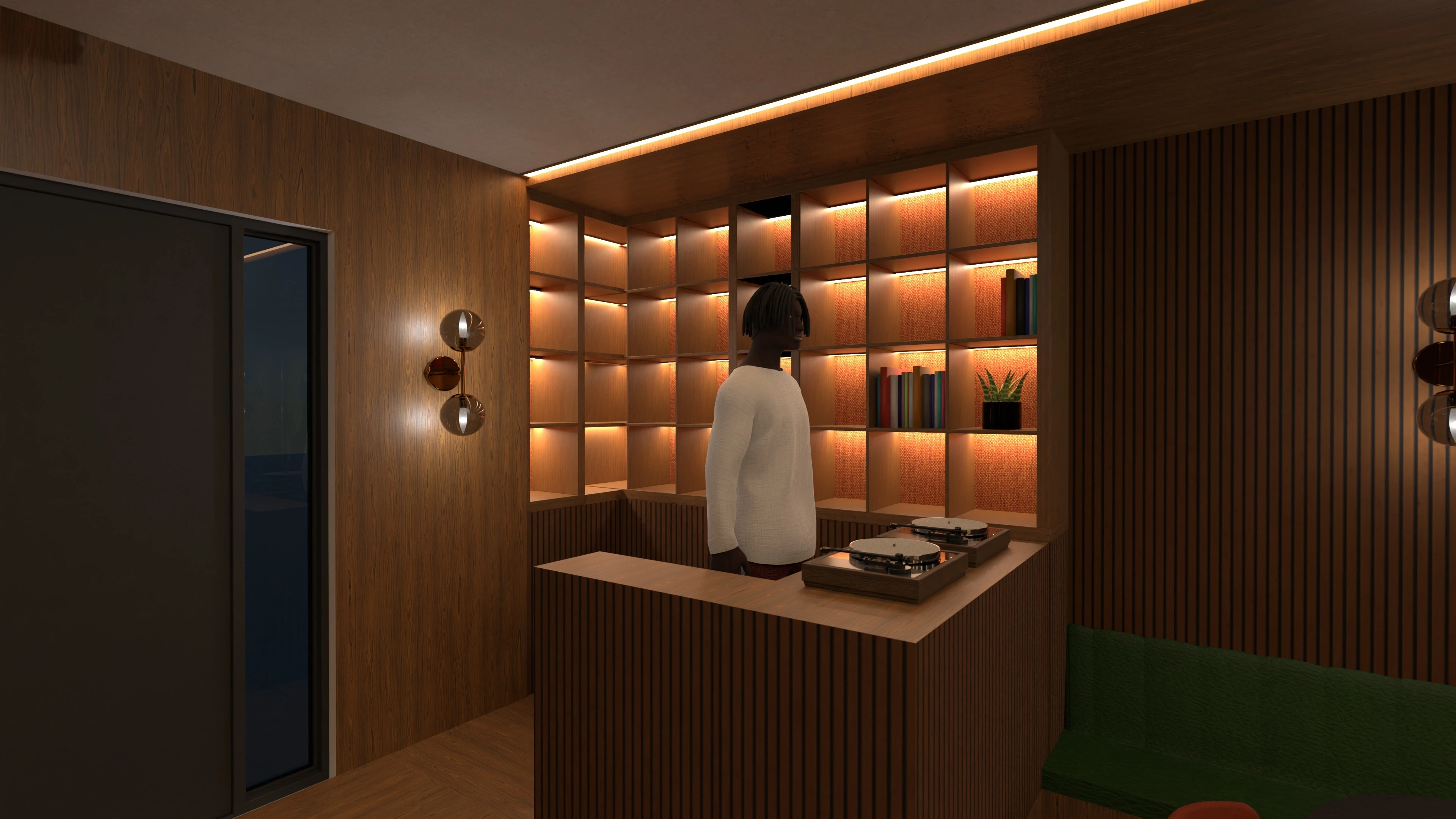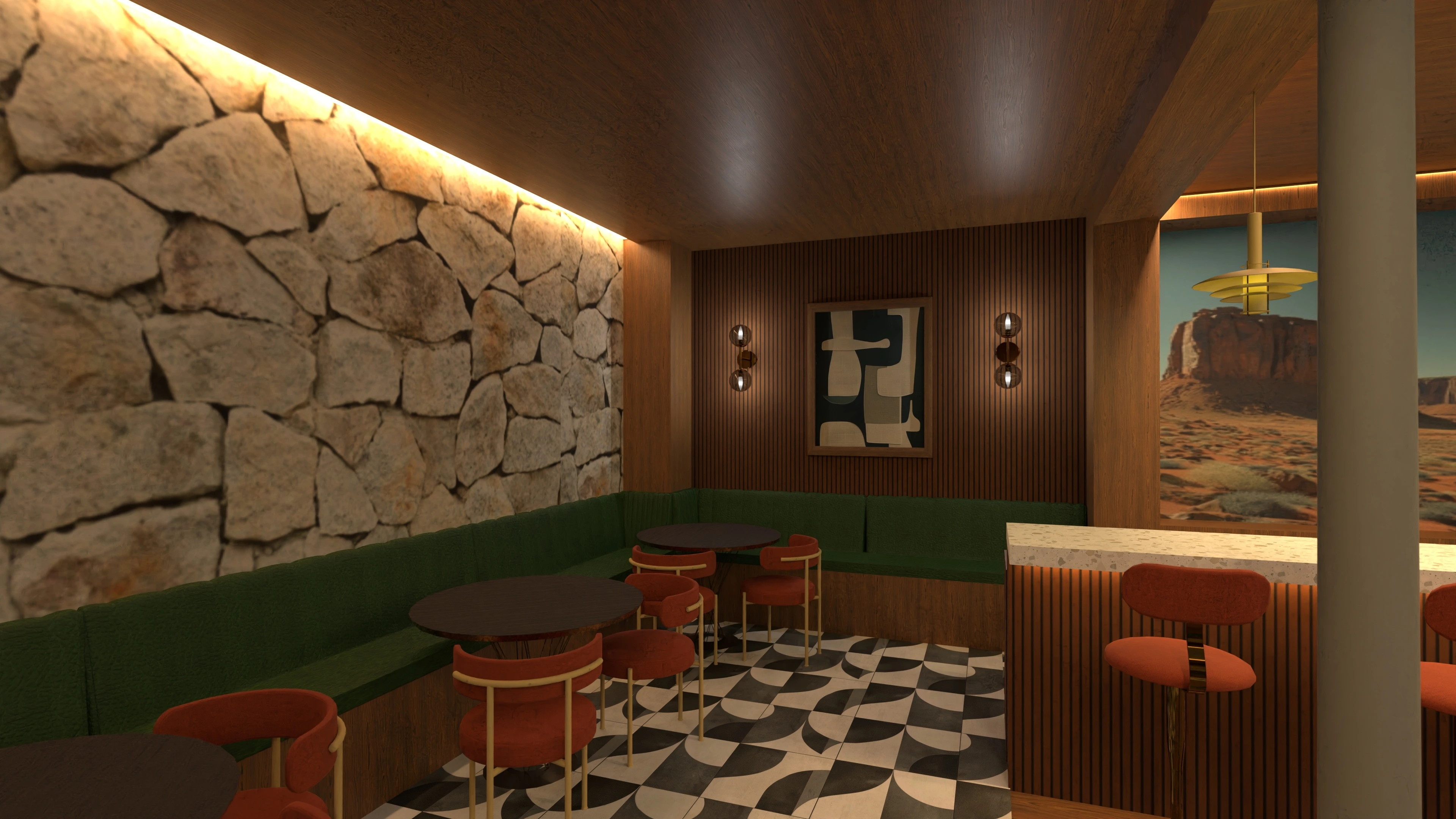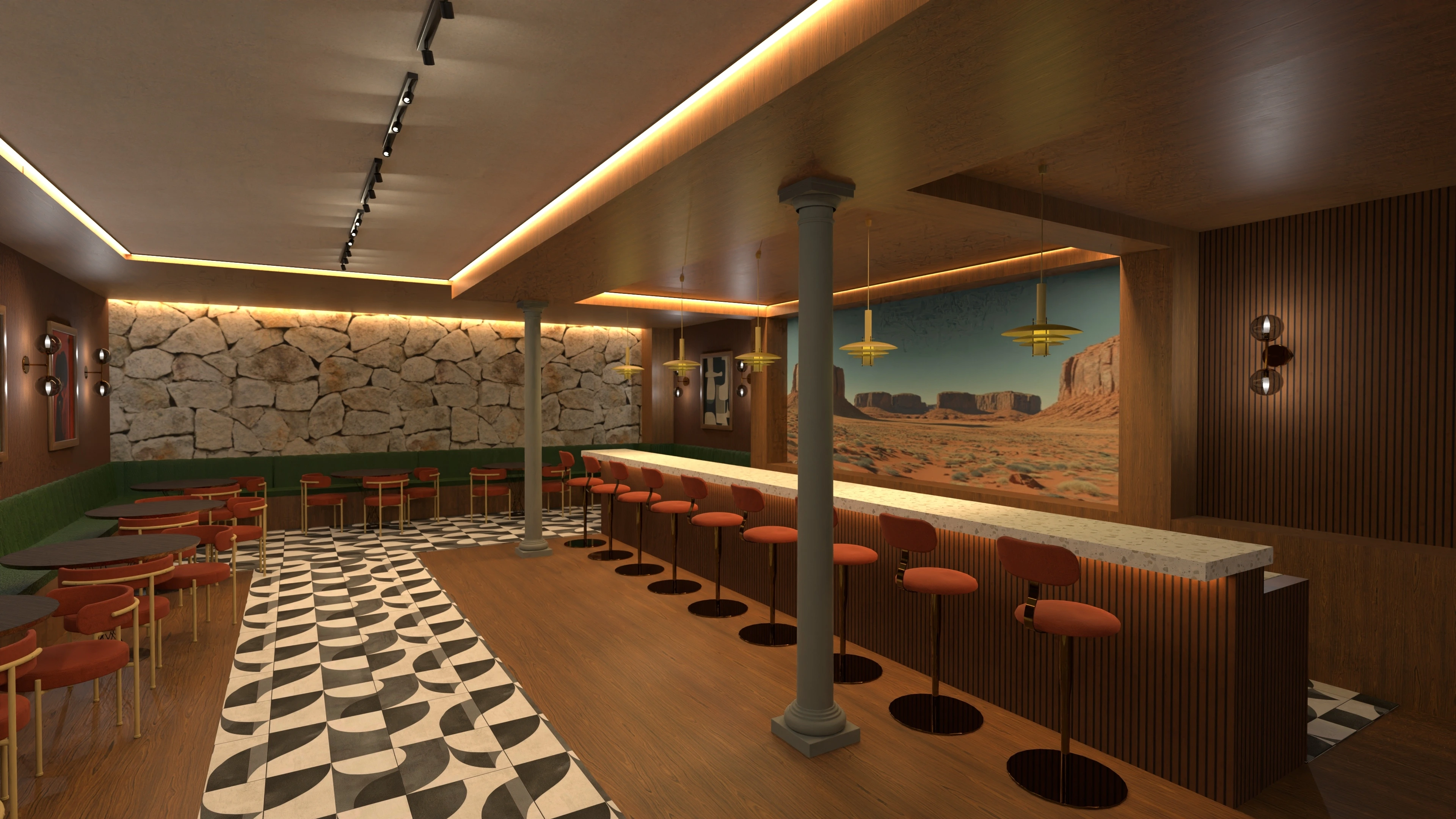 Vinyl record bar renovation with a 1970s retro style. Warm interior with specific elements, colors and materials that were popular in the 70s and will transport anyone back to the era of disco.
