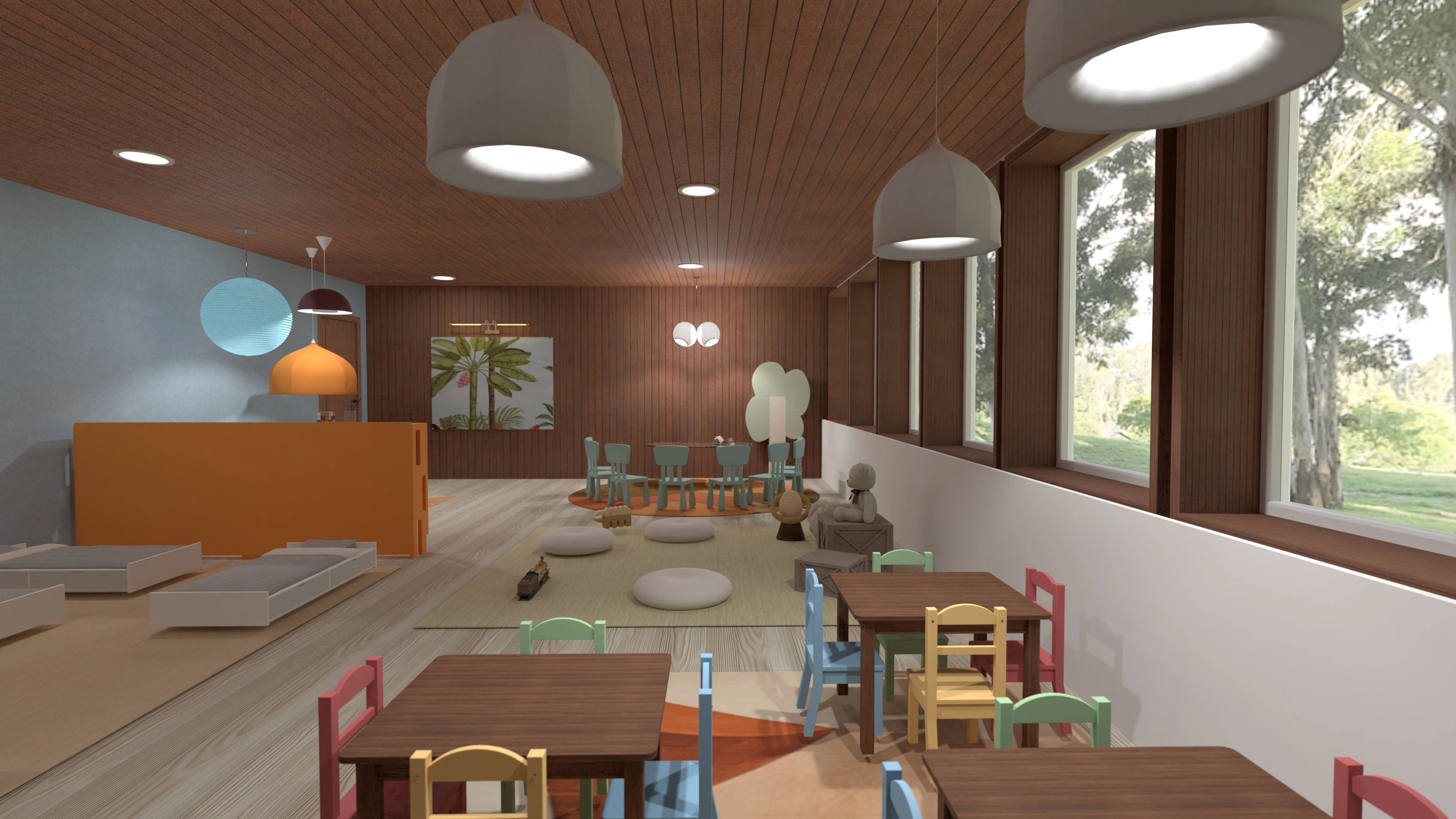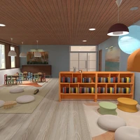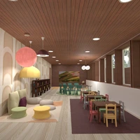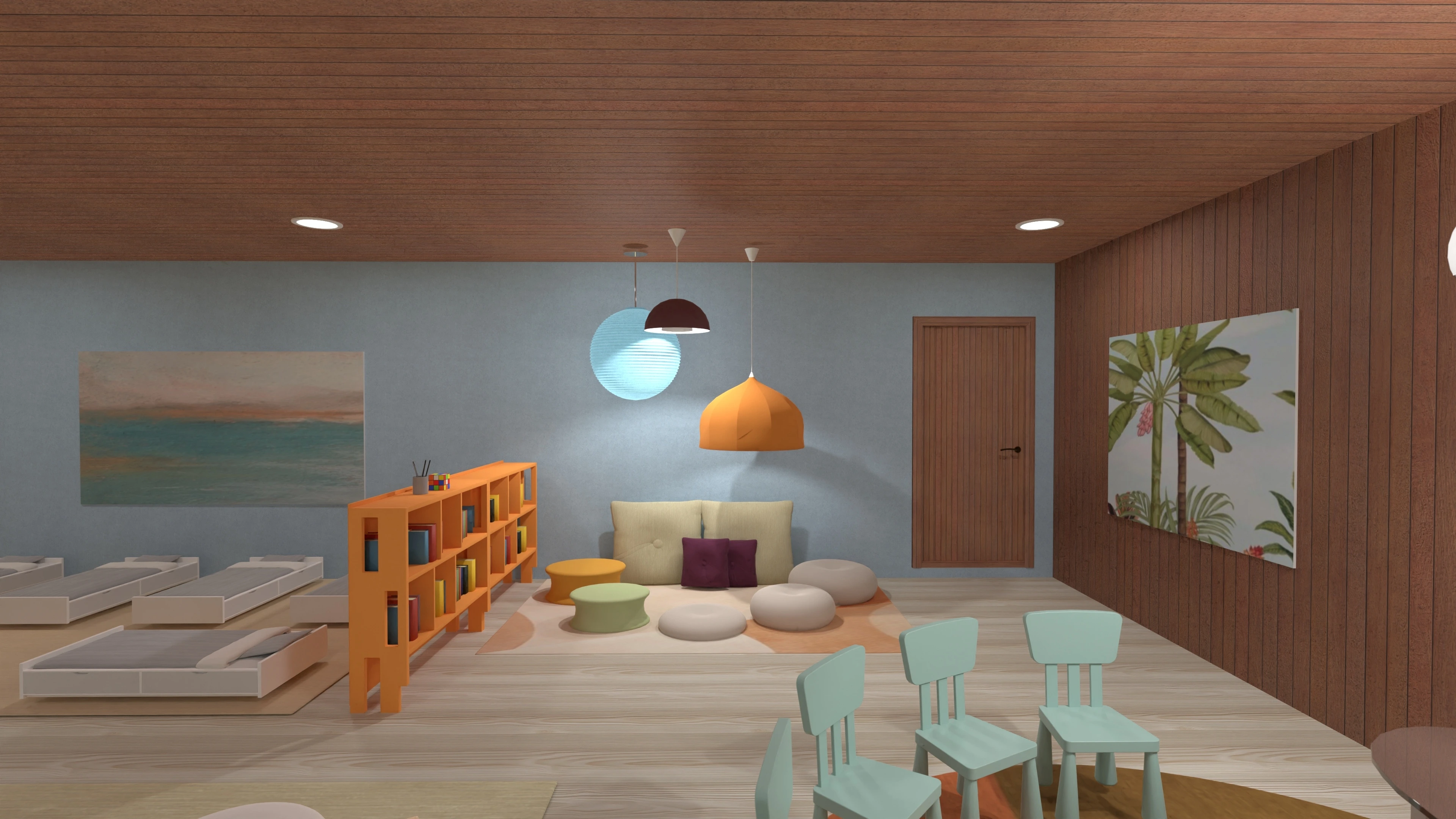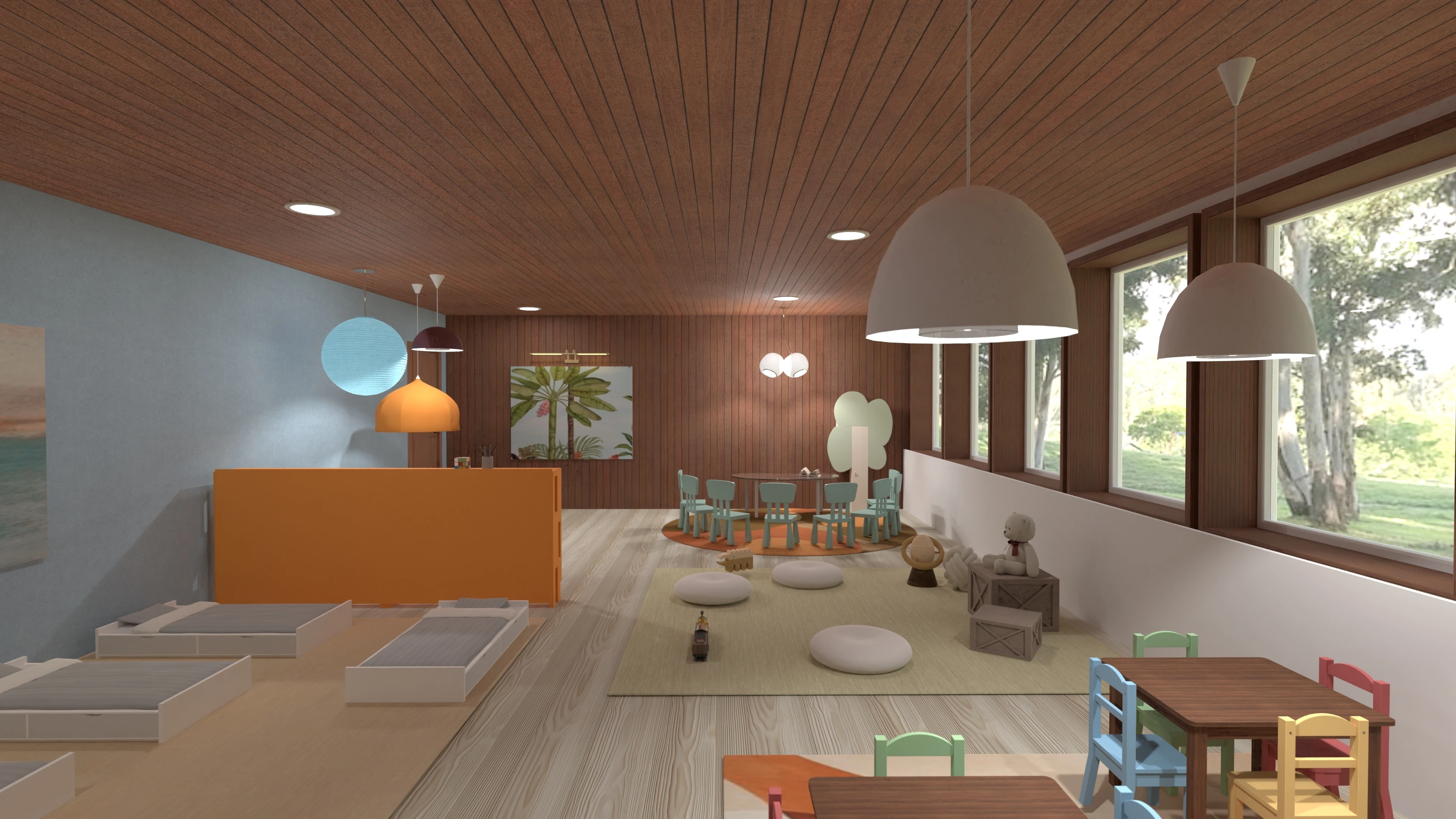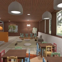 Proposal for turning an old church into a pre-school, while preserving as much of the initial building as possible. Original wood details are complemented by warm colors and playful elements