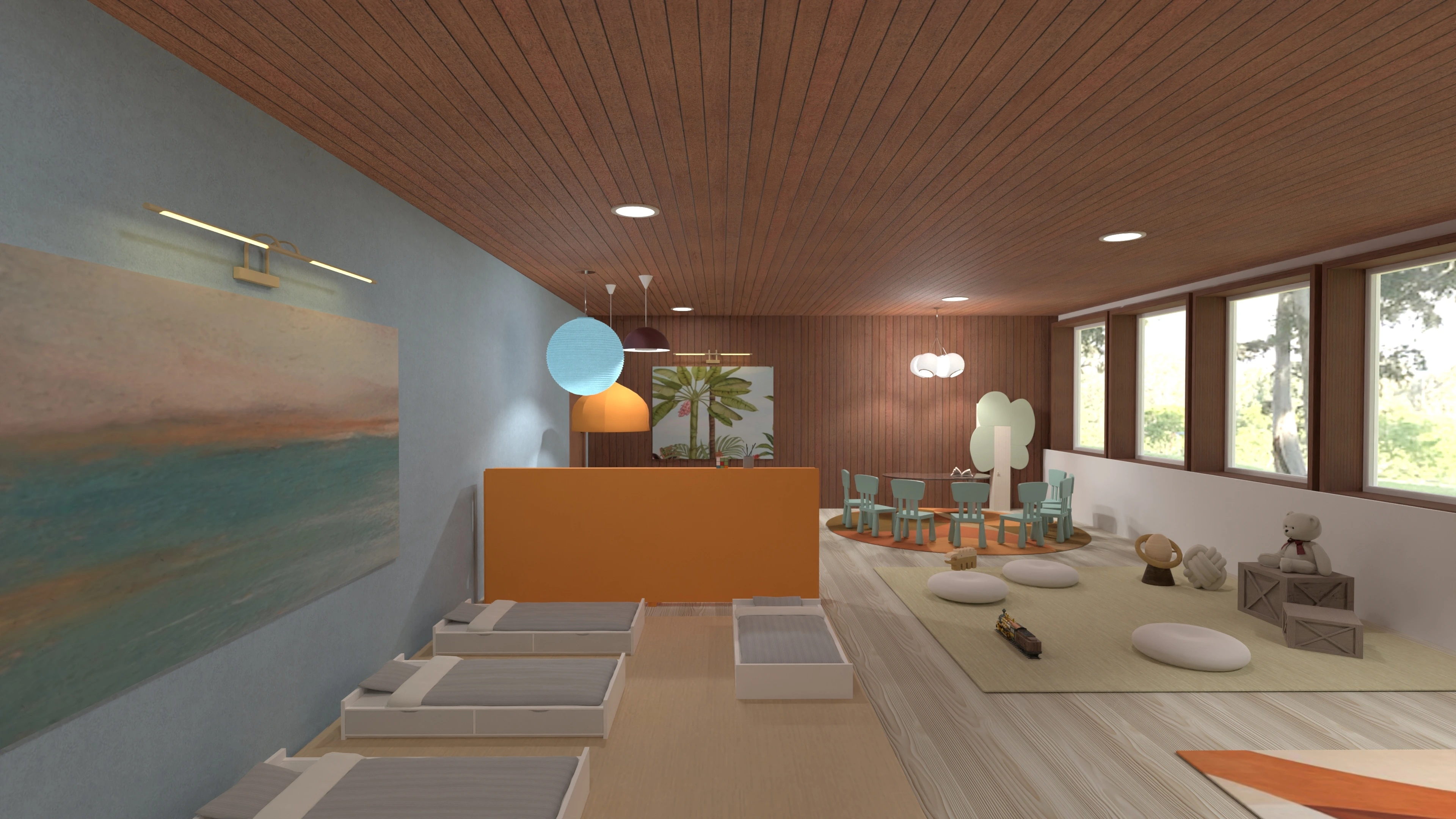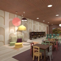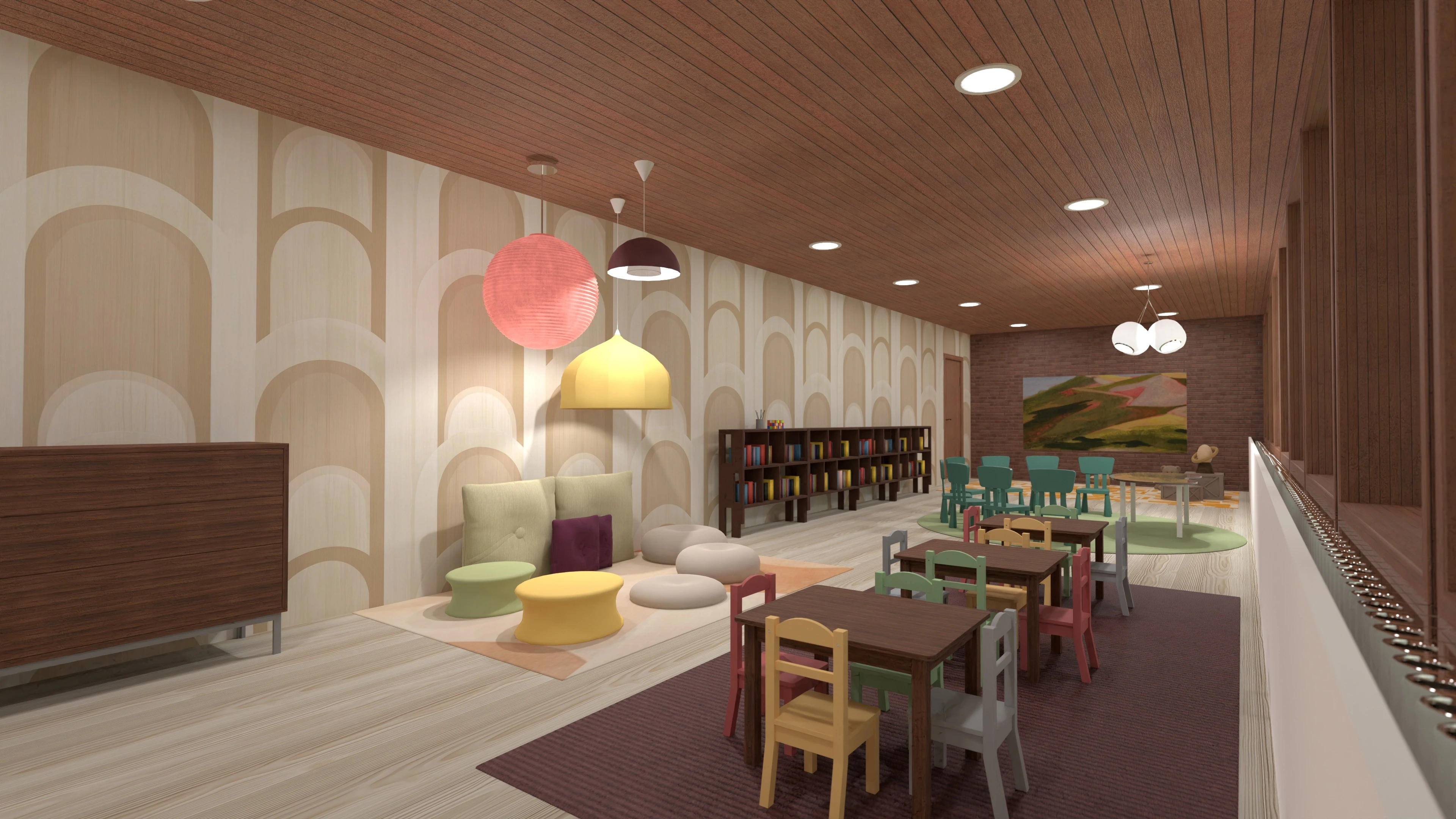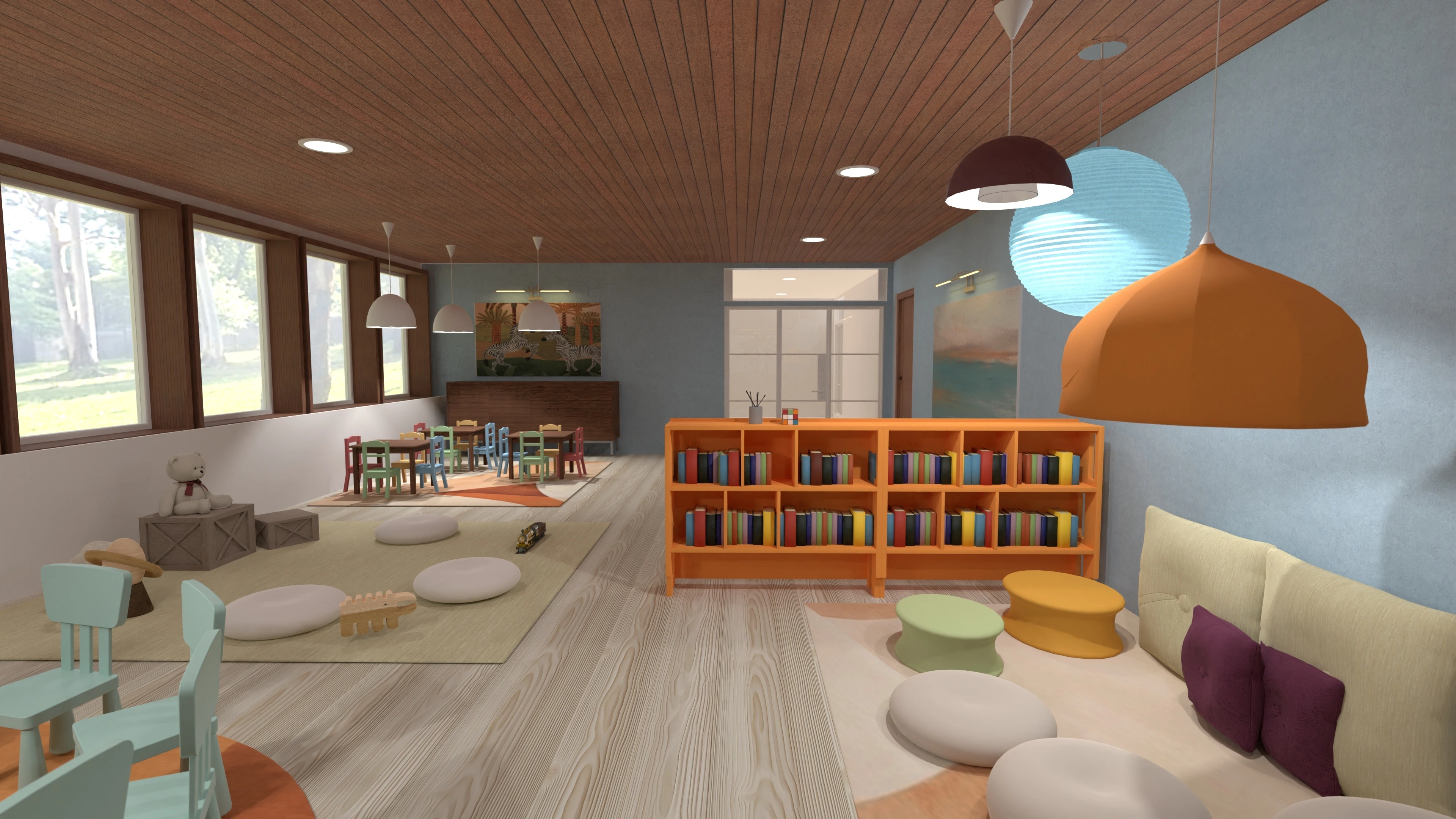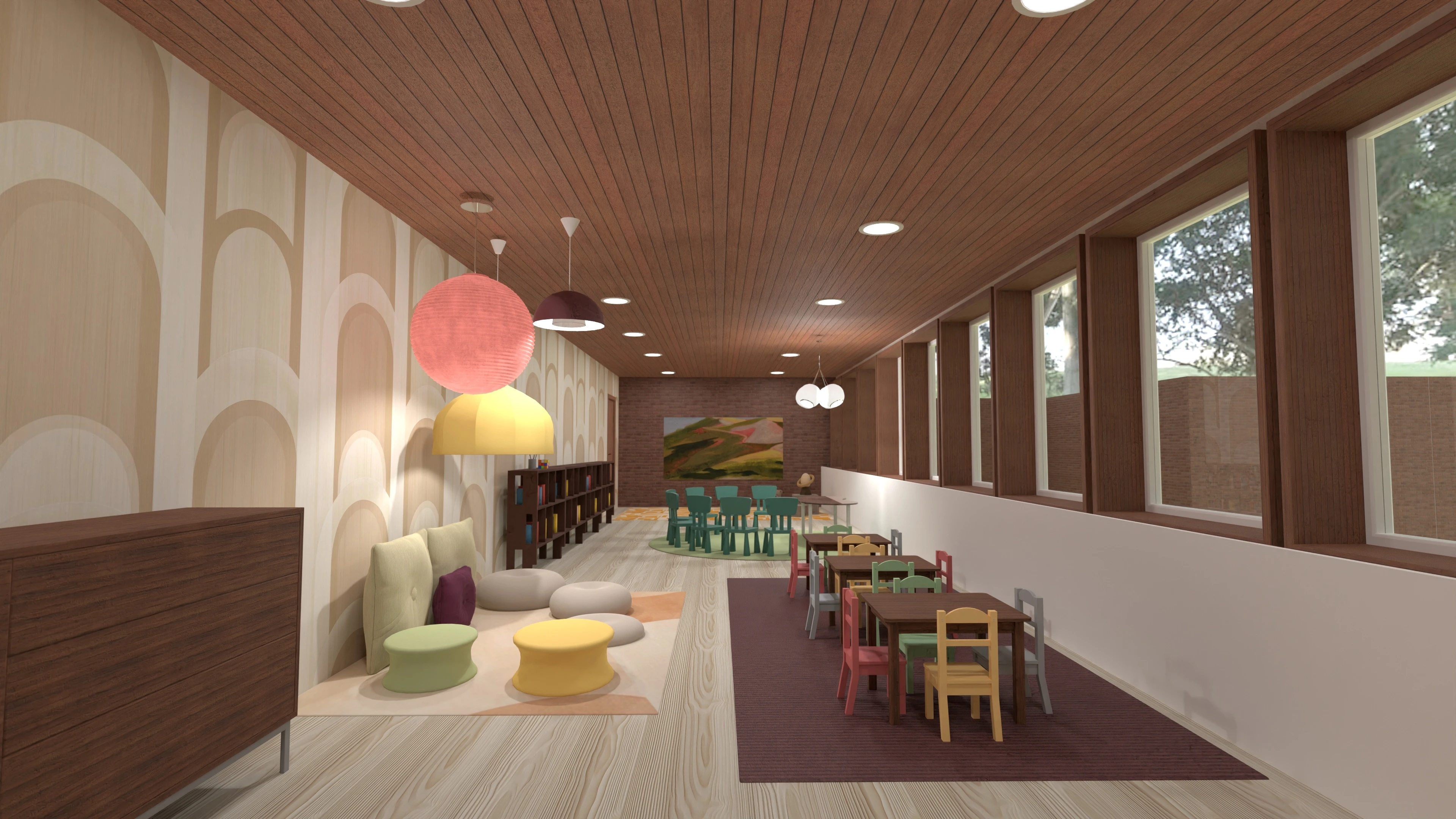 Proposal for turning an old church into a pre-school, while preserving as much of the initial building as possible. Original wood details are complemented by warm colors and playful elements