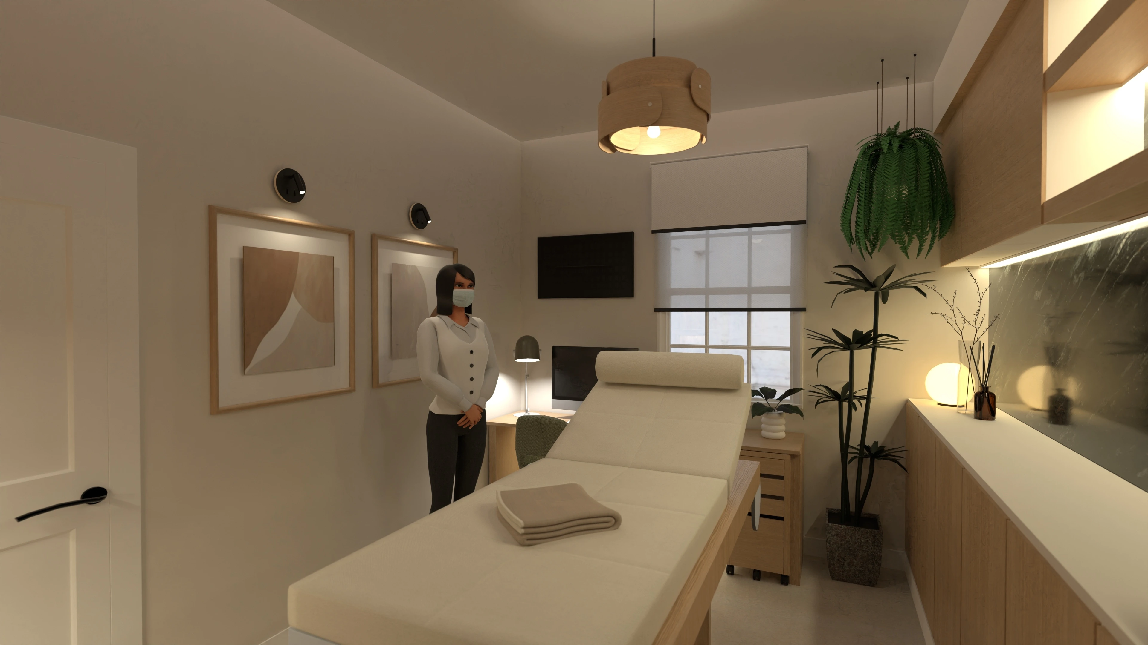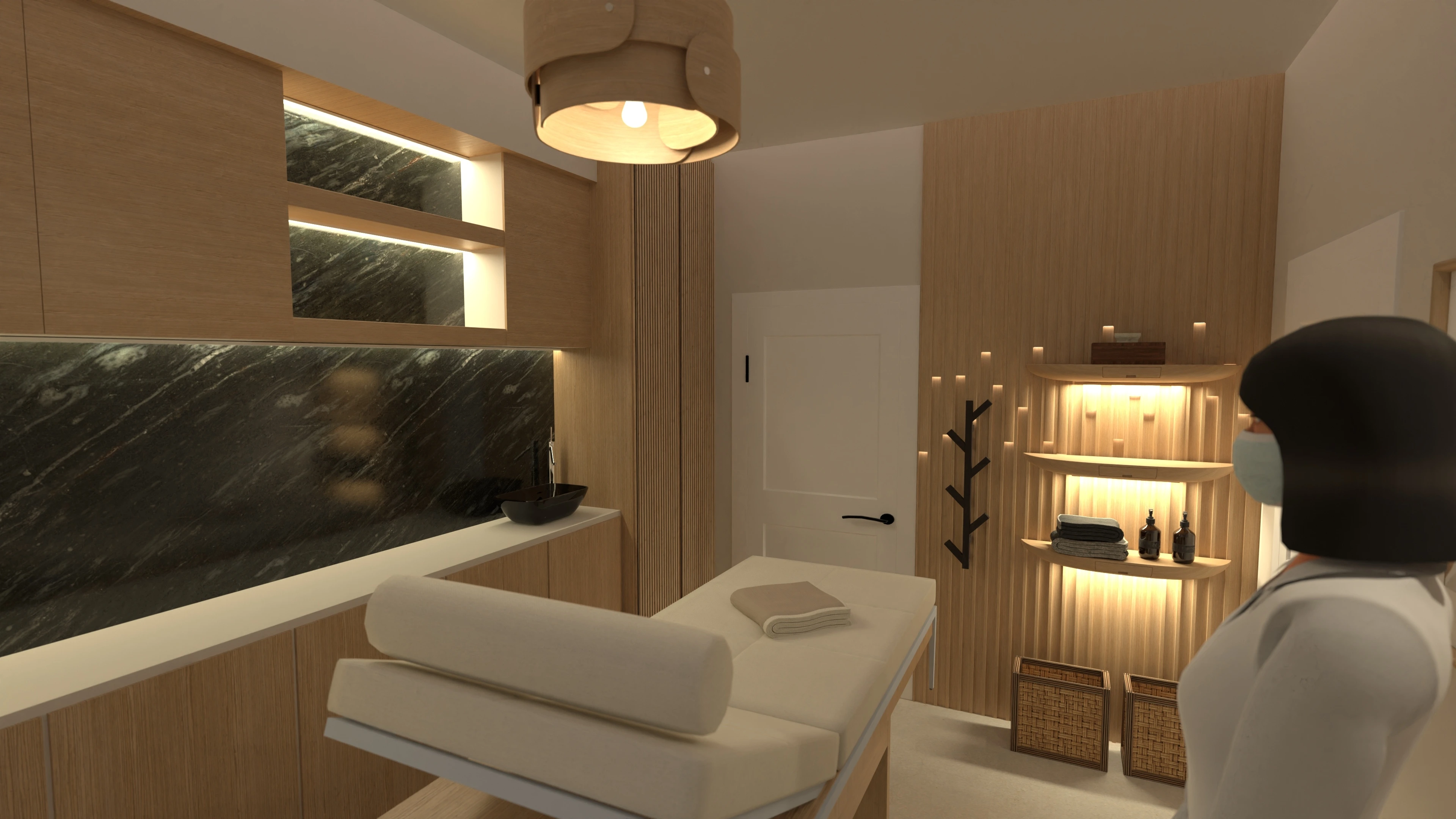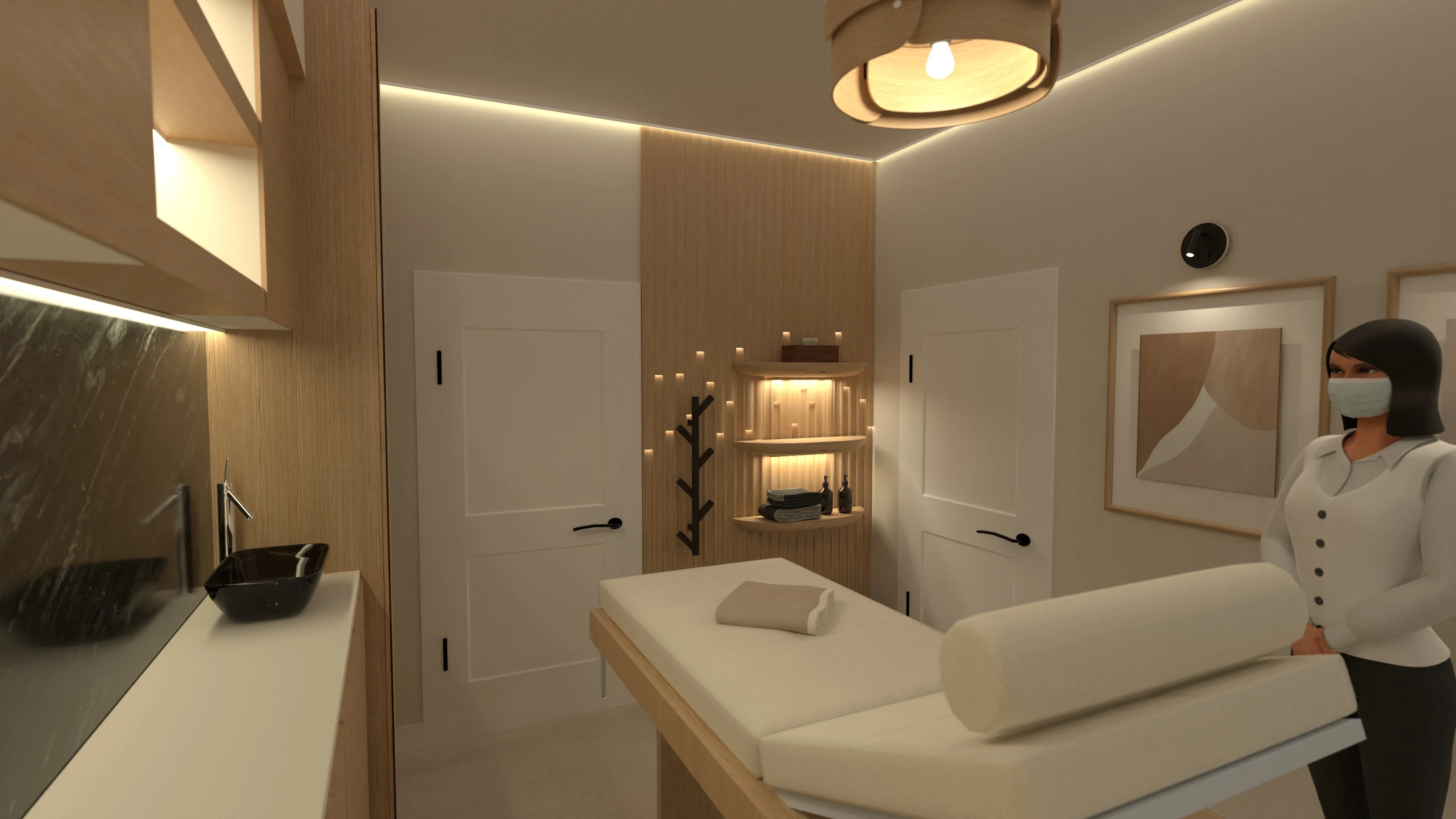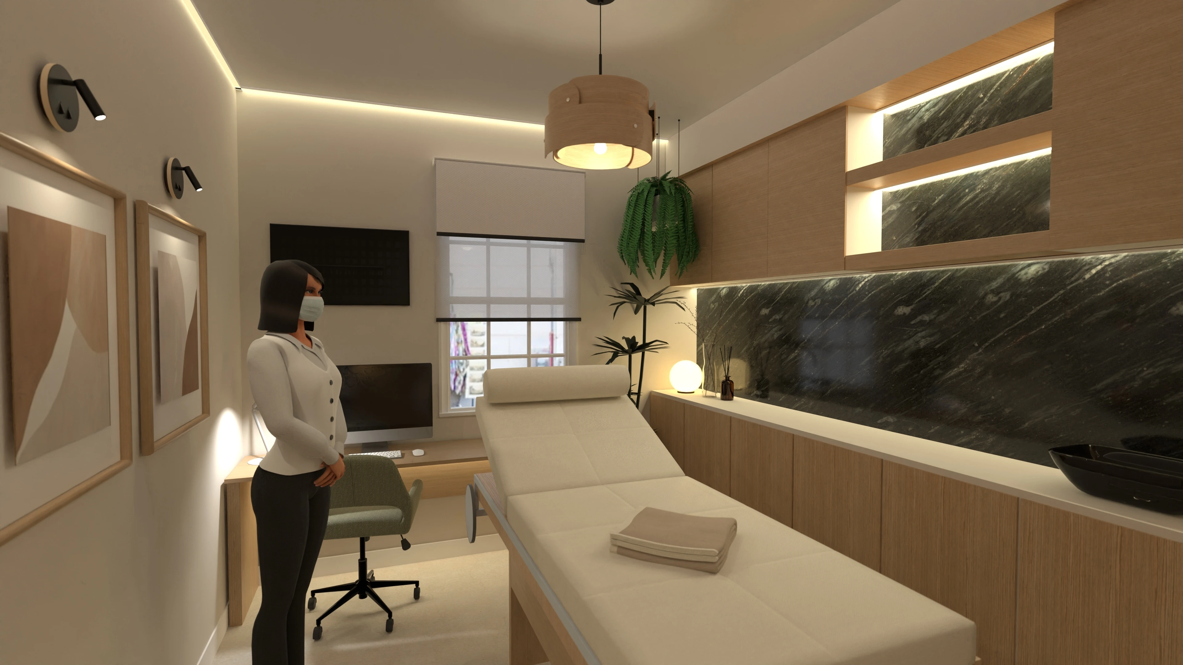Small beauty treatment clinic design, with soft layered lighting, light wood and dark stone for contrast.