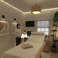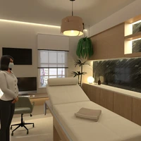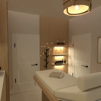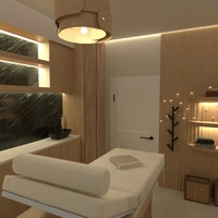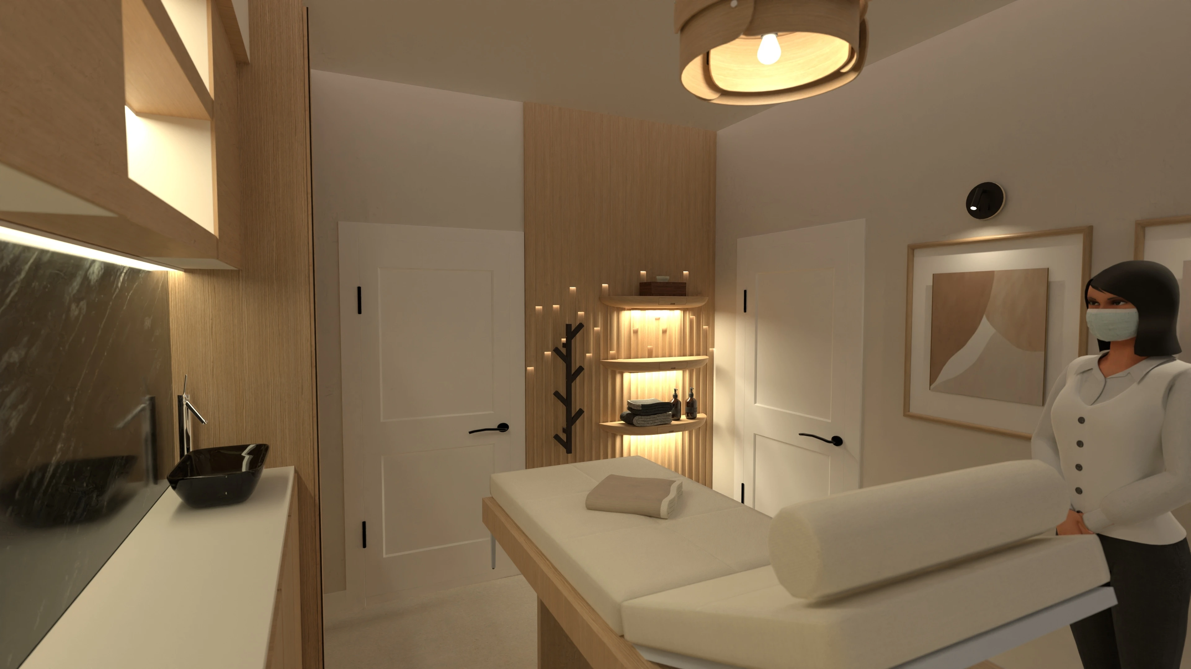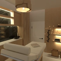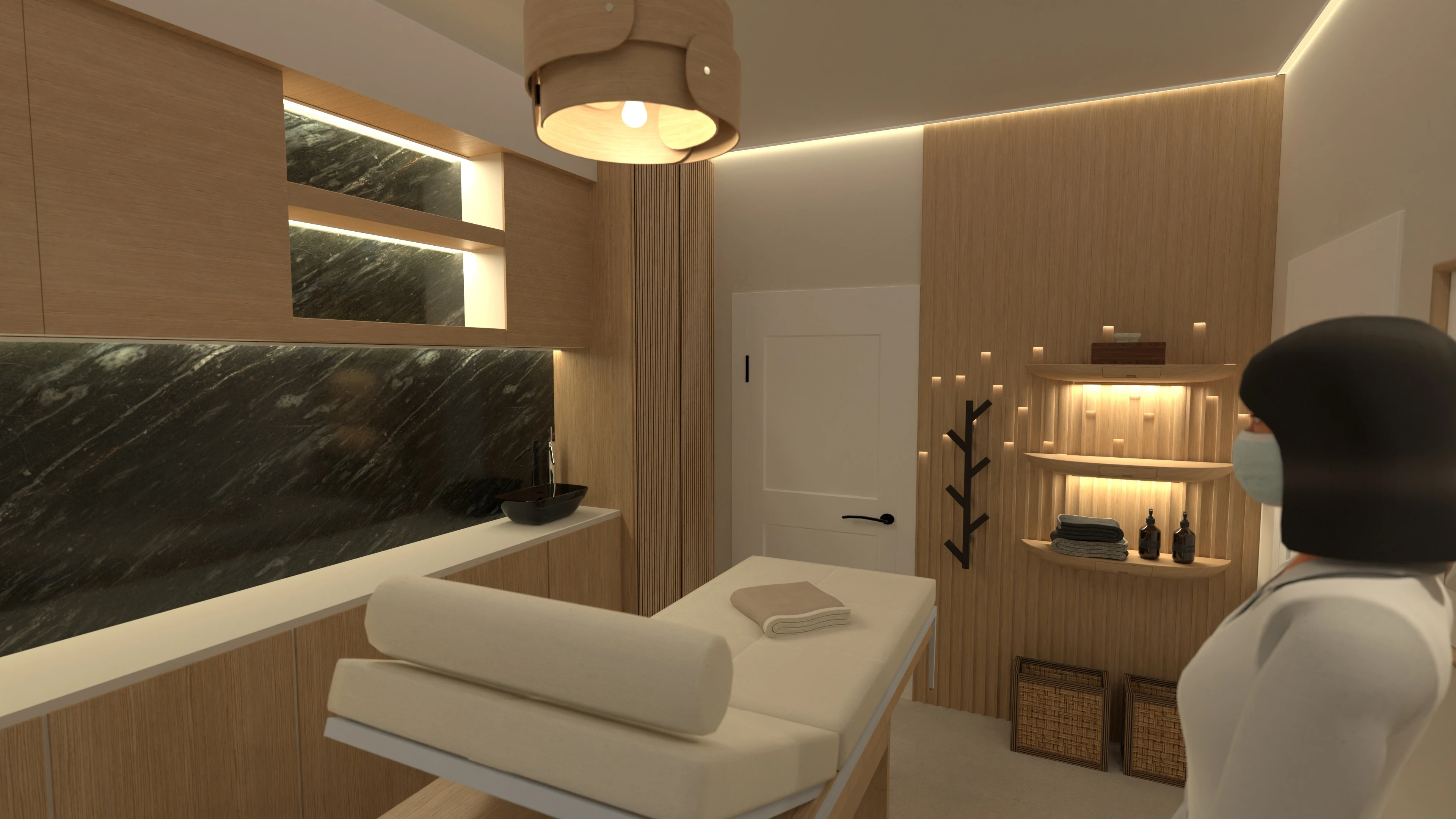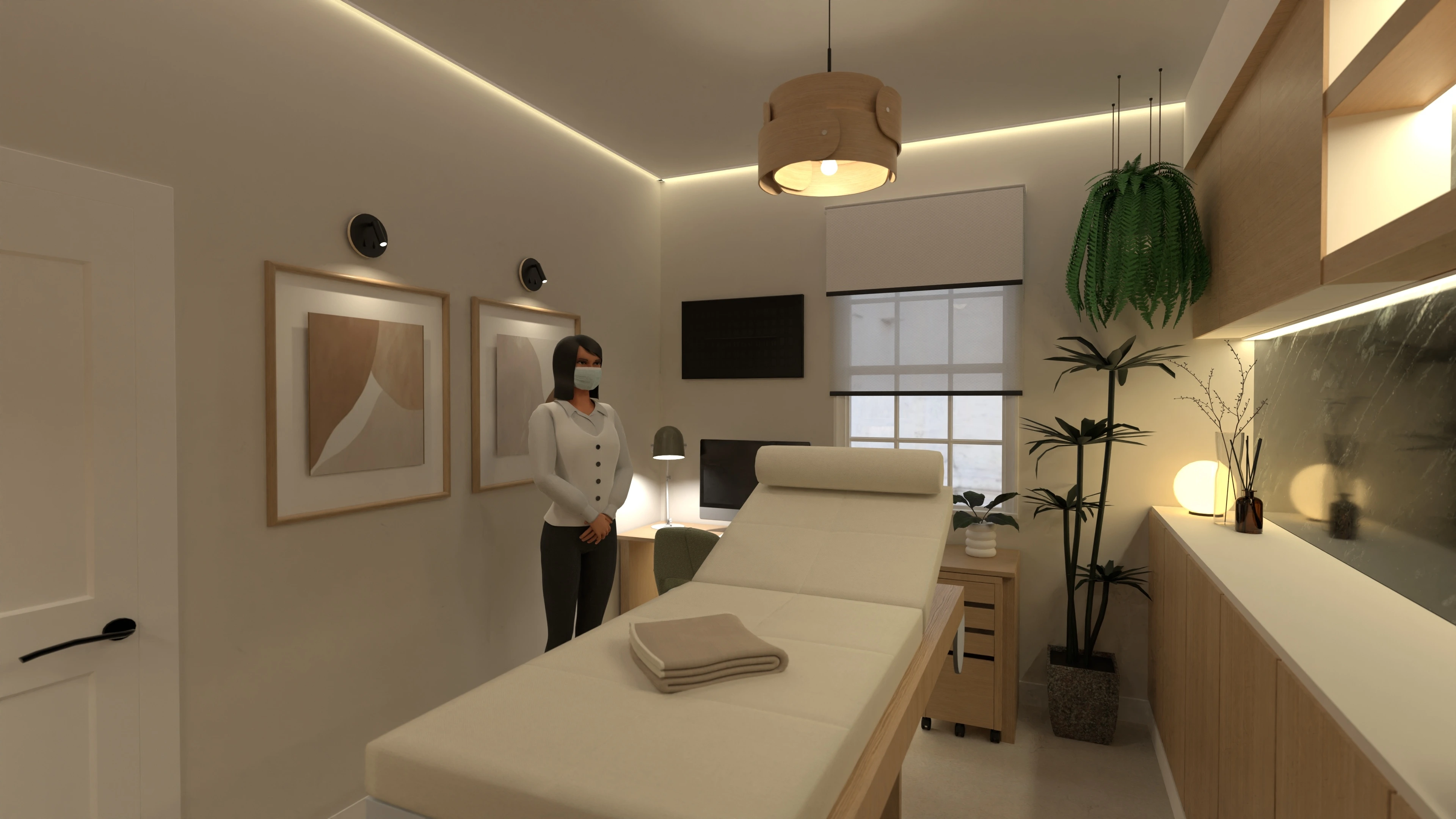 Small beauty treatment clinic design, with soft layered lighting, light wood and dark stone for contrast.