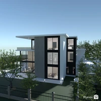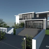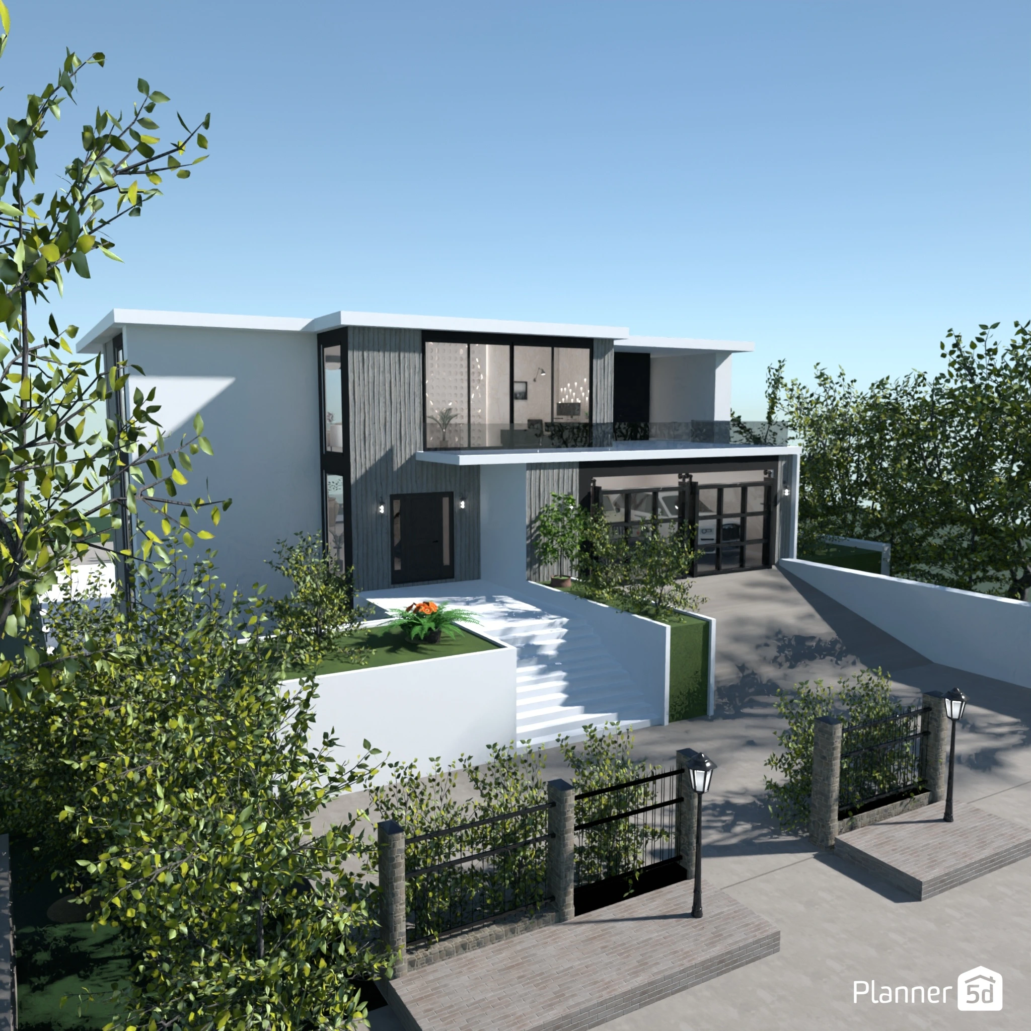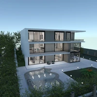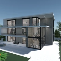 Three-story villa with clean linear geometry and cantilevered slabs. A Pure White base is contrasted with vertical wood-textured panels, stone accents, and Charcoal Black glazing frames. A double-height glass corner with exposed staircase becomes the architectural focal point. Expansive terraces and full-height windows open toward landscaped grounds, blending transparency with modern elegance.