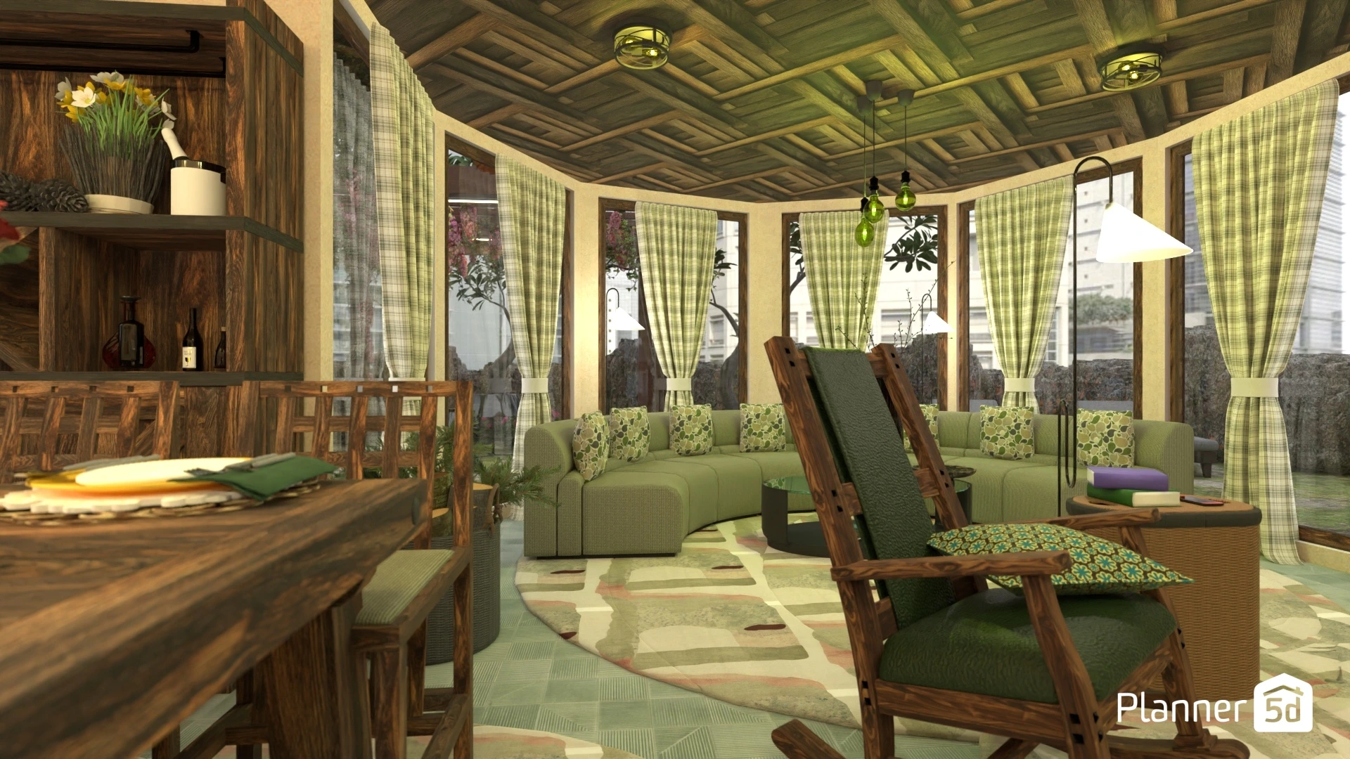 comedor salón con terraza estilo moderno con acabados rústicos y acentos que evocan a la naturaleza