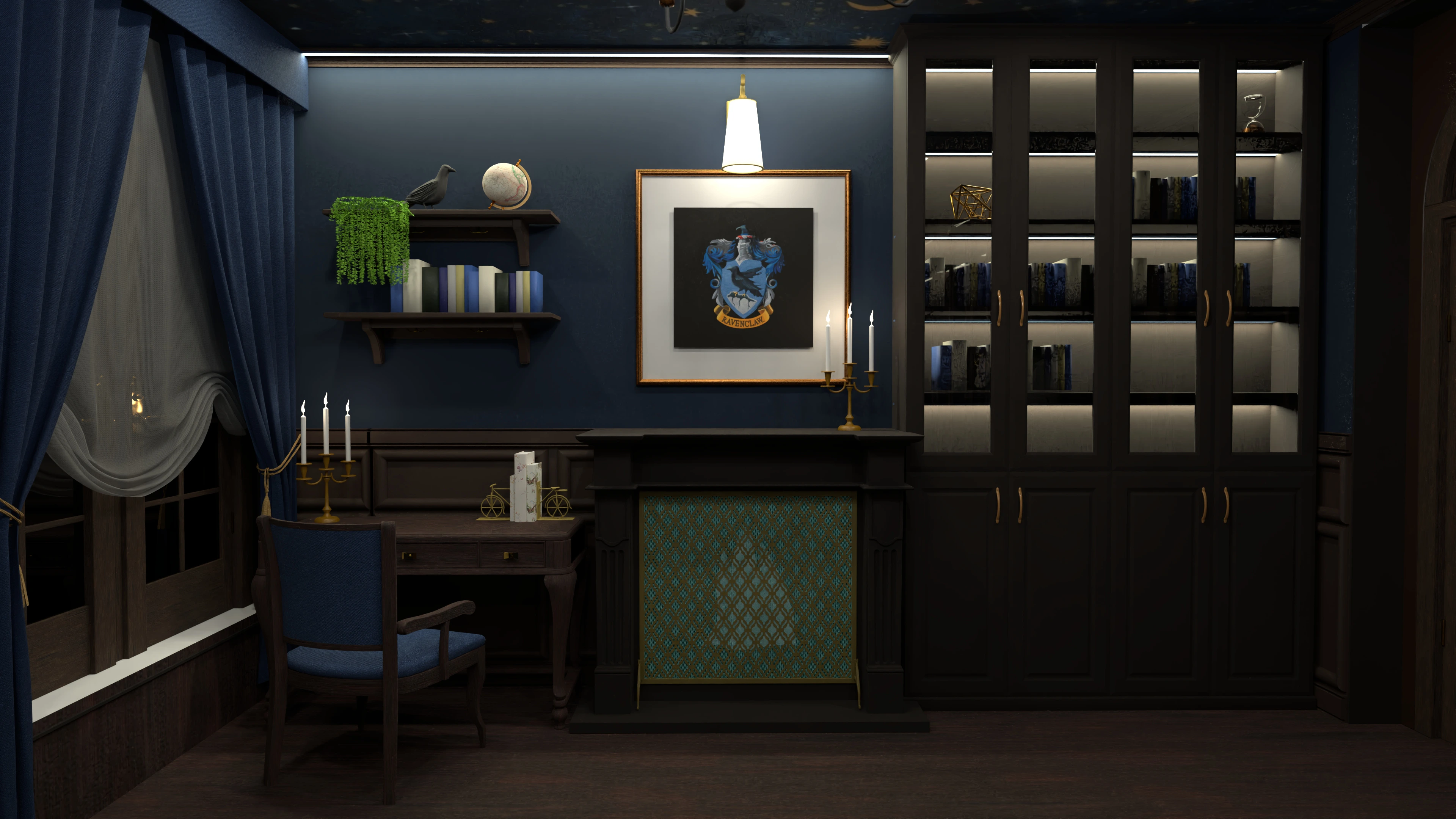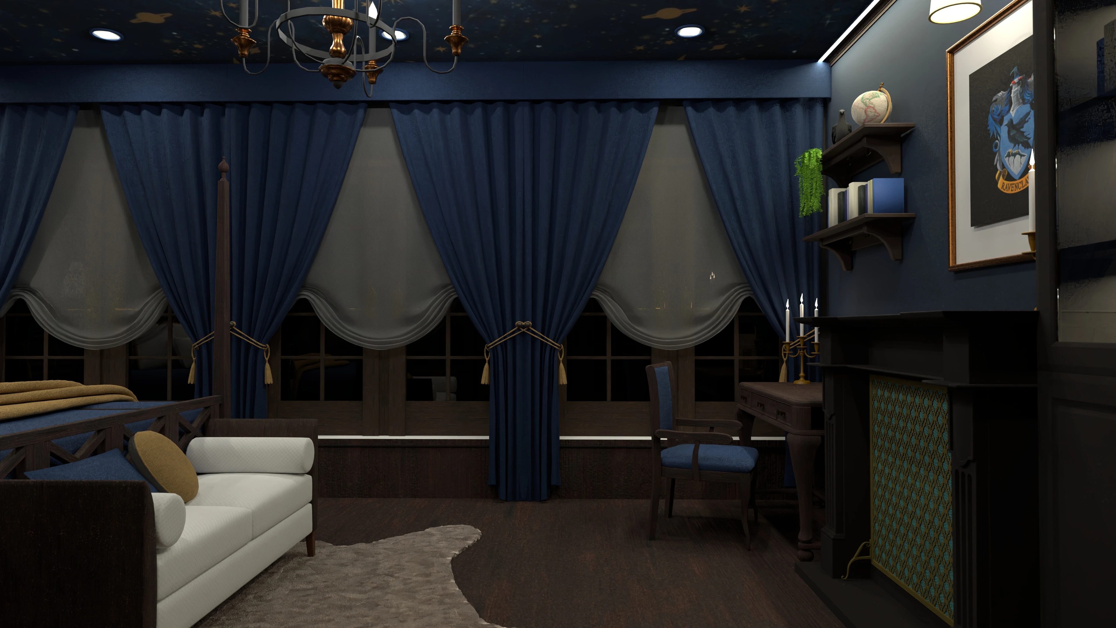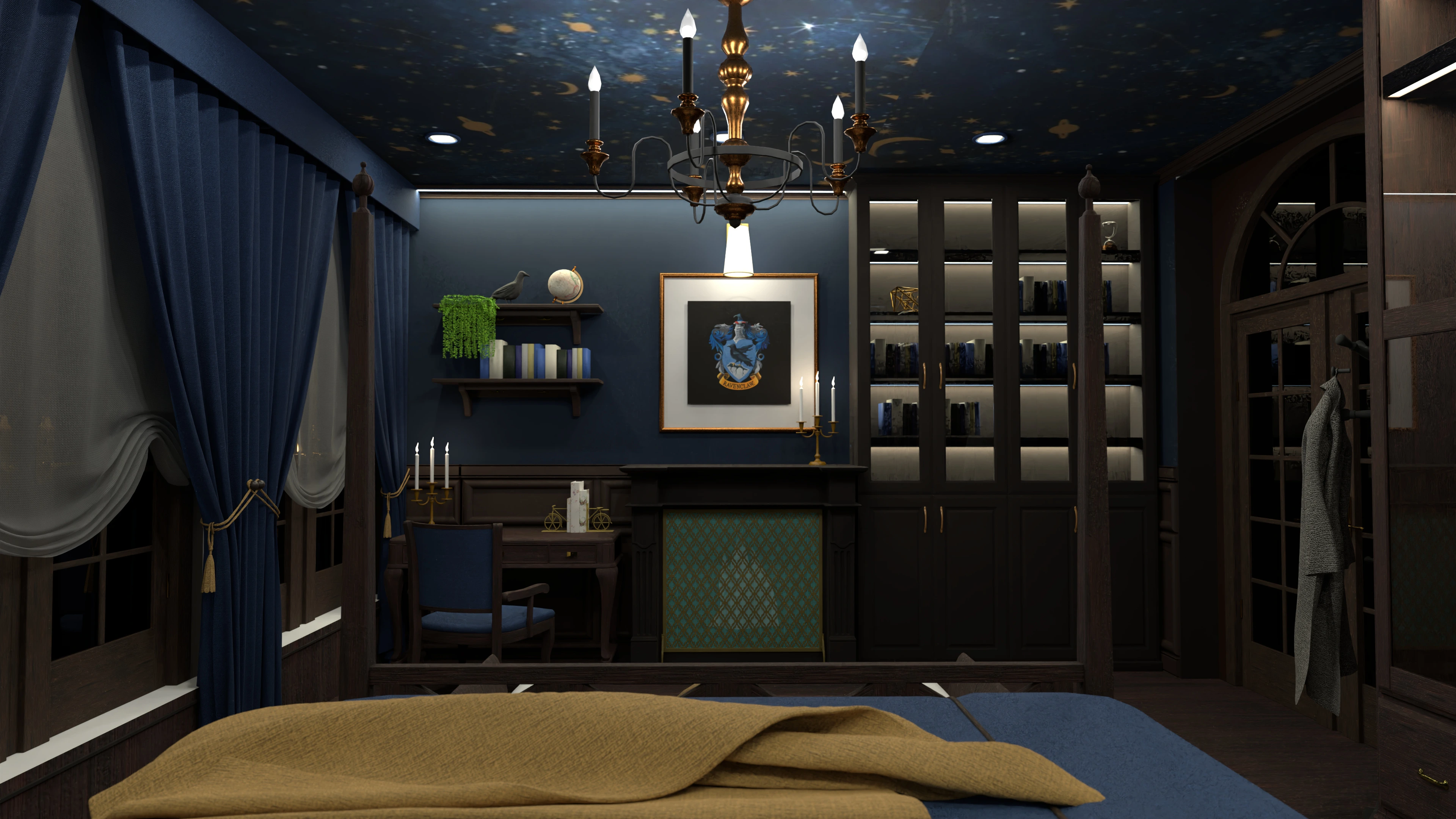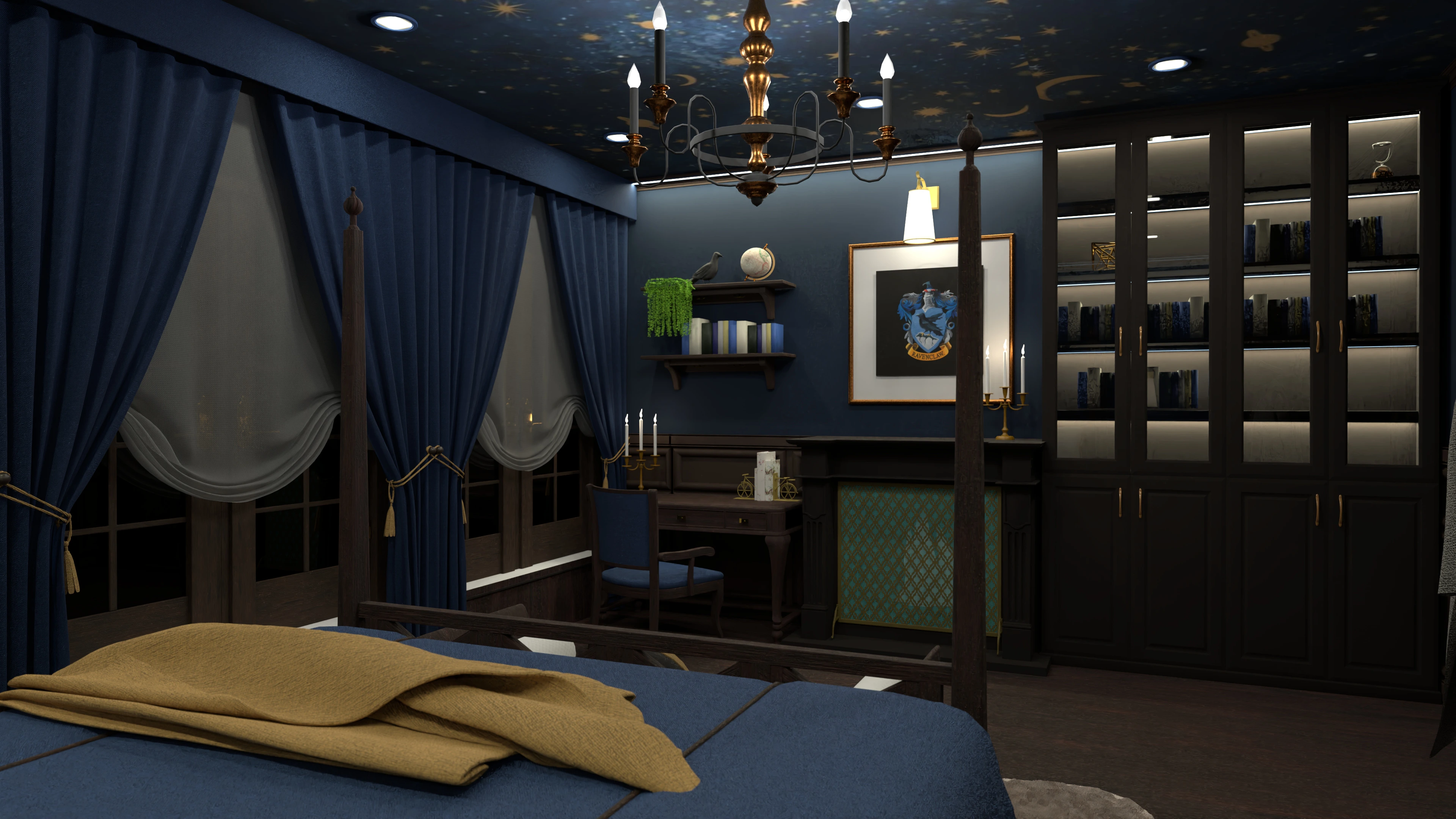 A bedroom inspired on Ravenclaw house from Harry Potter. Lots of dark wood, blue and gold, together with shelving for books, as Ravenclaw's are known for being curious and reading a lot.