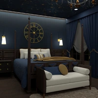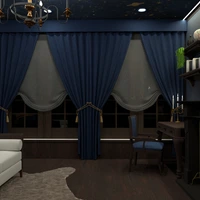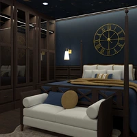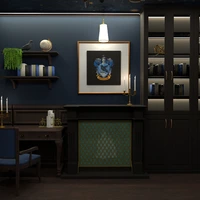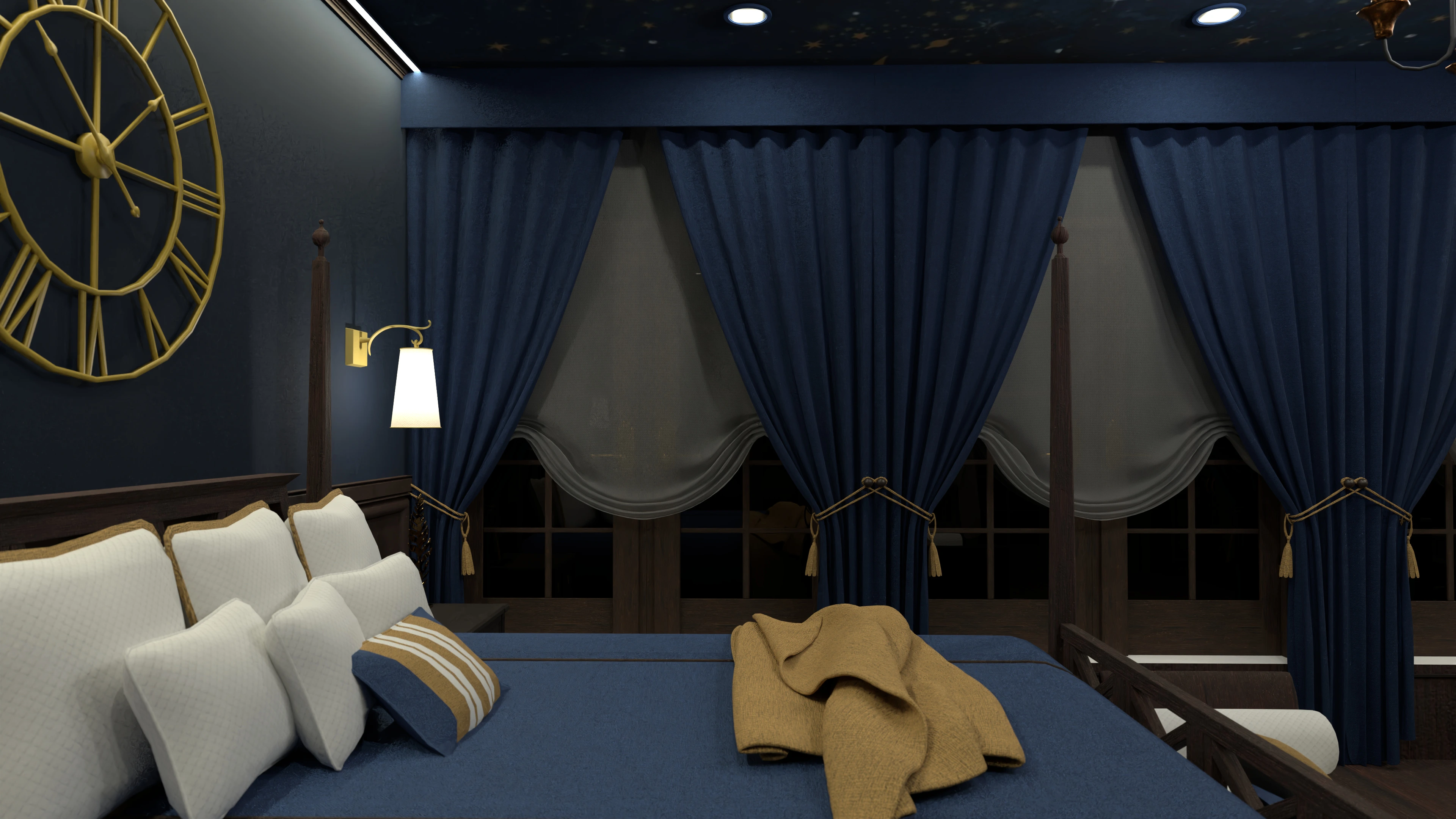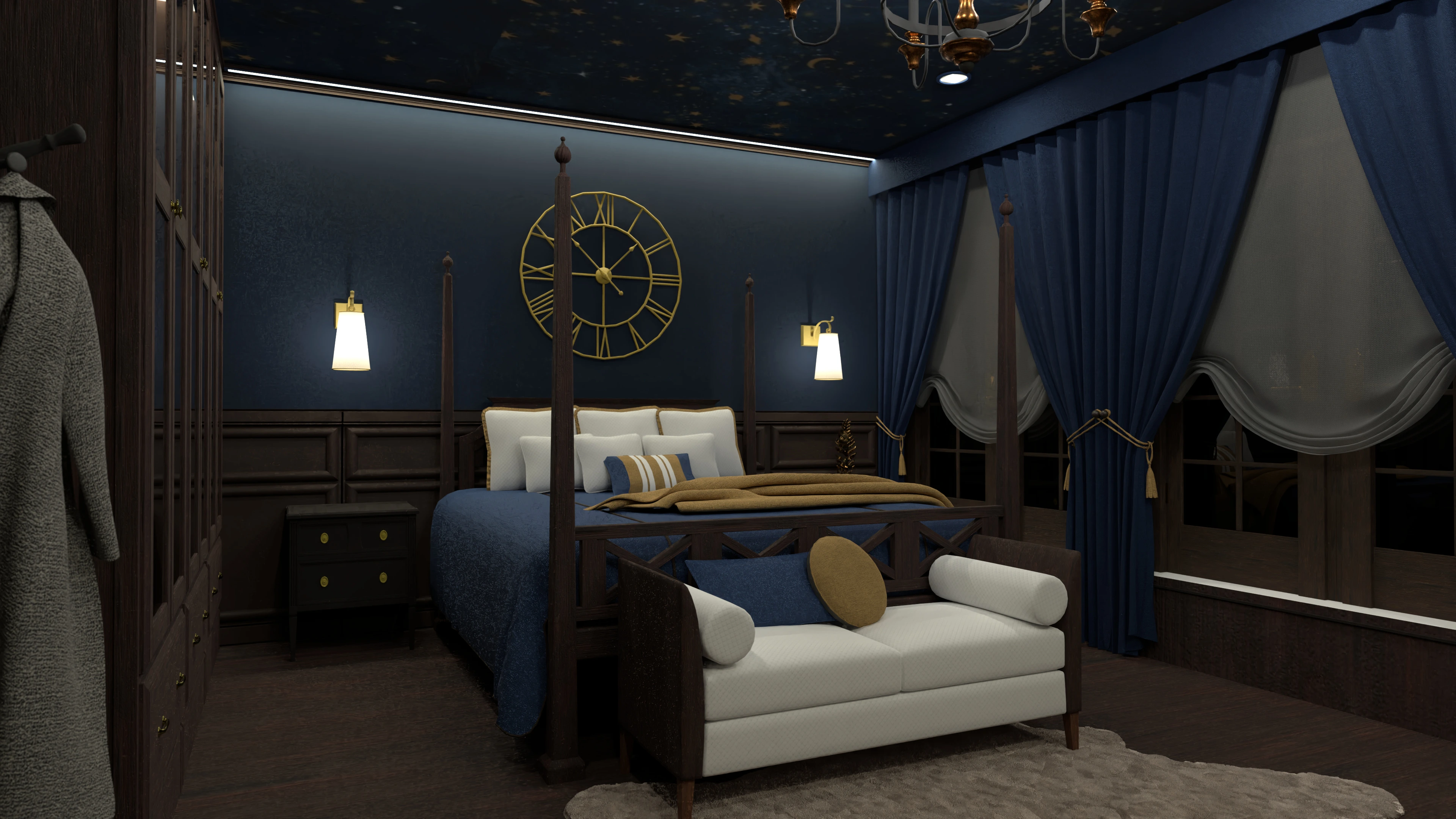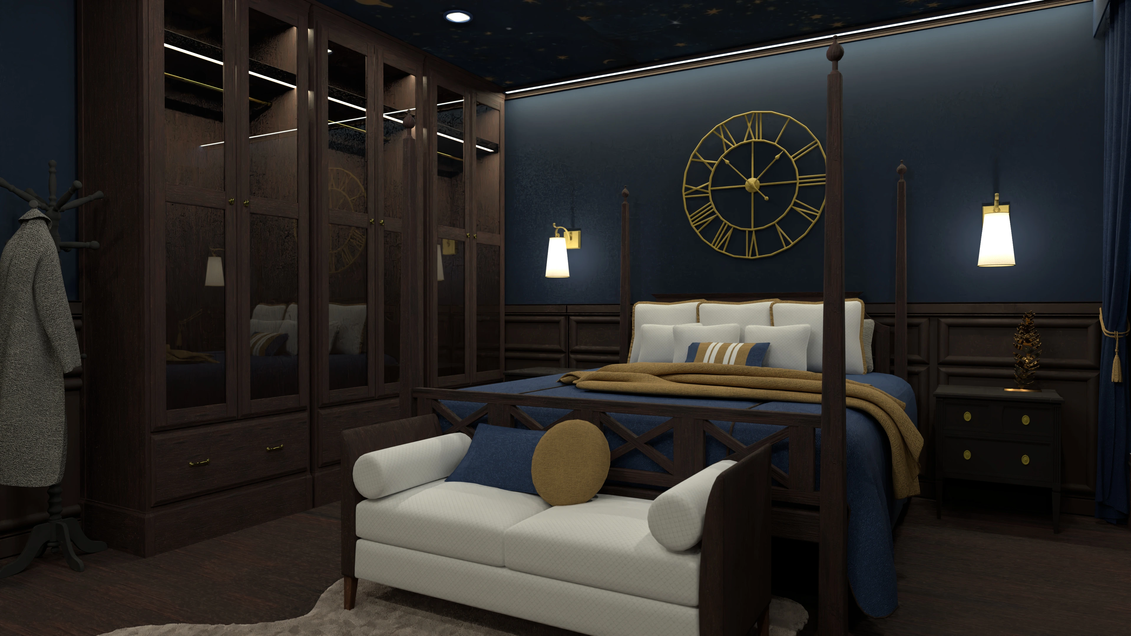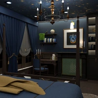 A bedroom inspired on Ravenclaw house from Harry Potter. Lots of dark wood, blue and gold, together with shelving for books, as Ravenclaw's are known for being curious and reading a lot.