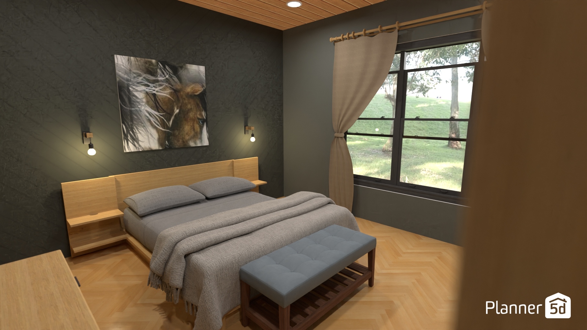Green Moody Master bedroom. 45° shiplap on wall behind bed. Large windows to allow plenty of light. Low profile platform bed.