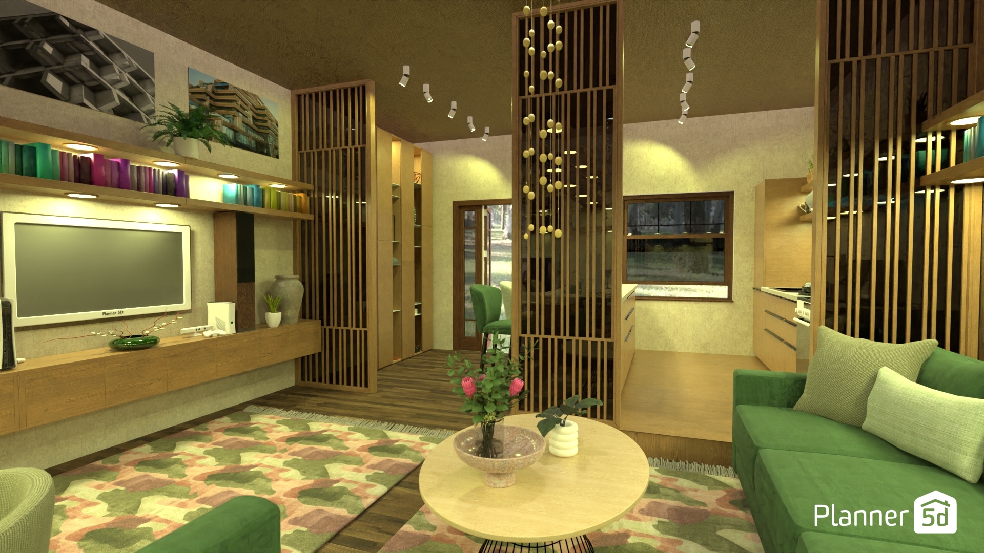 entrada a espacio abierto con zona de trabajo, sala de estar y cocina. paleta cálida, atmosfera acogedora. divisiones con lamas de madera natural. zona pensada para el trabajo, el descanso y la conversación.