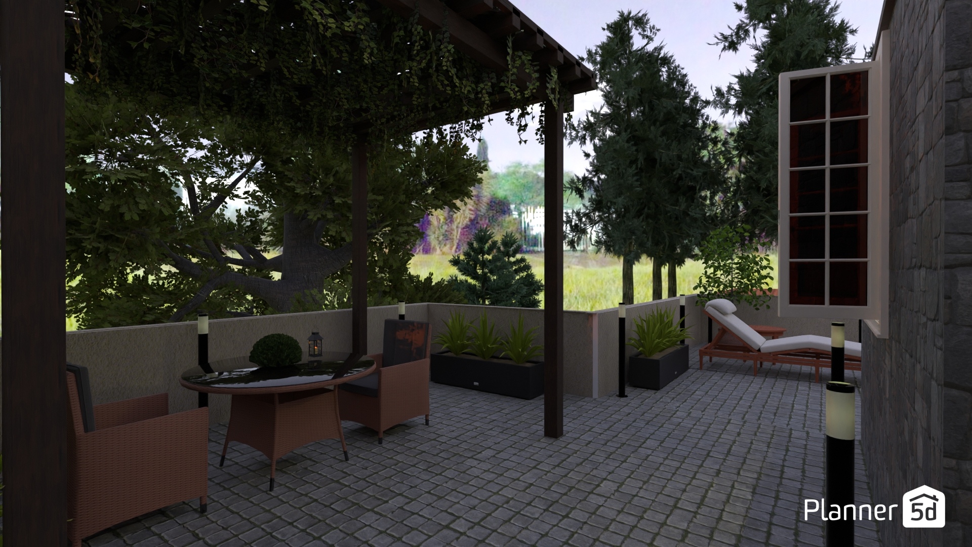 Patio pavimentado con pérgola vegetal, mobiliario de fibras y jardineras perimetrales que definen zonas de comedor y descanso en un entorno privado y sombreado.