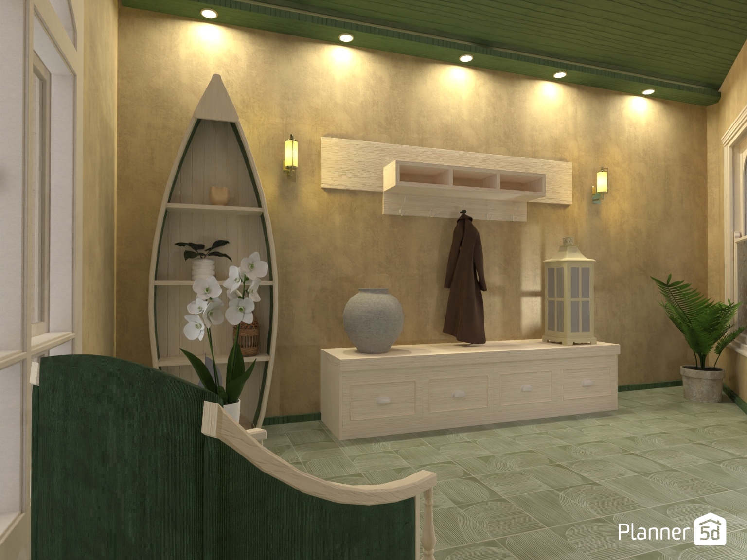 Un recibidor que reinterpreta el estilo marinero desde la calma y la textura, alejándose de lo decorativo evidente. La pared en tono arena, con acabado cálido, actúa como base envolvente donde los elementos se integran sin estridencias. La pieza en forma de barca introduce el guiño costero de forma sutil, mientras que la madera clara y la iluminación puntual refuerzan una atmósfera acogedora. La composición equilibra funcionalidad y carácter, convirtiendo la entrada en un espacio con identidad propia.