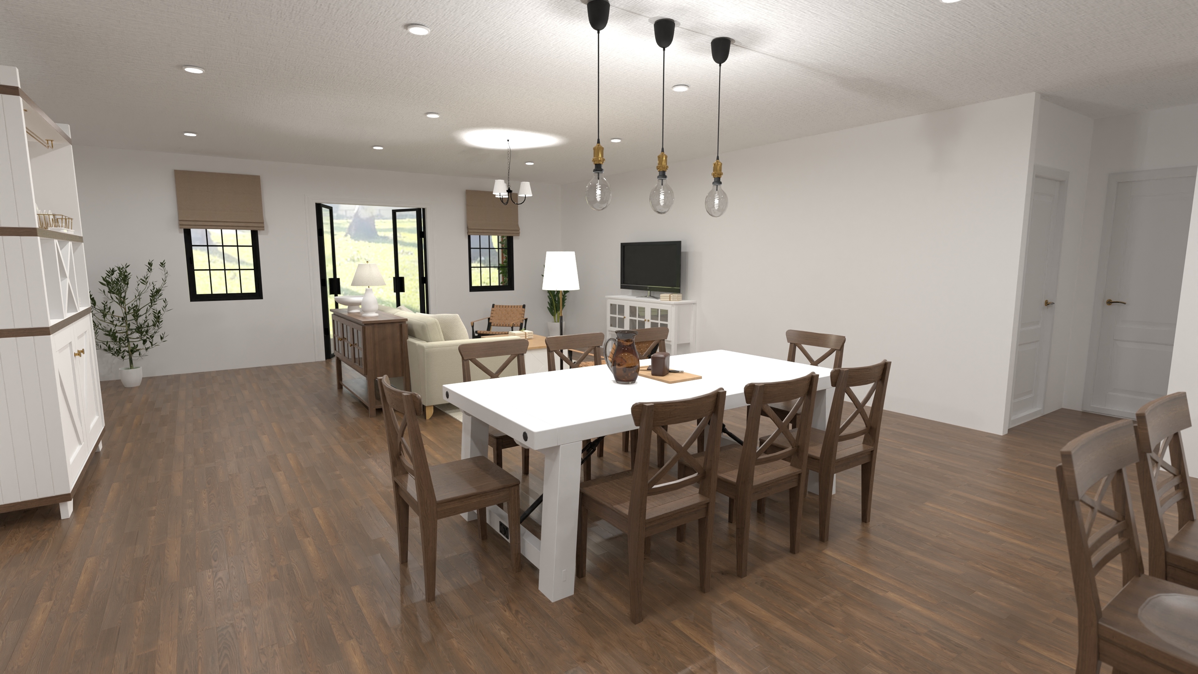 Step into casual elegance with this bohemian ranch house plan. Spanning about 2,130 sq ft on one bright level, the design greets you with a welcoming front porch and flows into an open-concept great room that links seamlessly with the island kitchen and an eight-seat dining space—perfect for lively dinners or easy weekend lounging.
