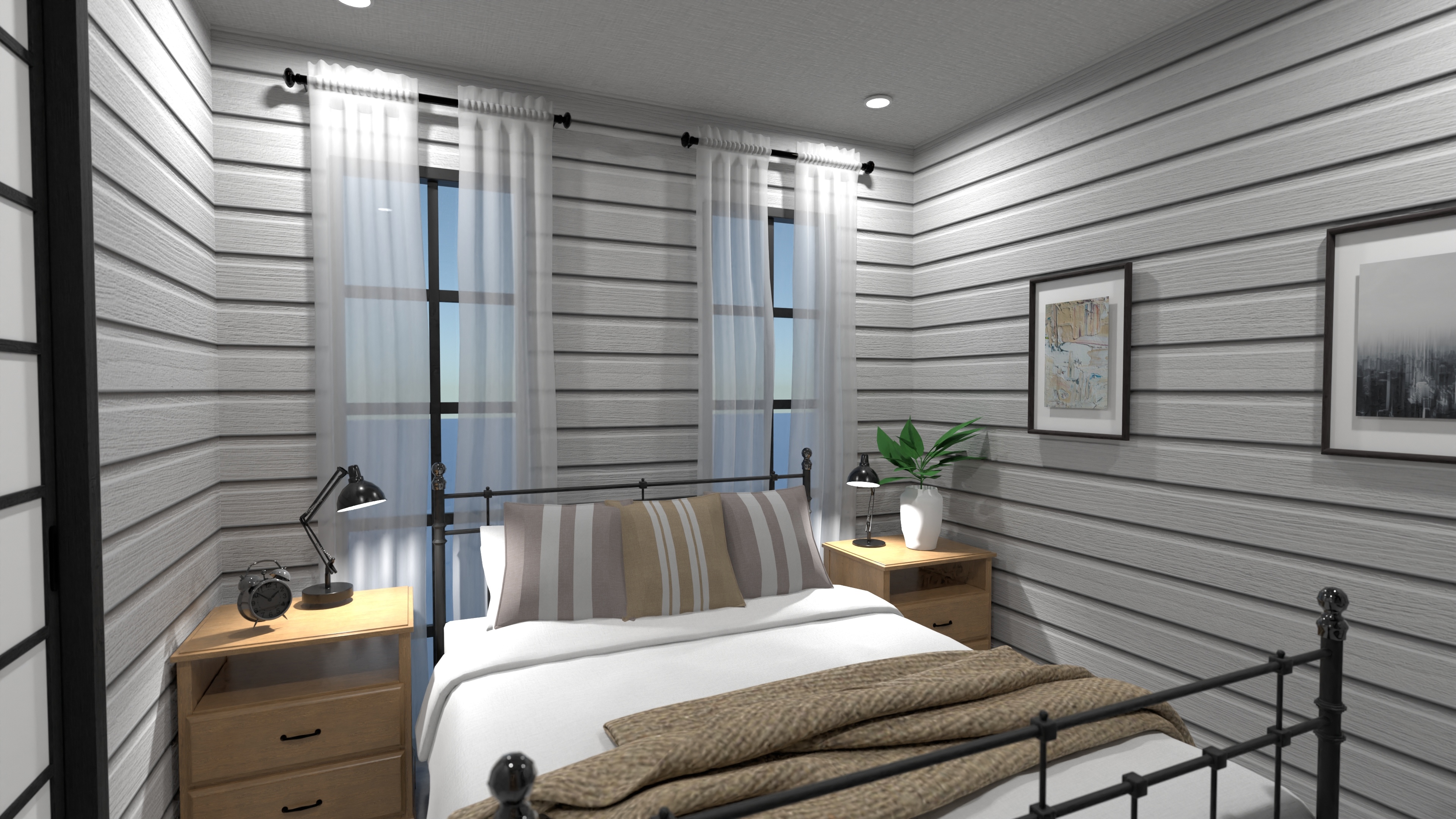Low-pitch shed roof with metal panels