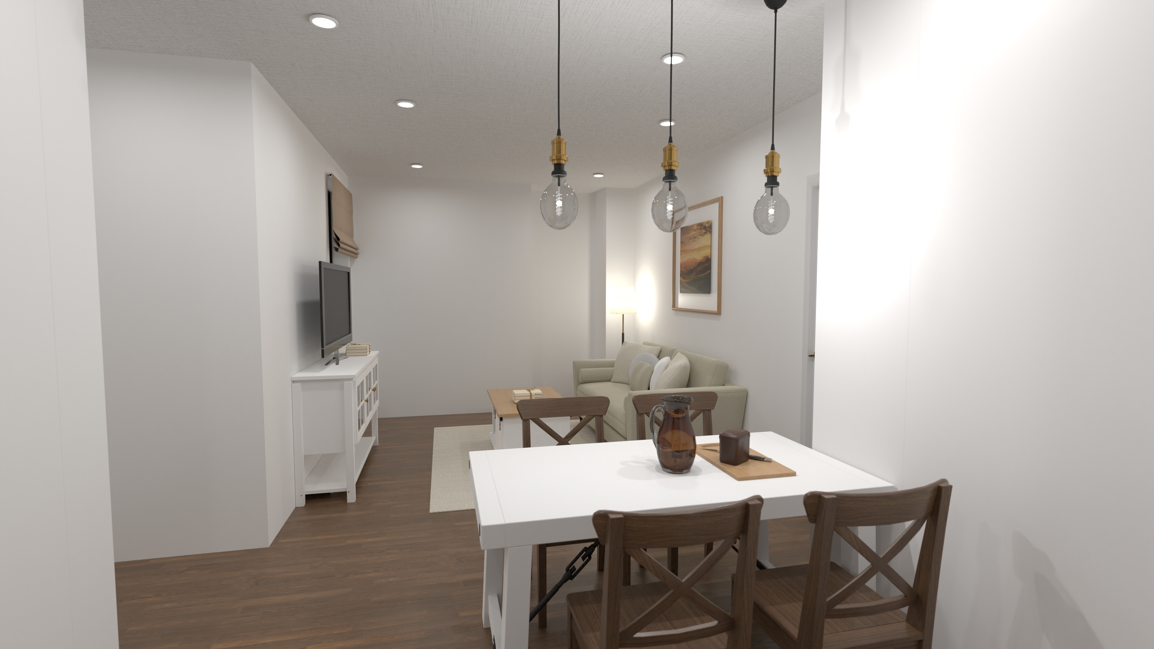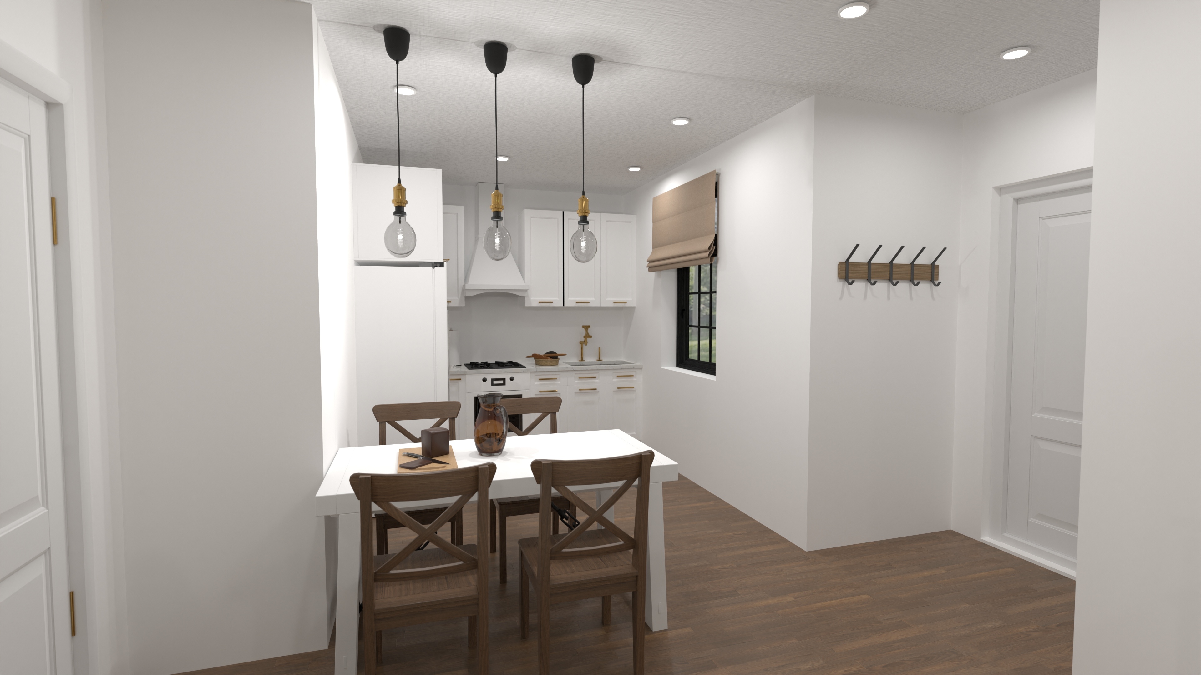 Enjoy effortless living in just 614 sq ft with this bright two bedroom small house plan. A welcoming porch leads into an open-concept living, dining, and U-shaped kitchen, making the heart of the home feel spacious and connected.