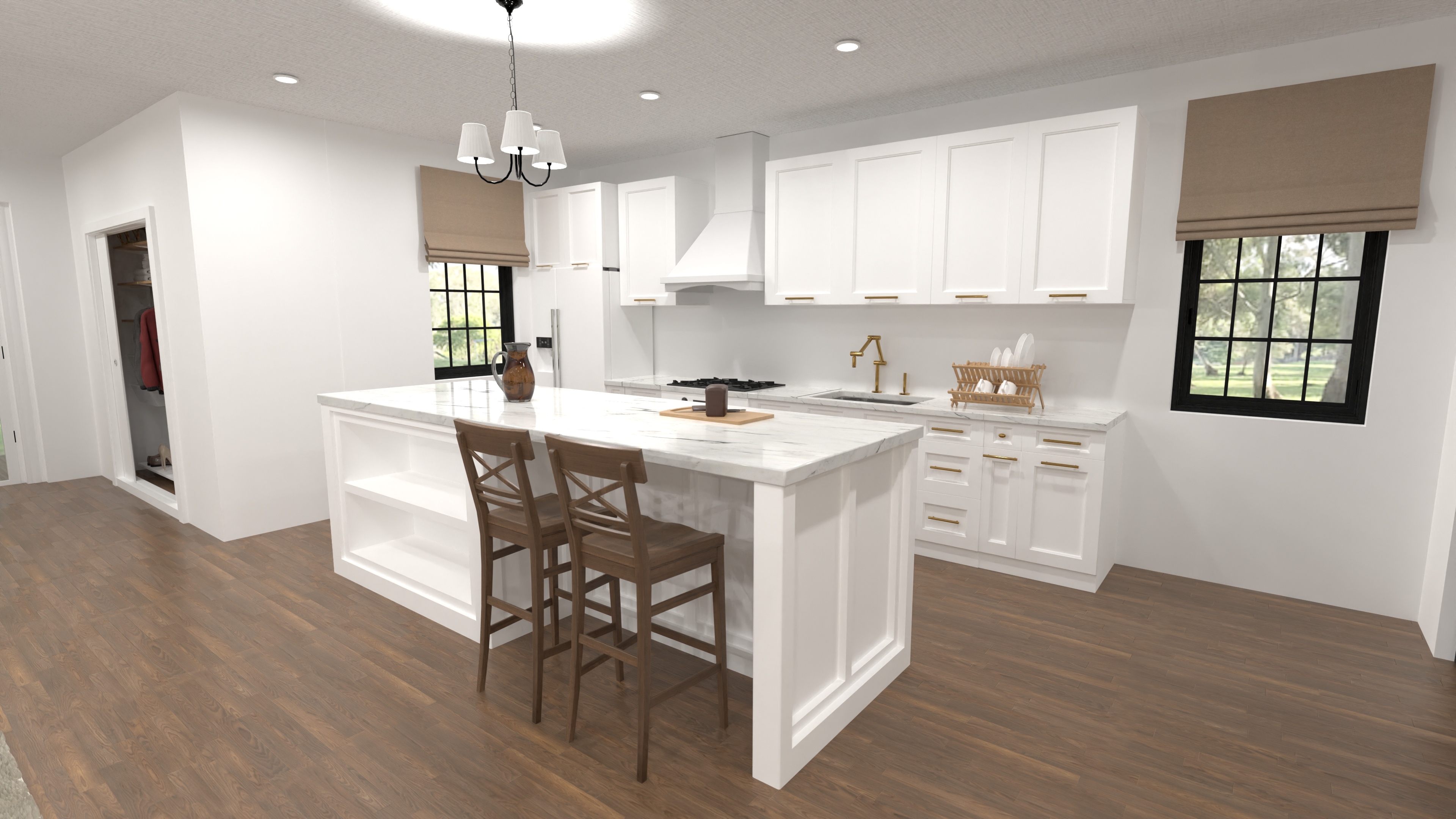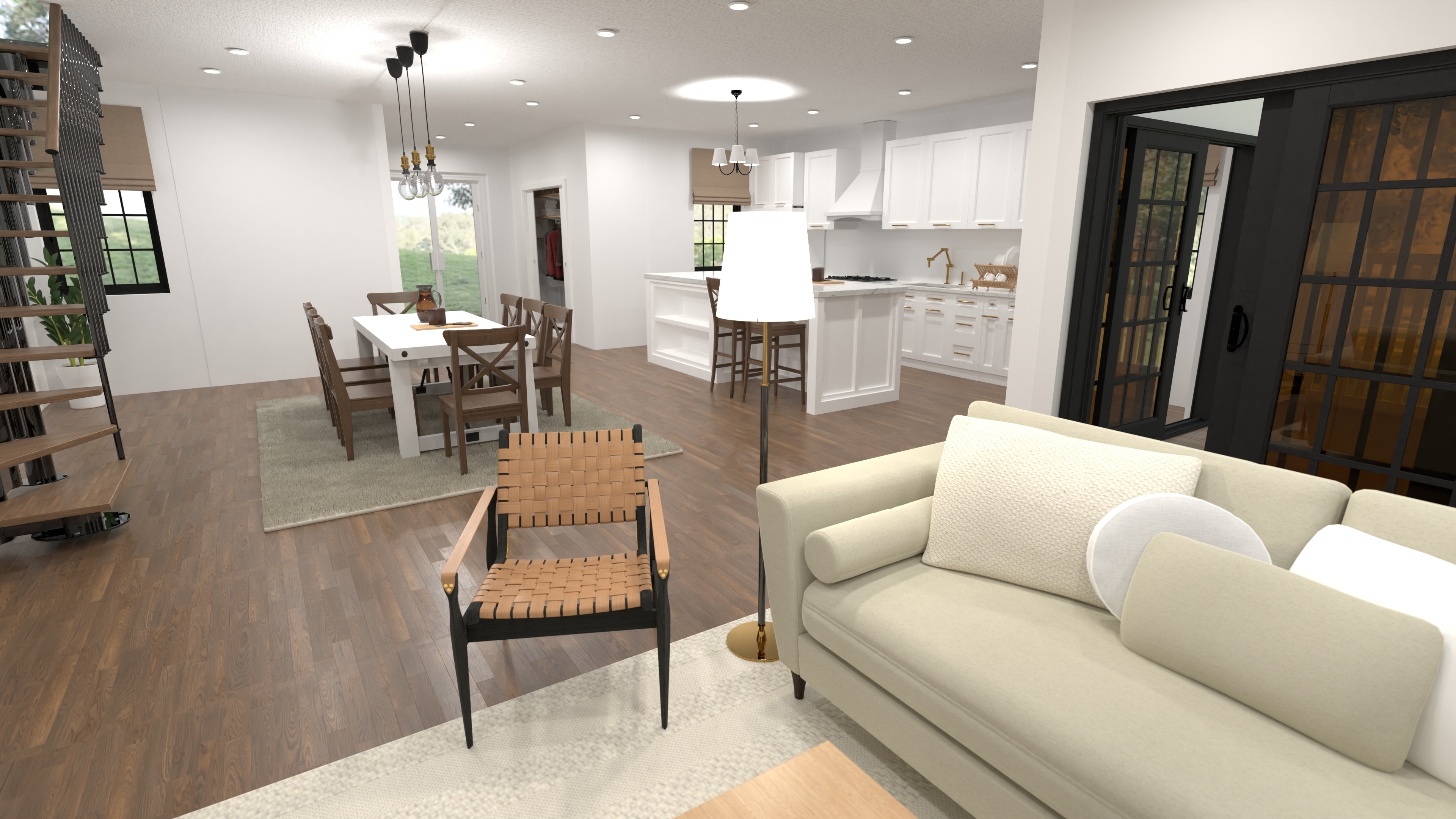 Upstairs, three comfortable bedrooms share a well-appointed full bath. The owners’ suite enjoys garden views, while a twin bedroom and a flexible third room suit kids, guests, or office space. Large windows, 9-foot ceilings, and a compact 27' x 43' footprint make this design perfect for narrow lots, first-time builders, or downsizers seeking style without excess.