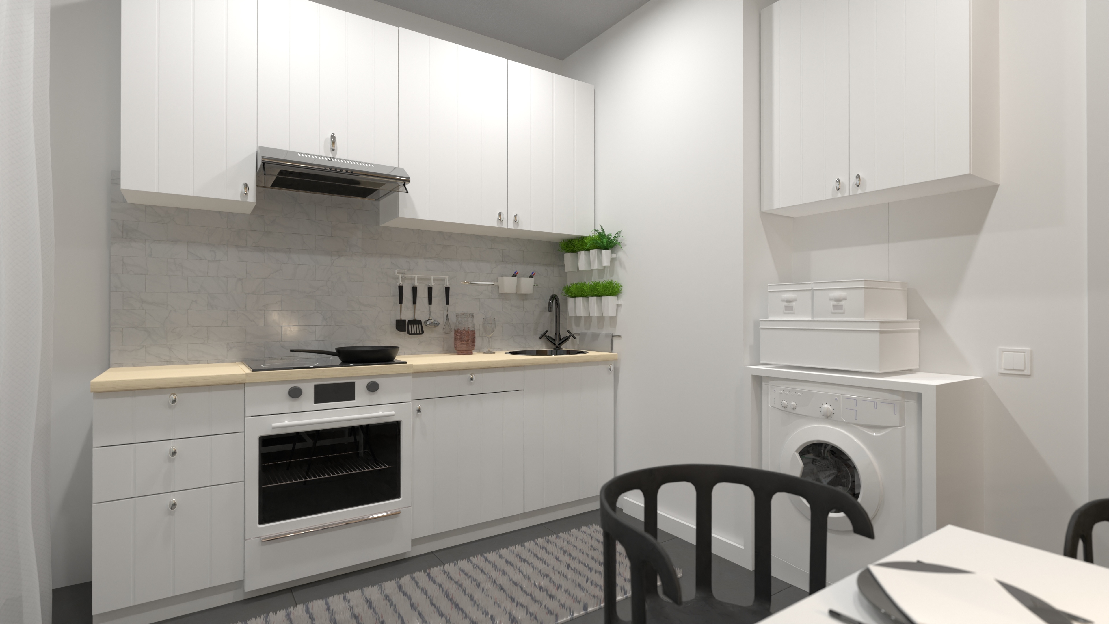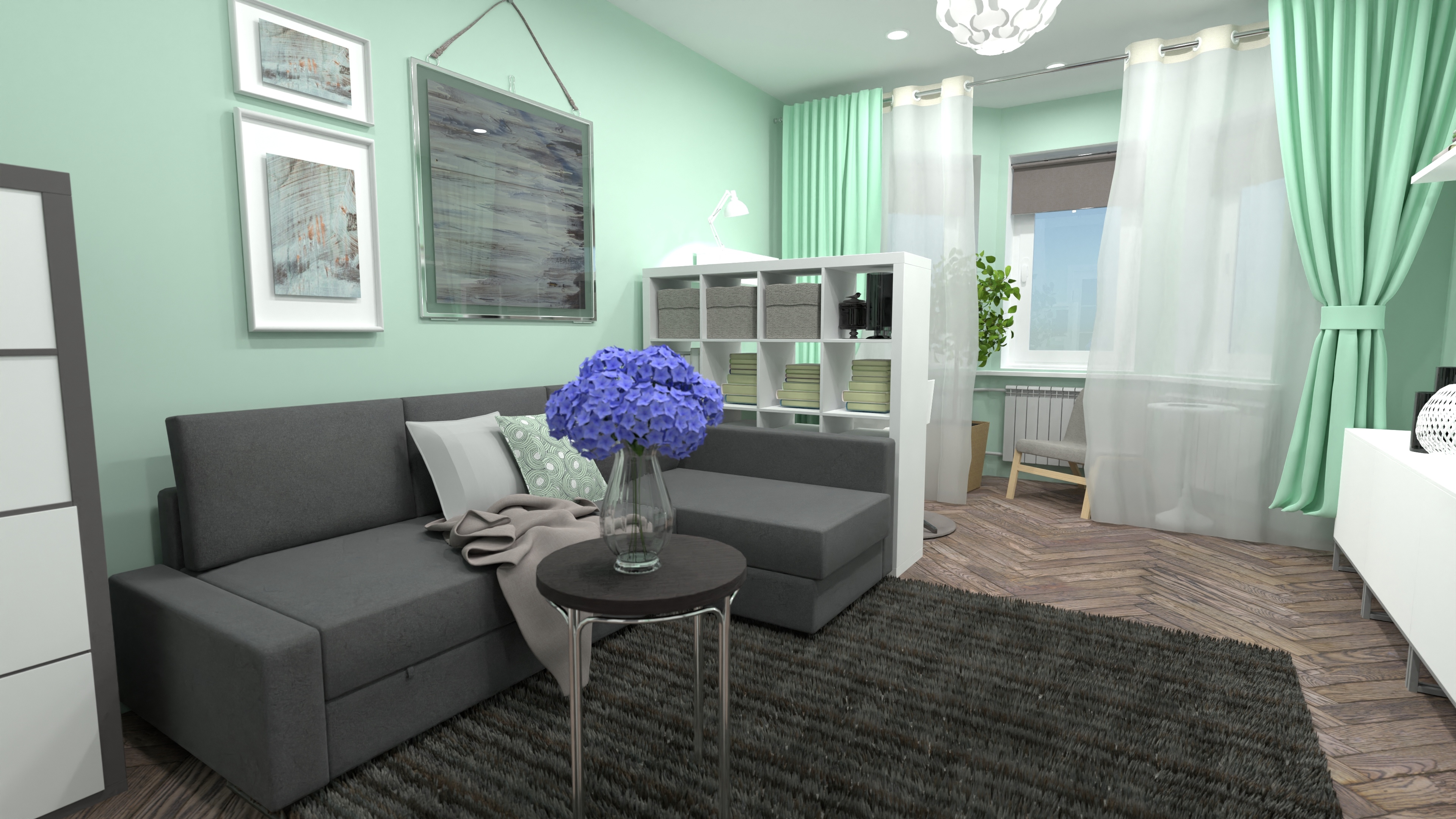 This compact studio apartment plan offers 560 sq ft of carefully zoned living, blending sleeping, lounging, and cooking into one seamless space. The open main area features built-in storage and a convertible sofa bed ideal for a young couple or urban professionals.