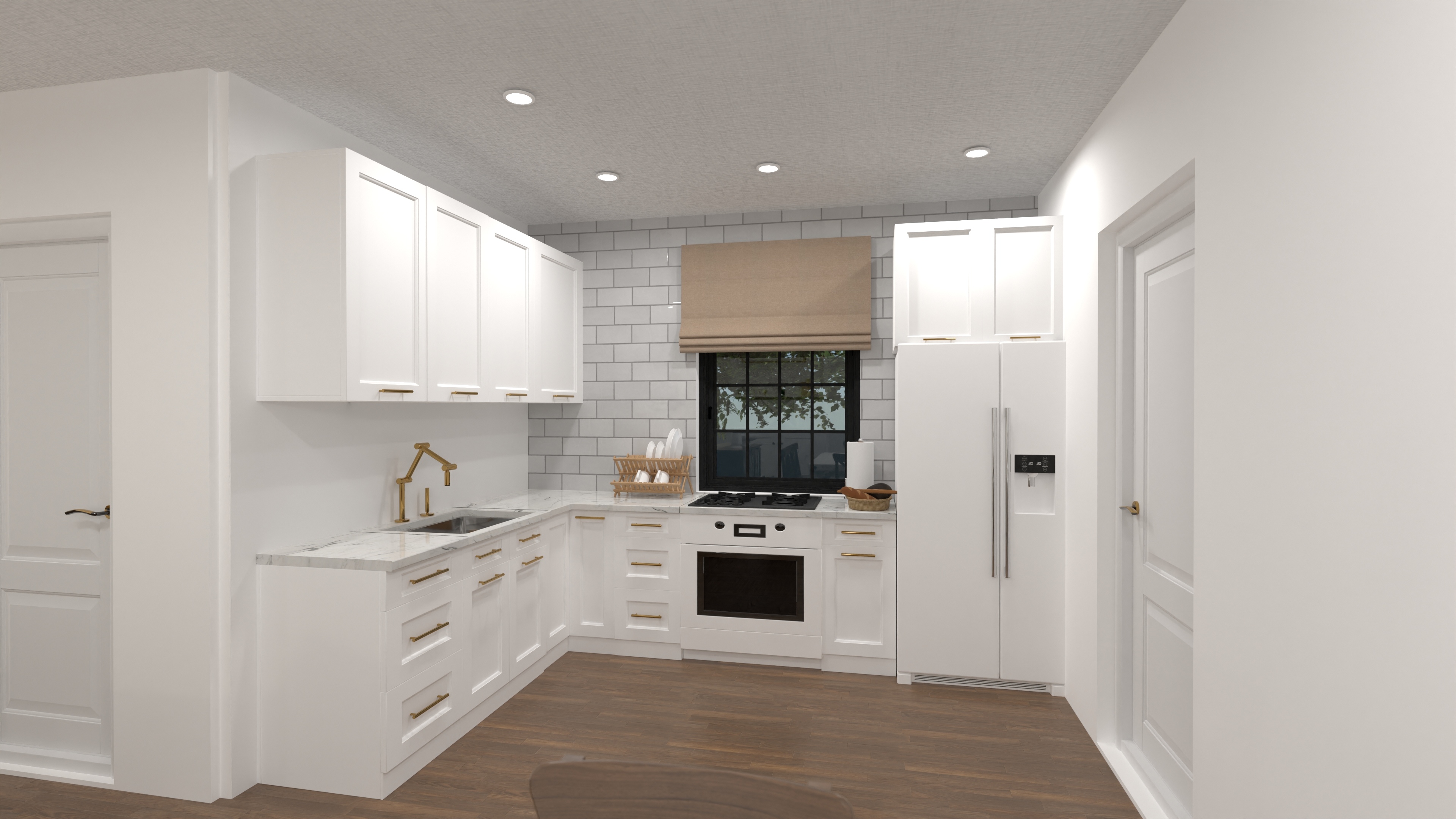 At roughly 441 sq ft, this cozy tiny cabin house plan delivers big living in a small footprint. A bright open studio holds the living, dining, and sleeping zones, while a full U-shaped kitchen keeps meal prep effortless.