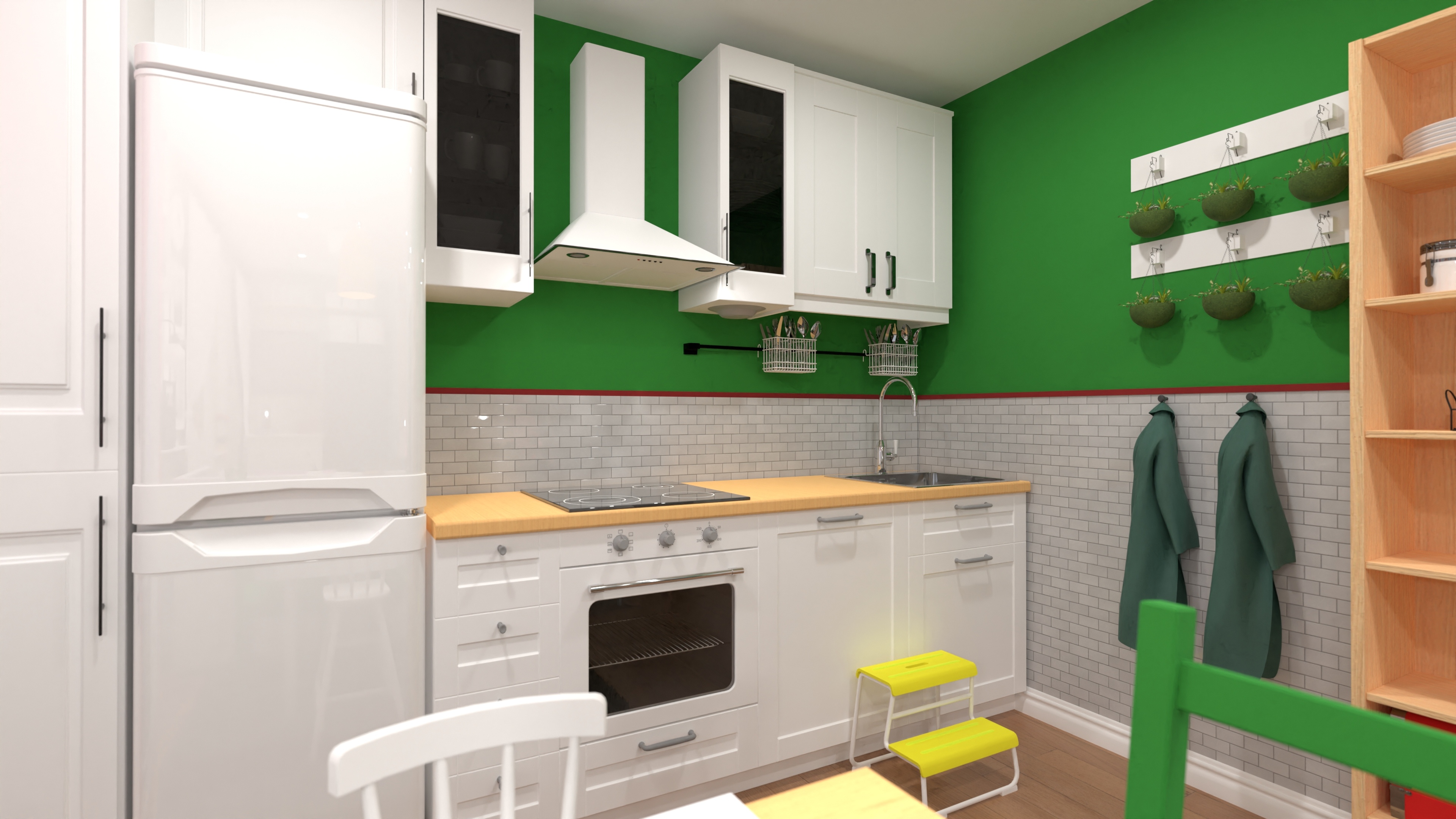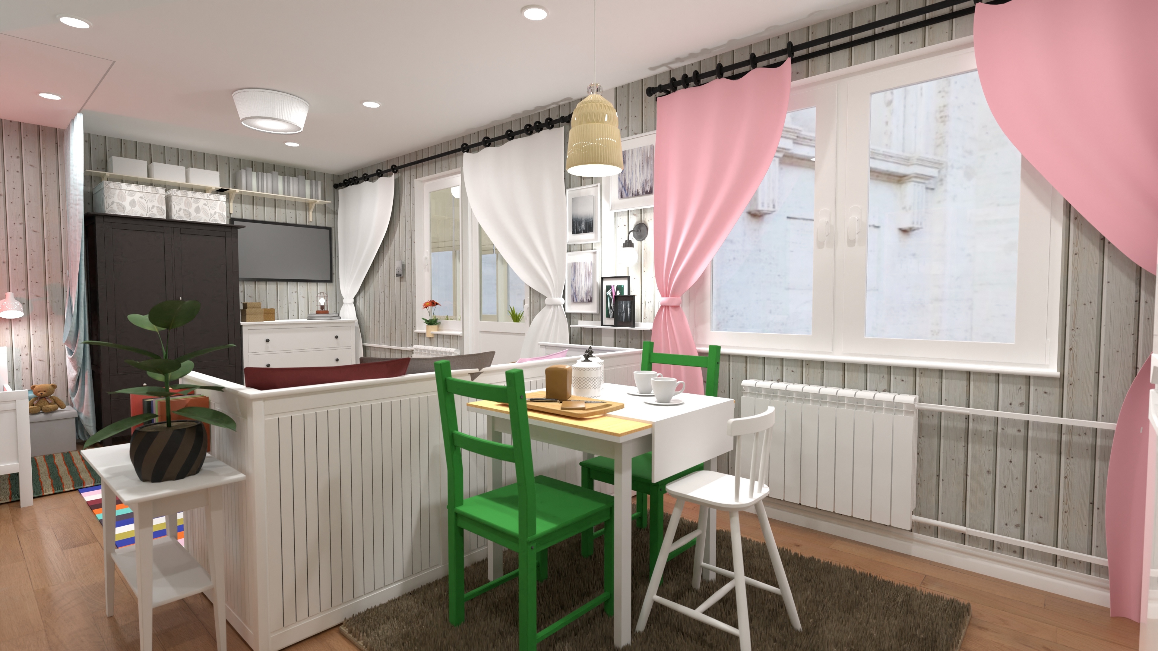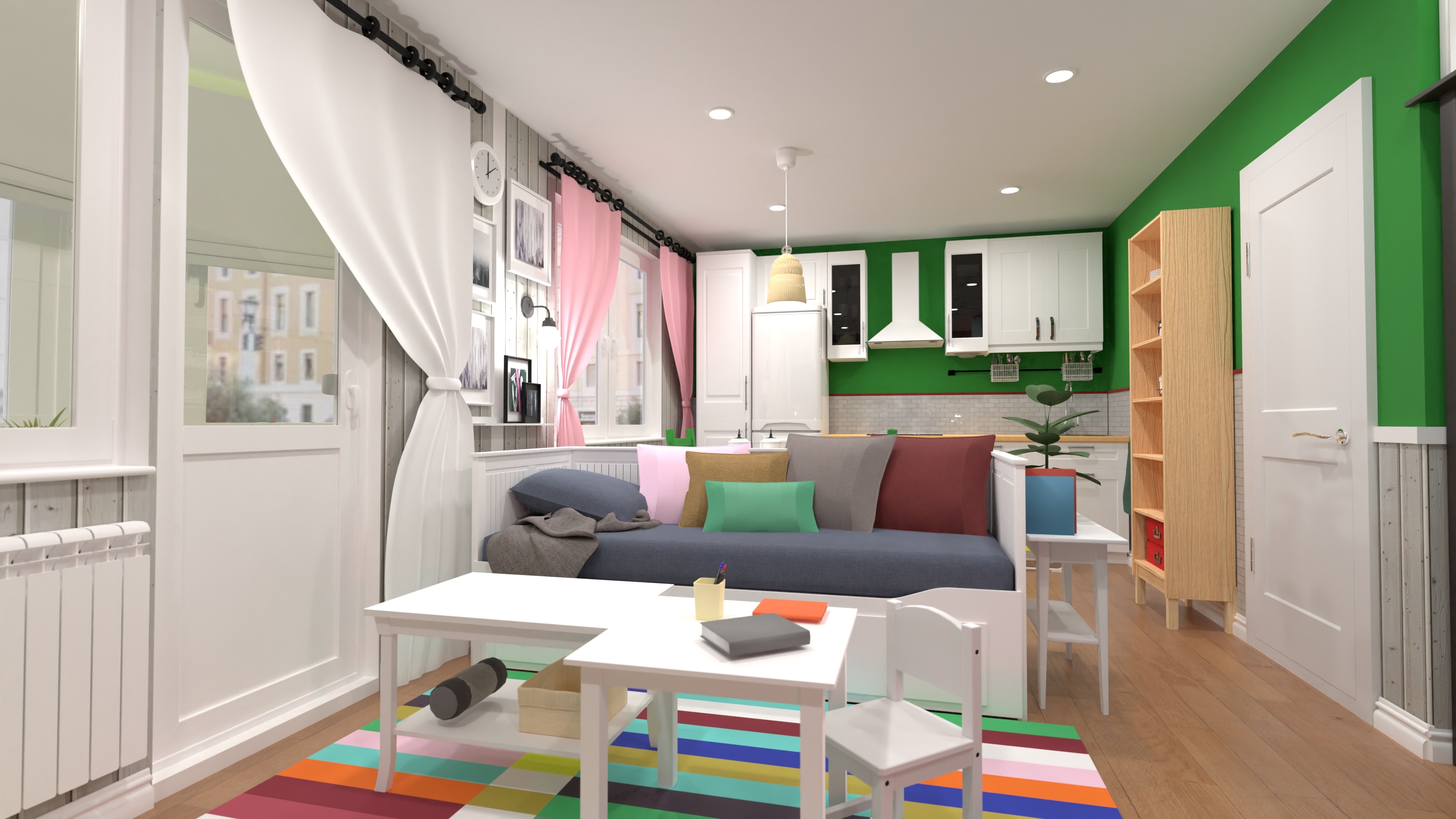 Discover this 420 sq ft studio apartment floor plan designed for creative, family-friendly living. An open layout merges the kitchen, dining, and living/sleeping zones, while a clever kids’ nook offers a private corner for a child. Large windows and light finishes amplify natural brightness.