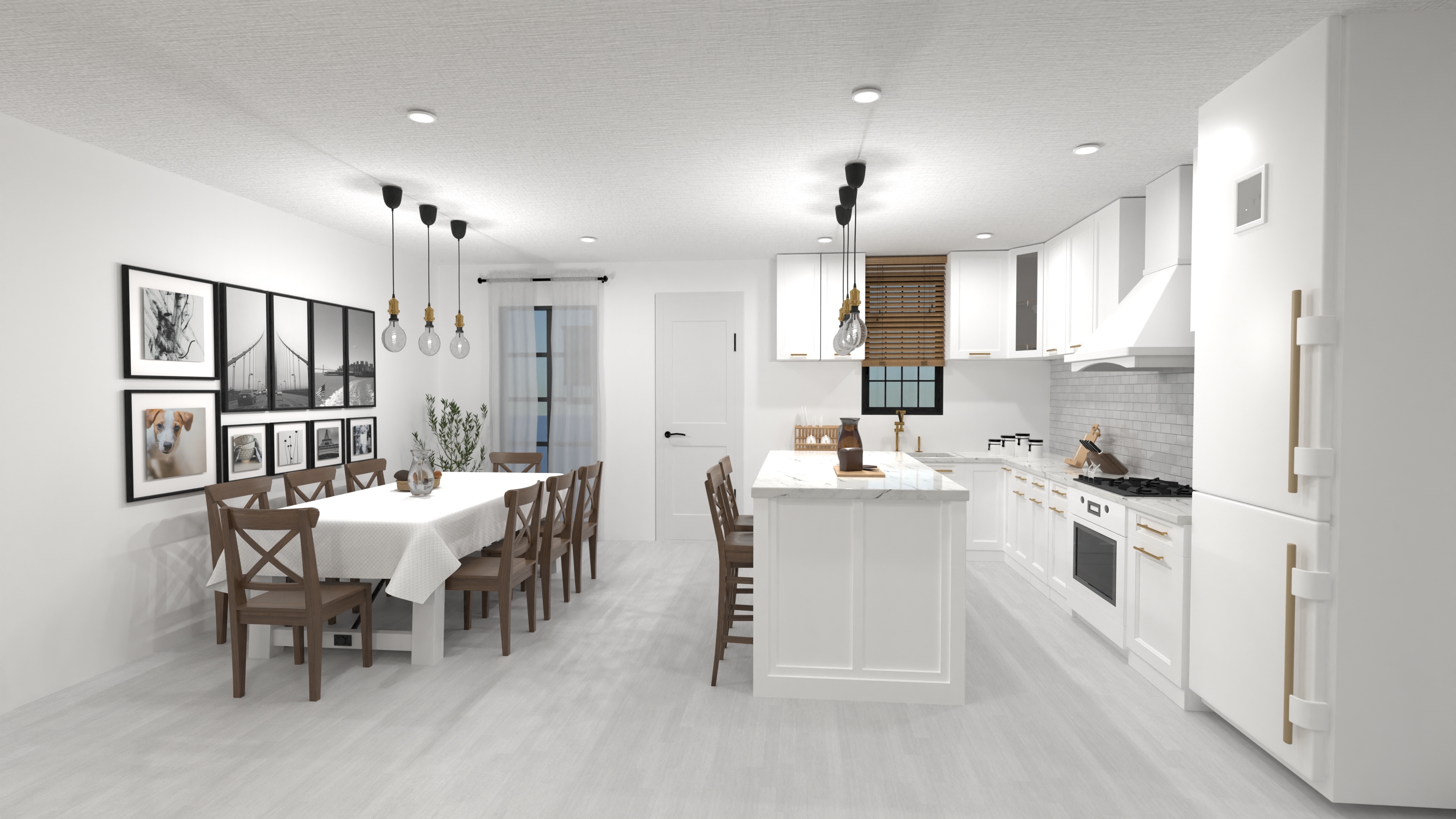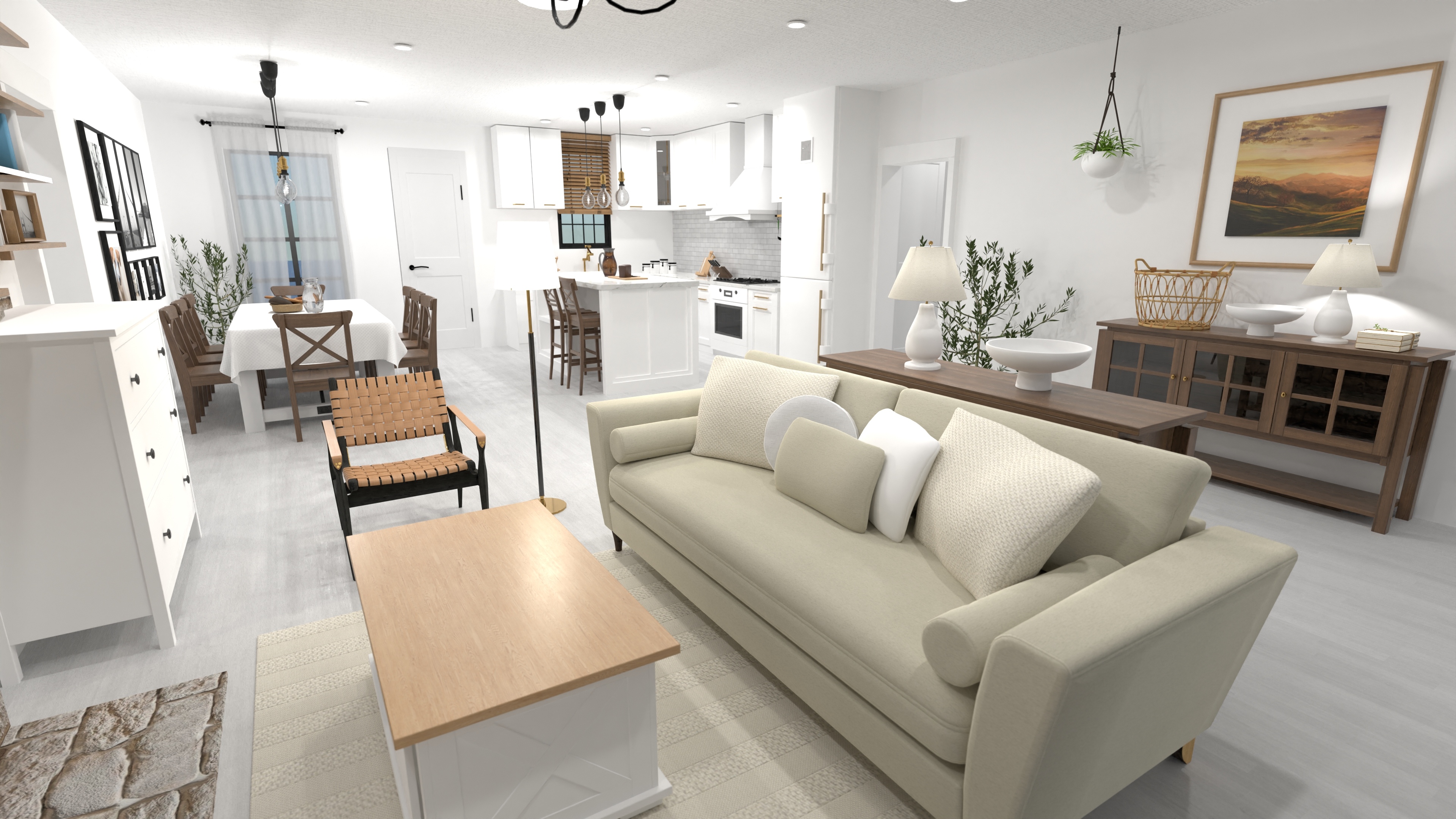 Total Heated Space: 1,560 sq ft Open Great Room (living-dining-kitchen): 613 sq ft Primary Suite: 215 sq ft Bedroom 2: 140 sq ft Bedroom 3: 129 sq ft