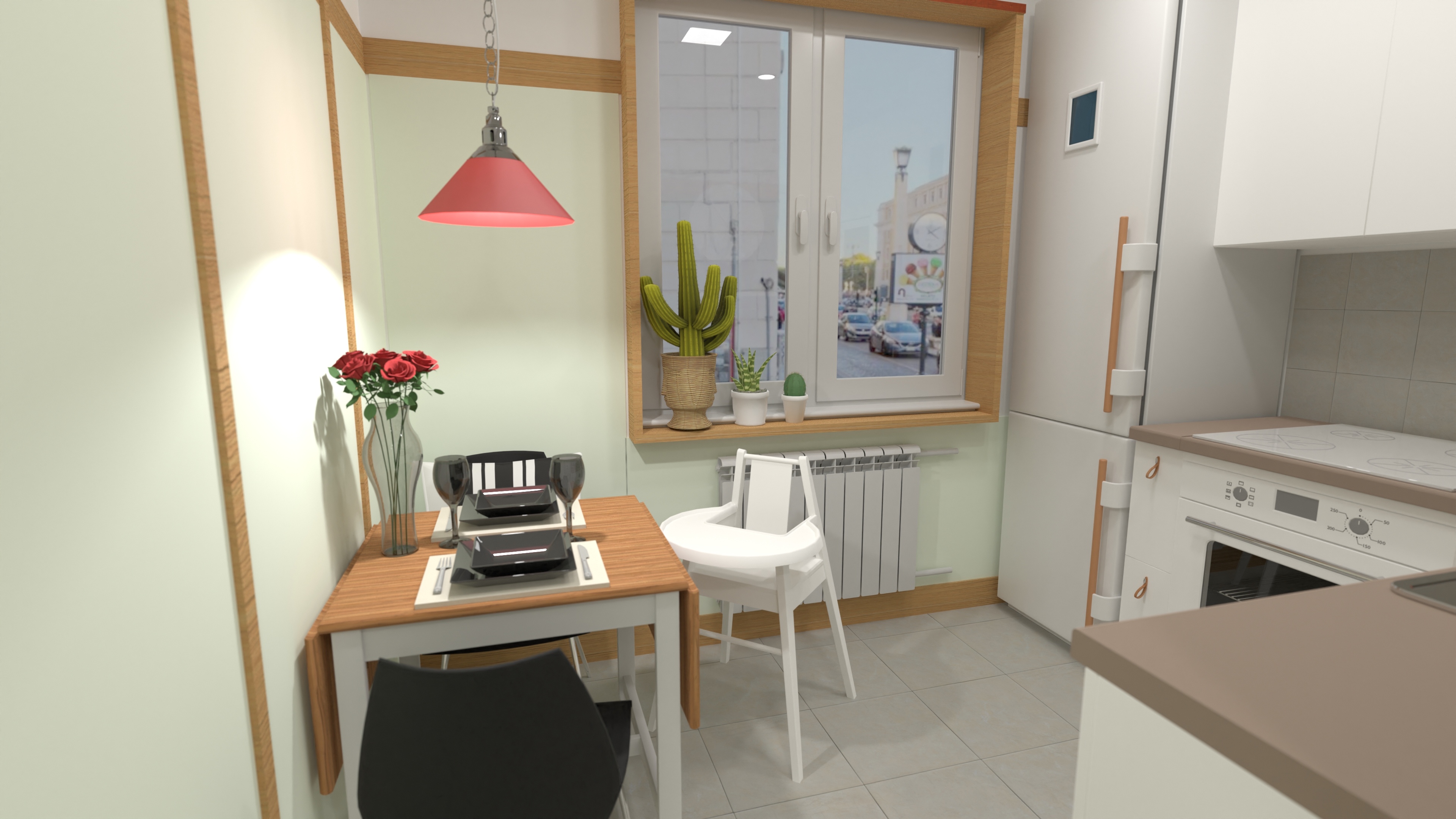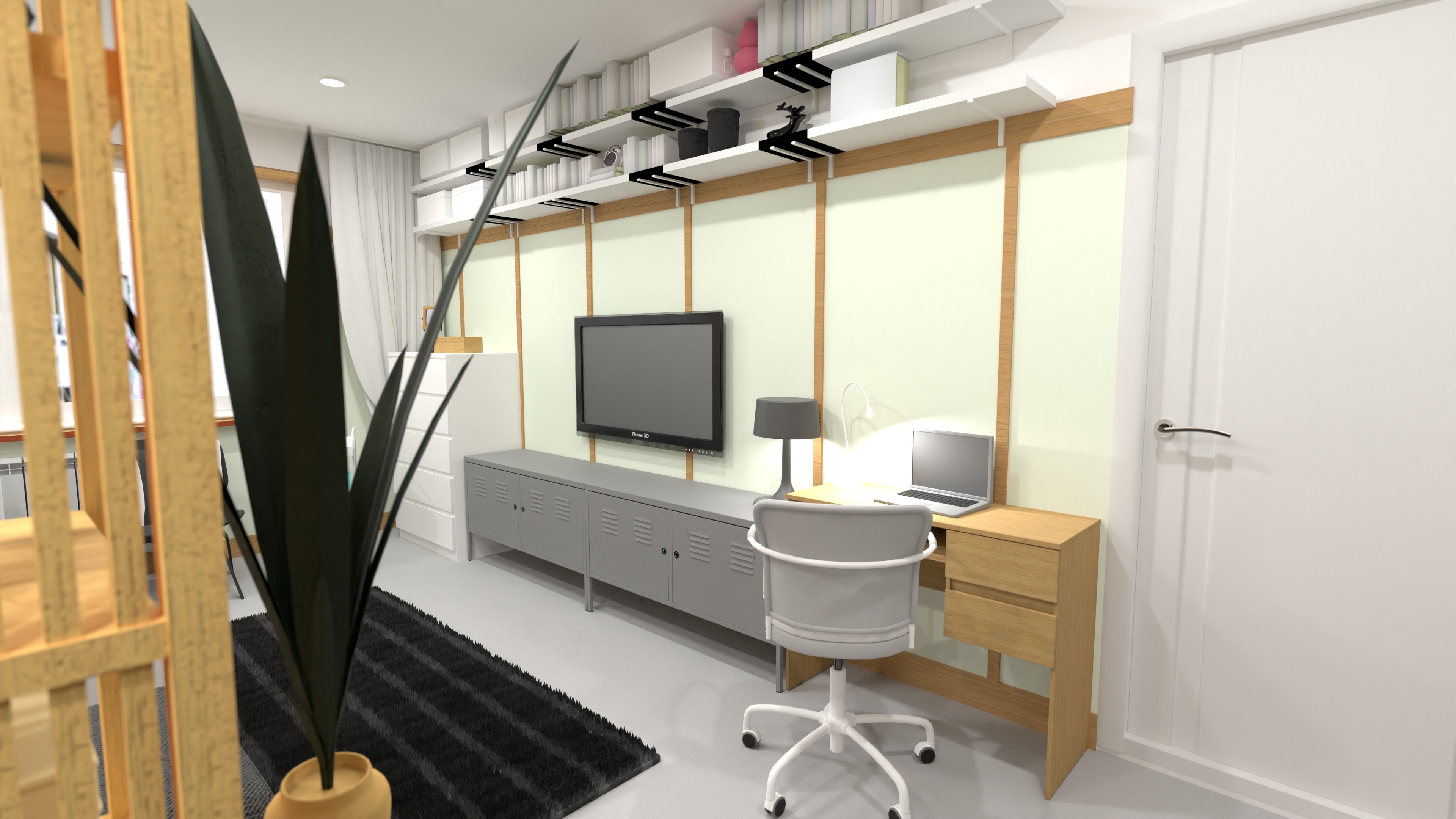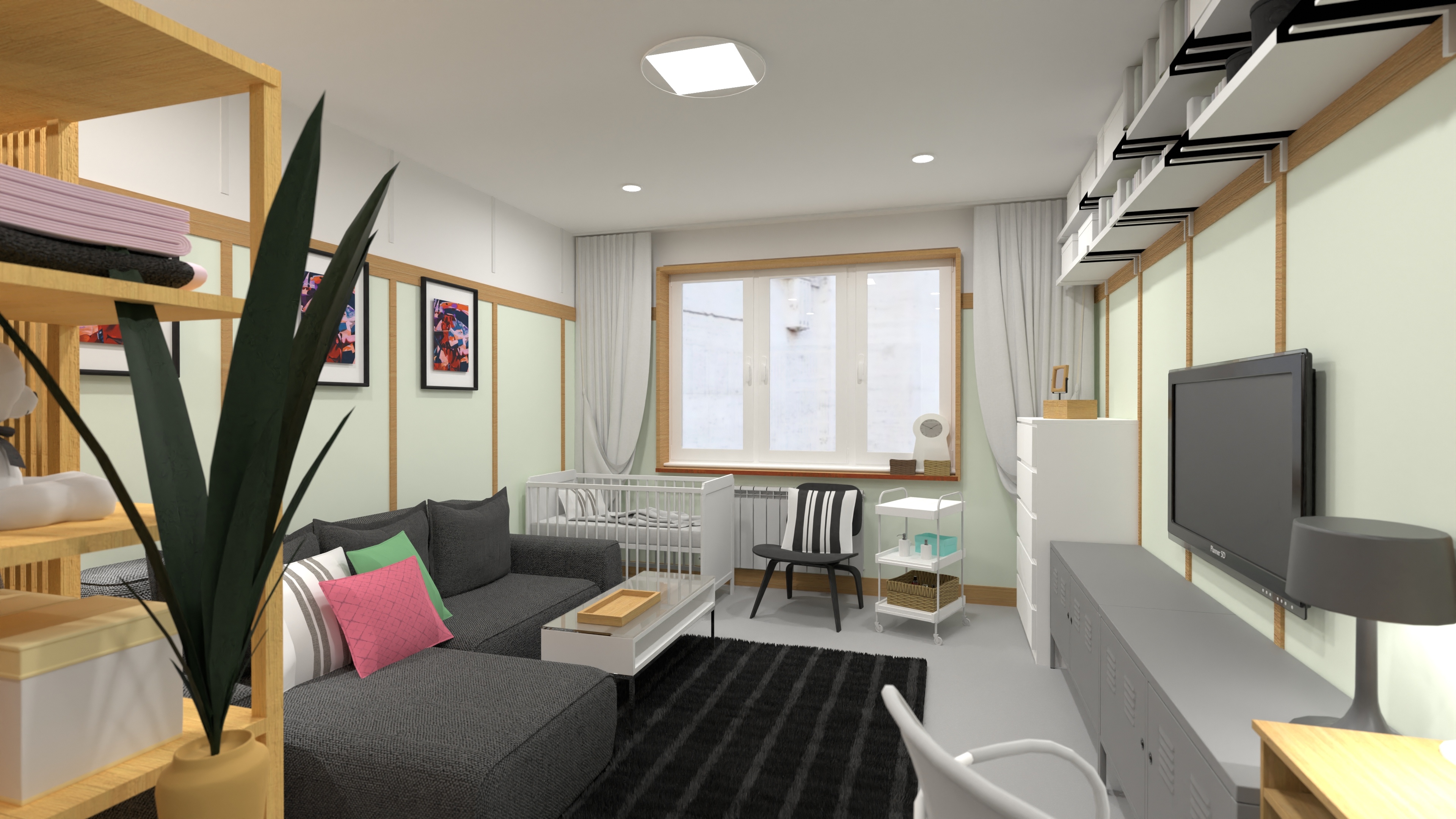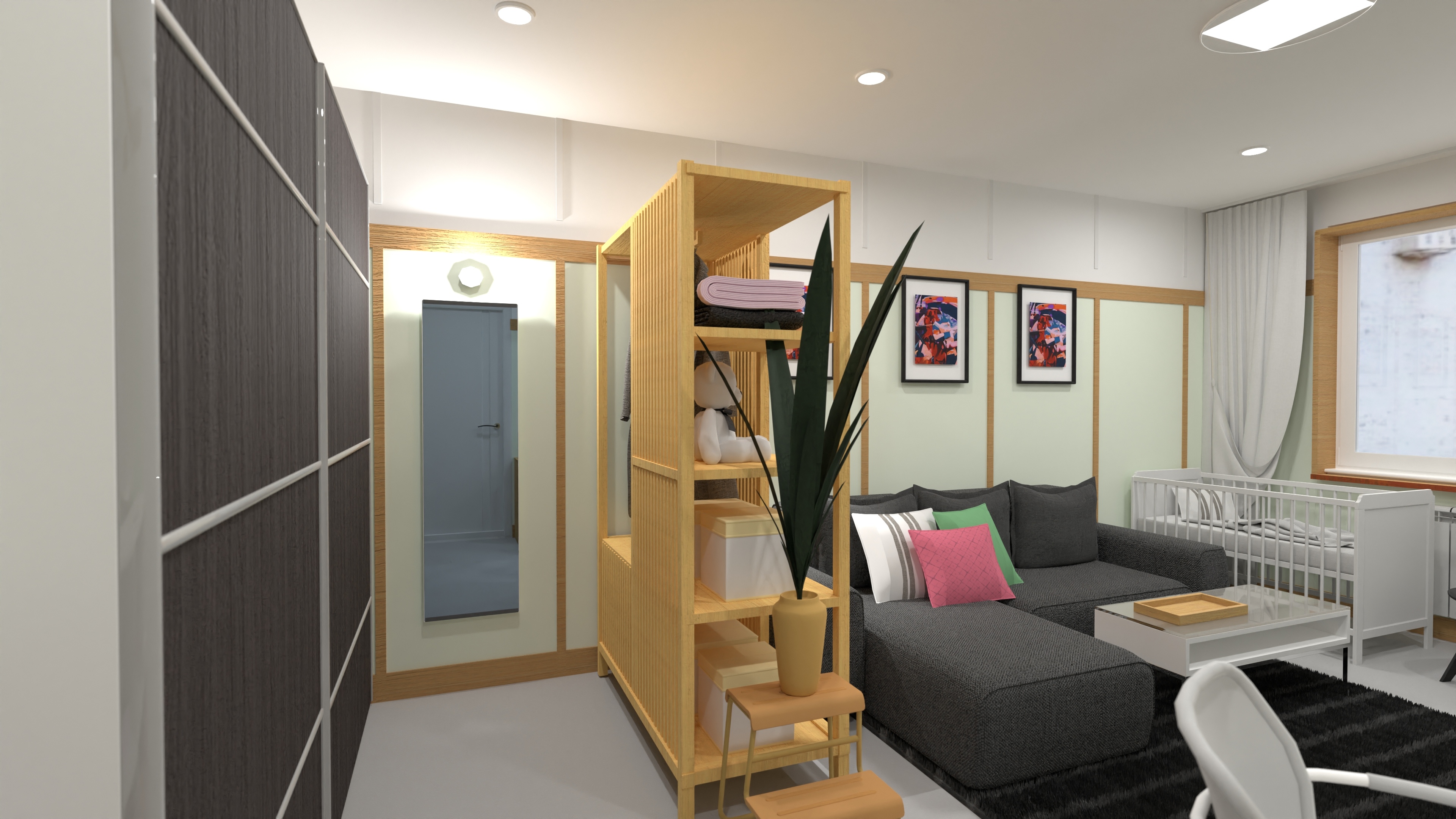 - And integrated shelving in this family studio apartment plan.
