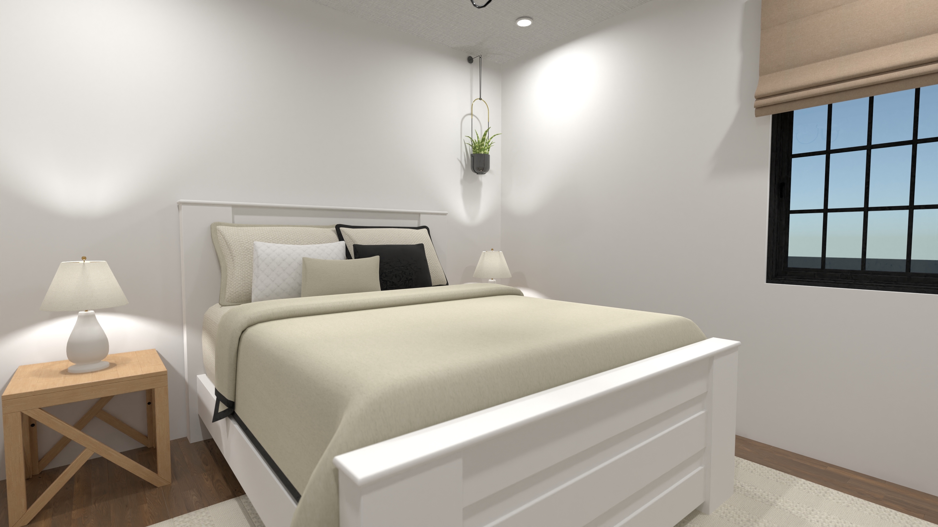 Private bedroom wings place a spacious primary suite up front and a secondary bedroom toward the rear, each serviced by its own full bath. A handy laundry zone sits between the sleeping quarters. Out front, single-car garages keep vehicles secure while reducing the overall footprint.