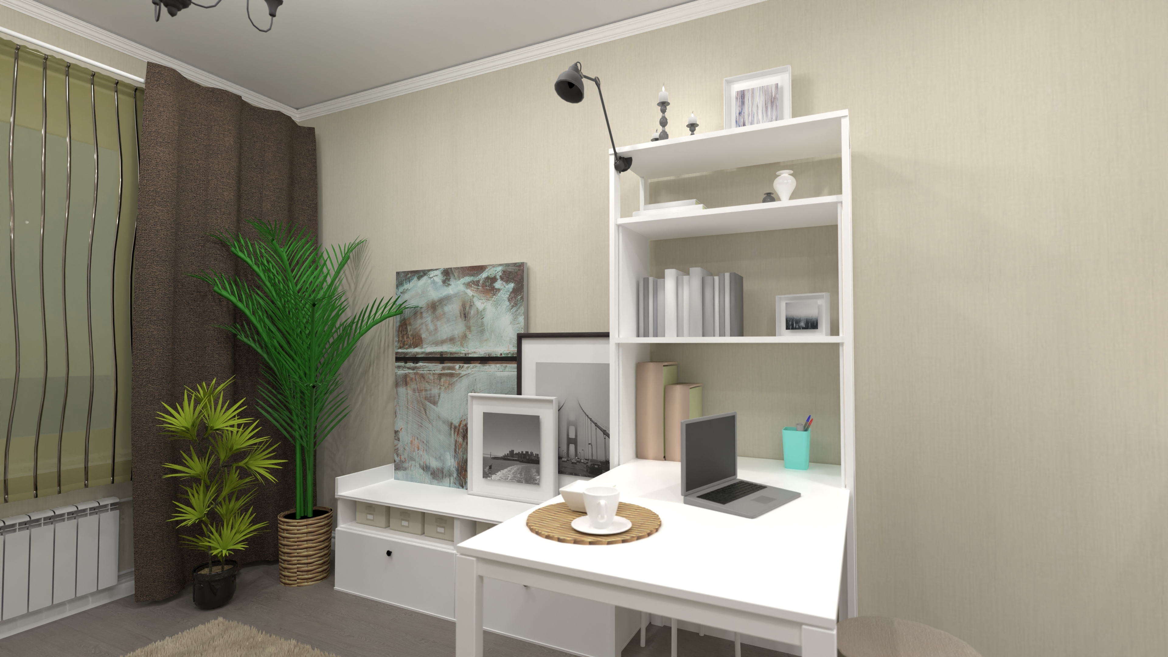 A separate entry hall offers mirrored storage and a shoe rack, while built-in shelving and glass partitions define areas without closing off the space. The neutral, Boho-inspired palette adds warmth and style throughout.