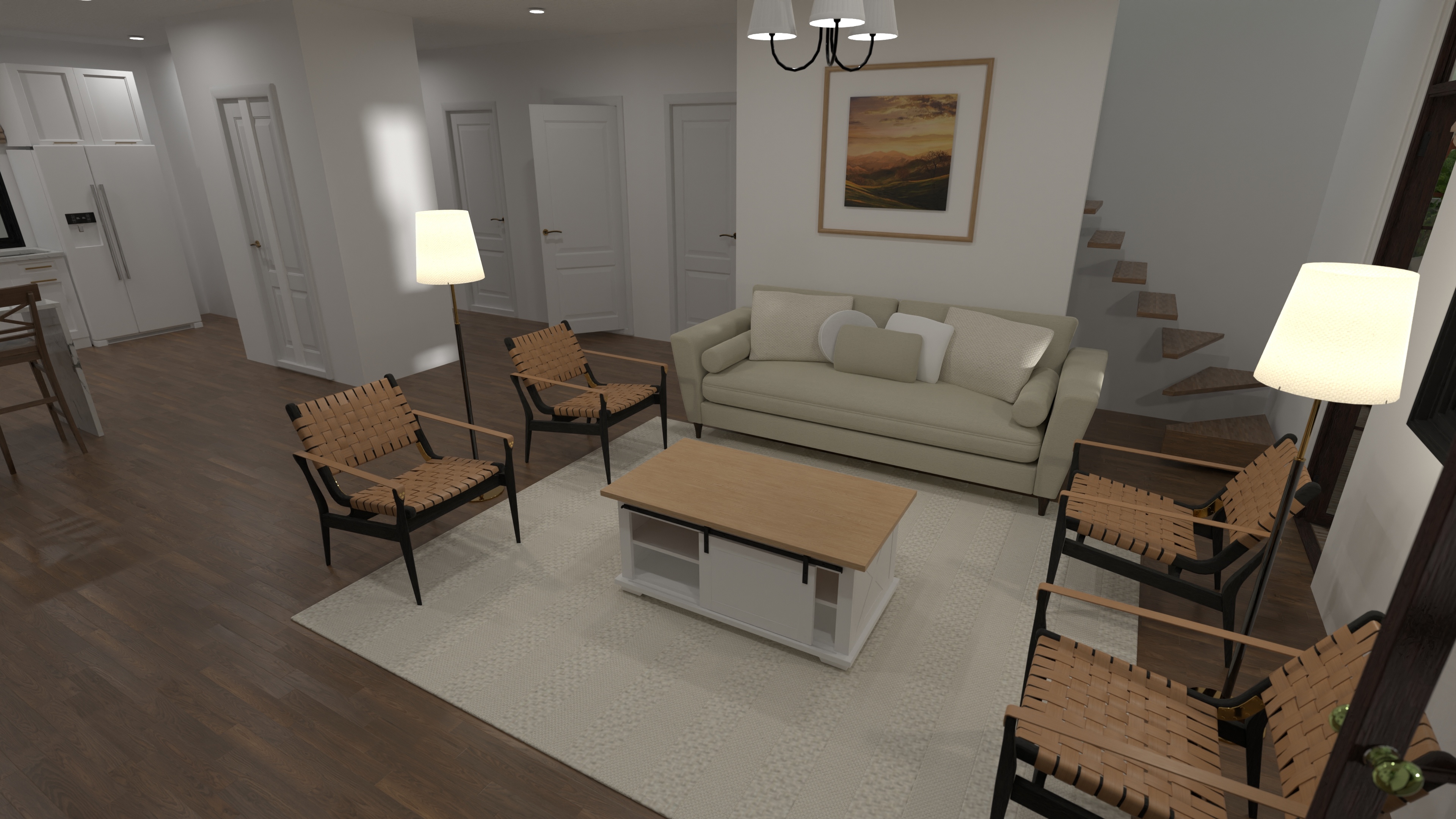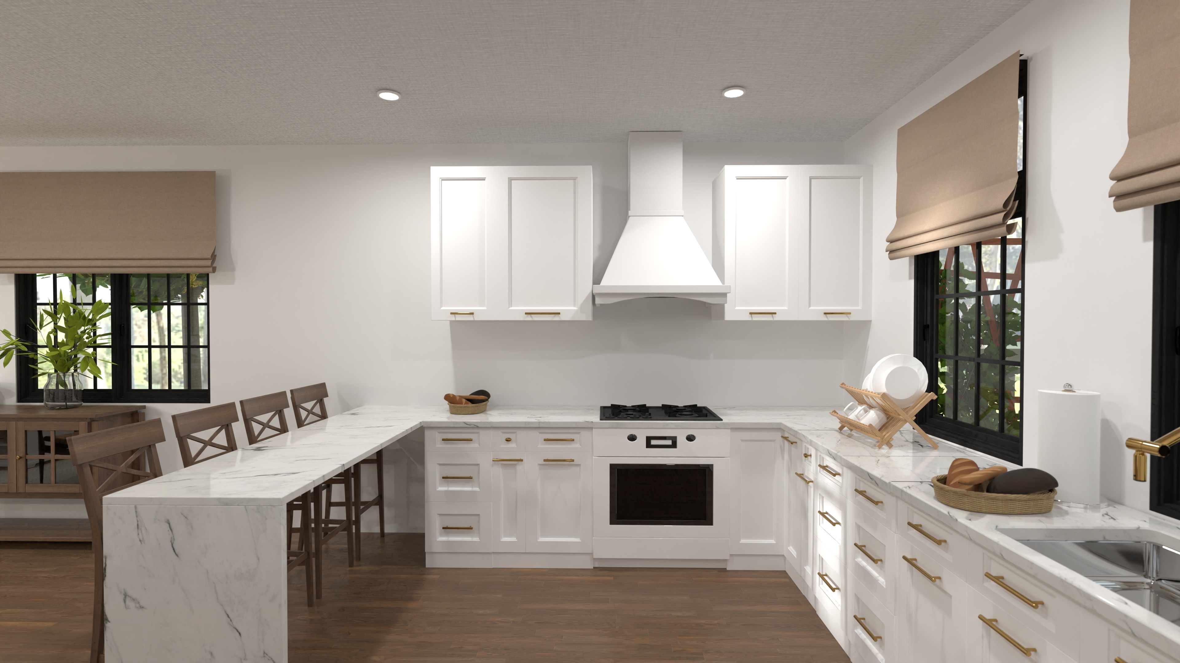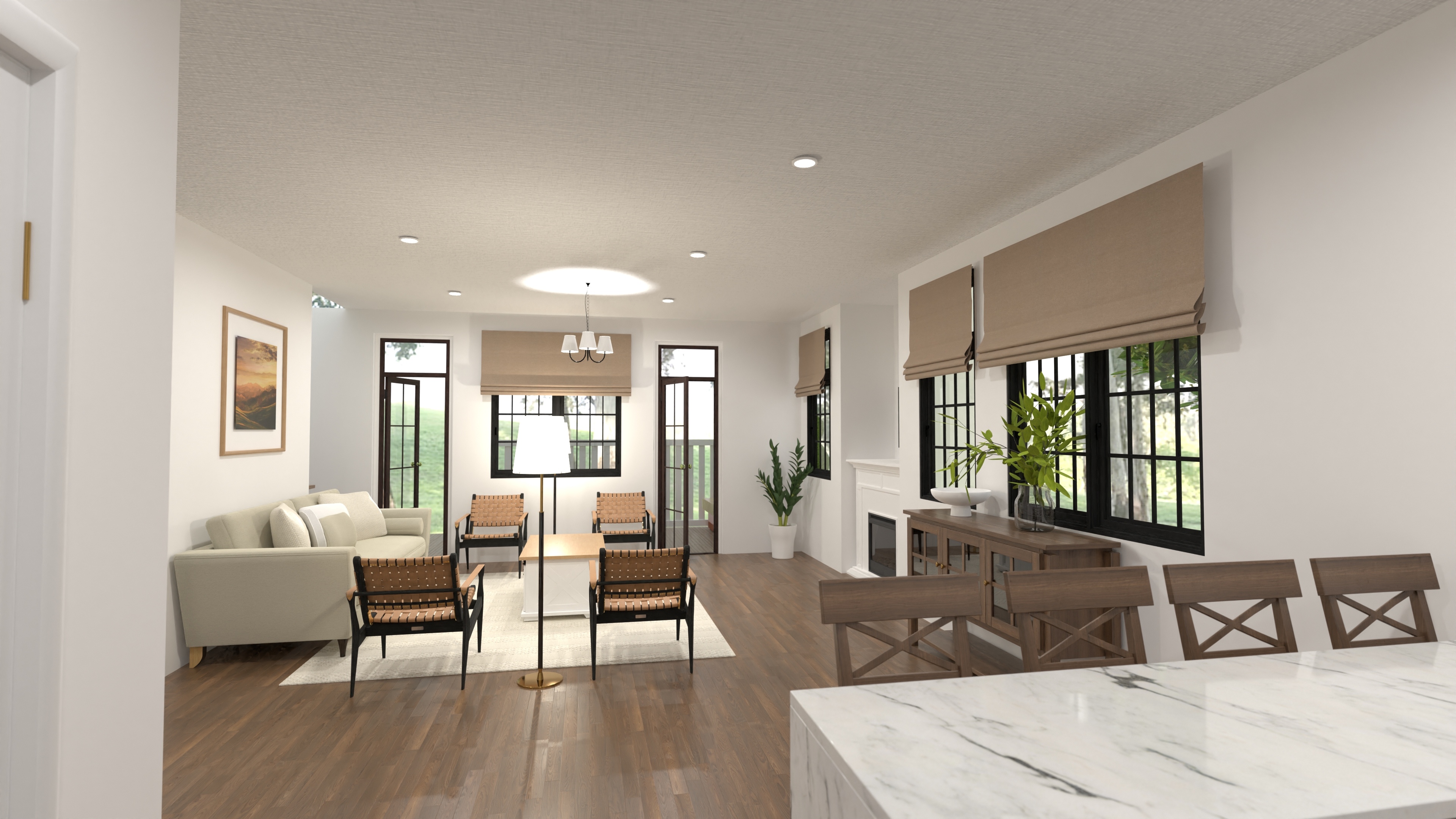 - Fireplace-anchored great room and seating island