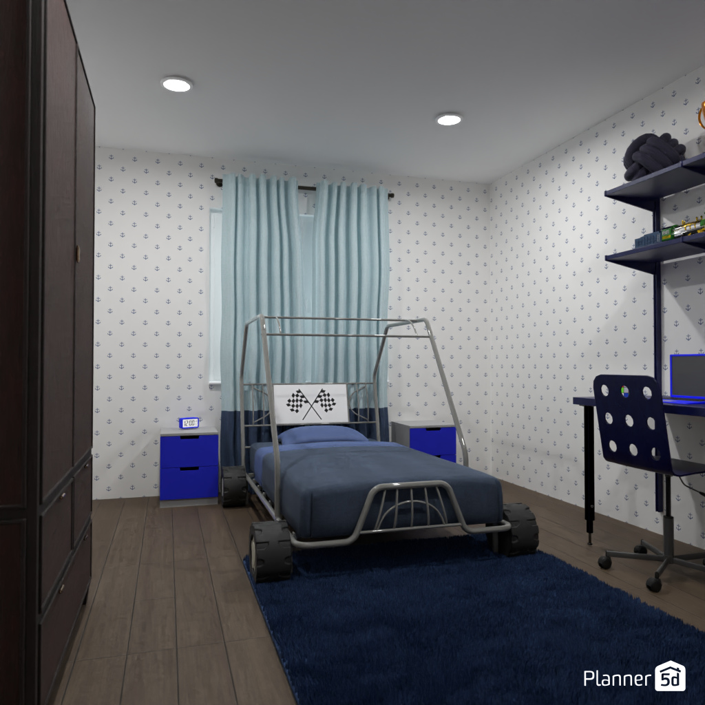 Progettate una camera da letto per bambini utilizzando il blu come tonalità principale dell'interior.
