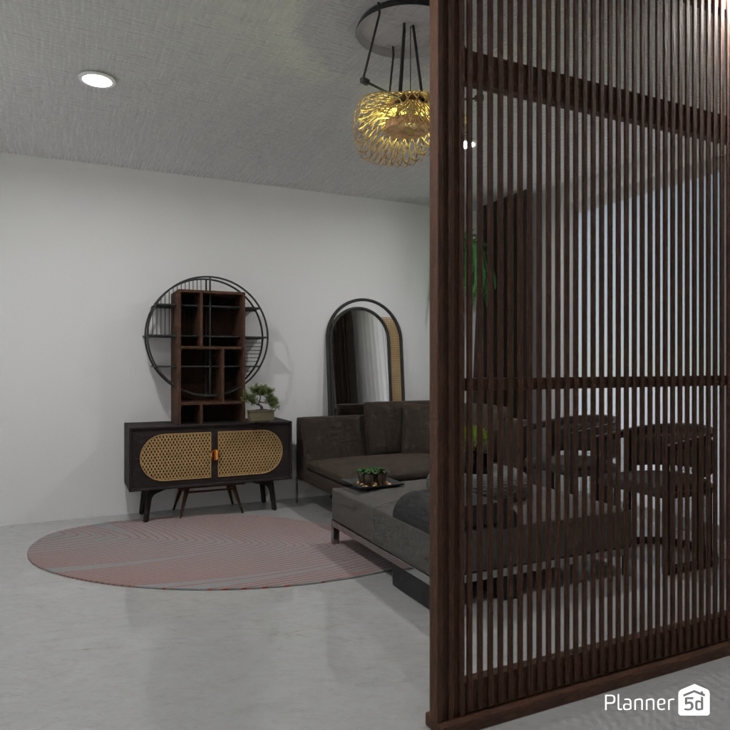 Progetta gli interni di un soggiorno in stile Japandi.