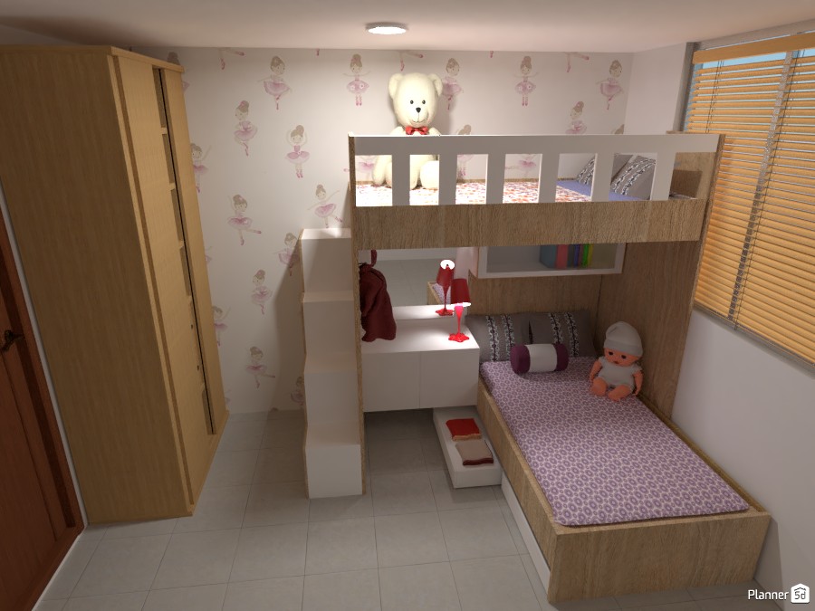 Mueble madera flor morado, con acabado en poliuretano blanco y detalle de papel tapiz decorativo infantil.