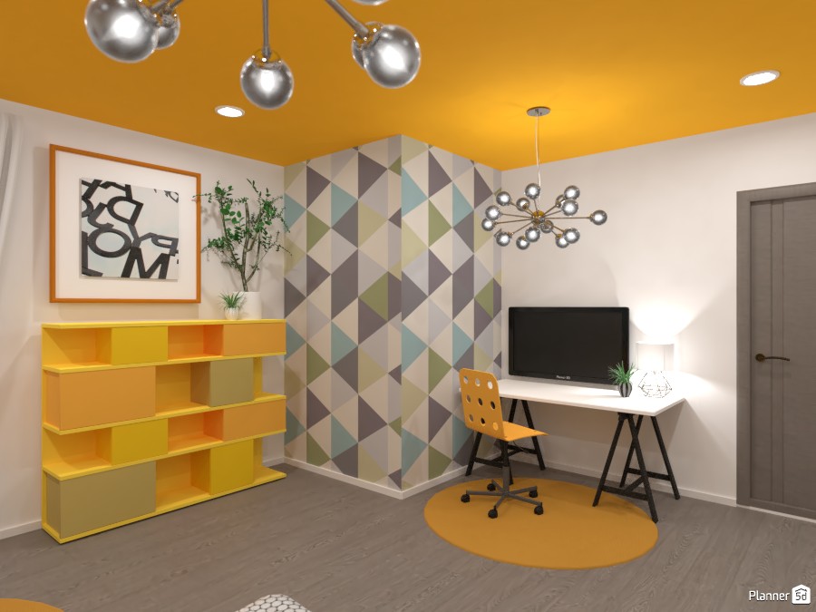 bedroom with a sleeping area, studying area and a space for toys. The main colors are gray and yellow.