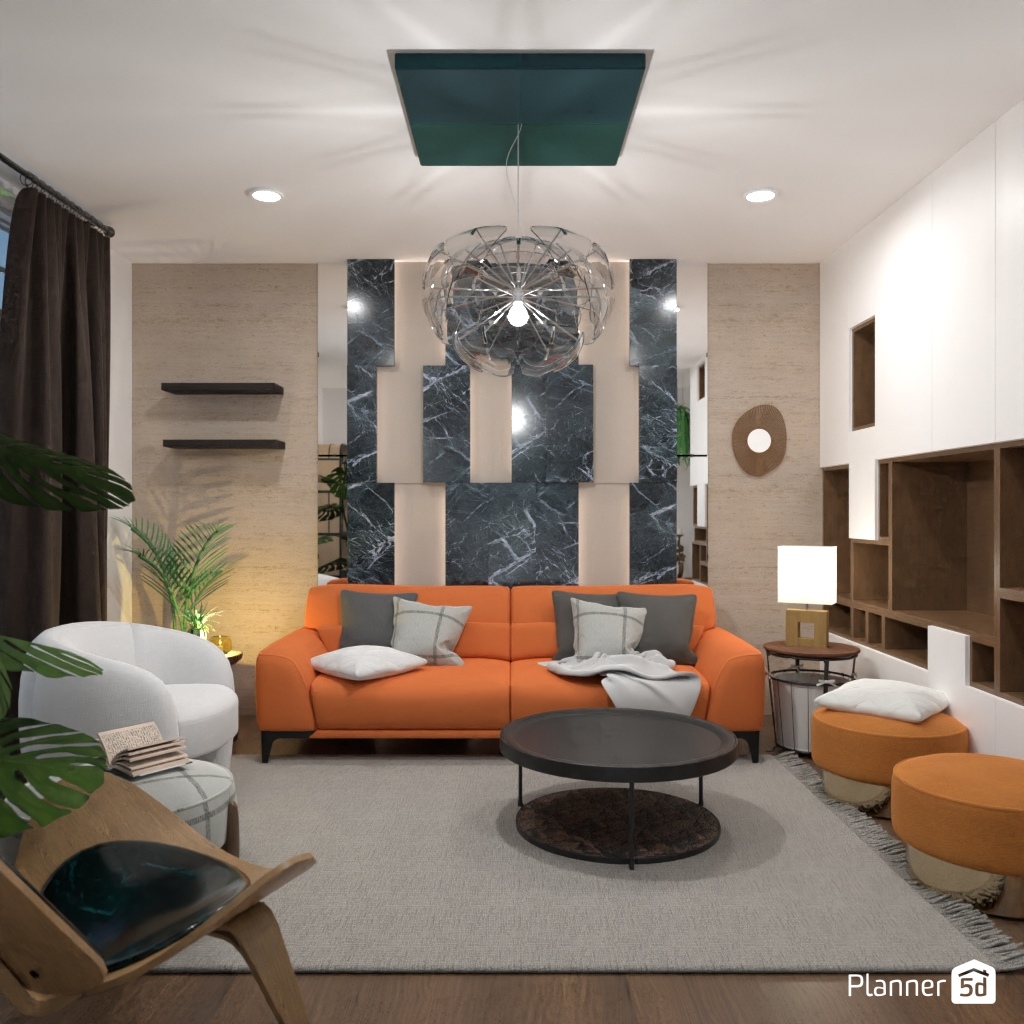 Suprojektuok interjerą aplink oranžinę sofą.