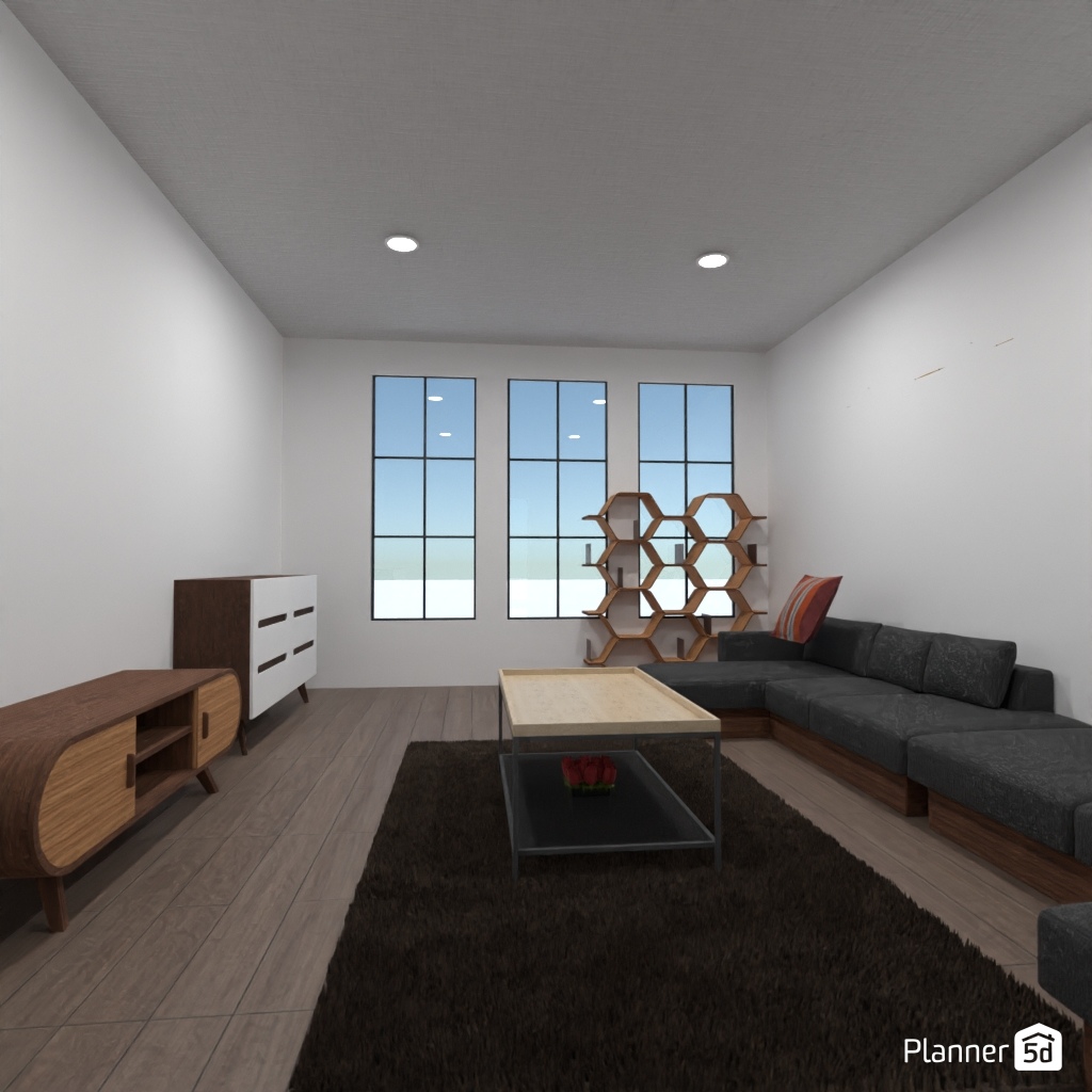 Suprojektuok hi-tech stiliaus svetainę su TV zona.