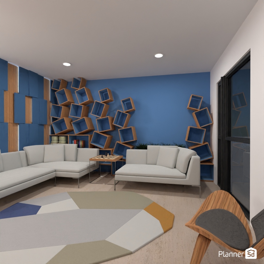 Zaprojektuj wnętrze salonu z różnymi geometrycznymi kształtami.