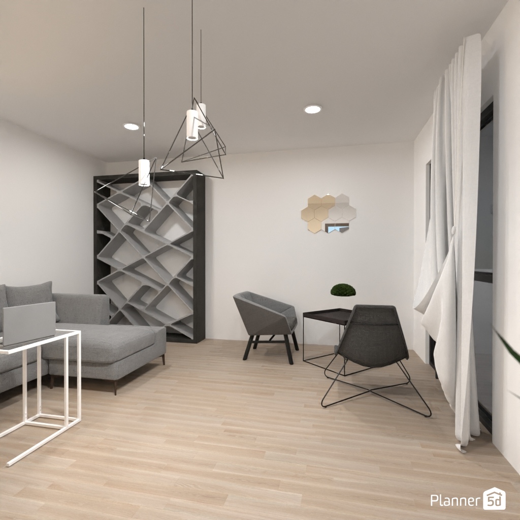 Zaprojektuj wnętrze salonu z różnymi geometrycznymi kształtami.