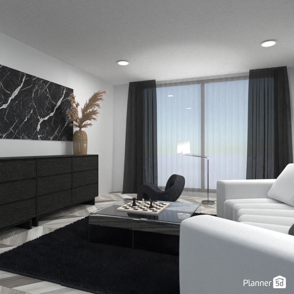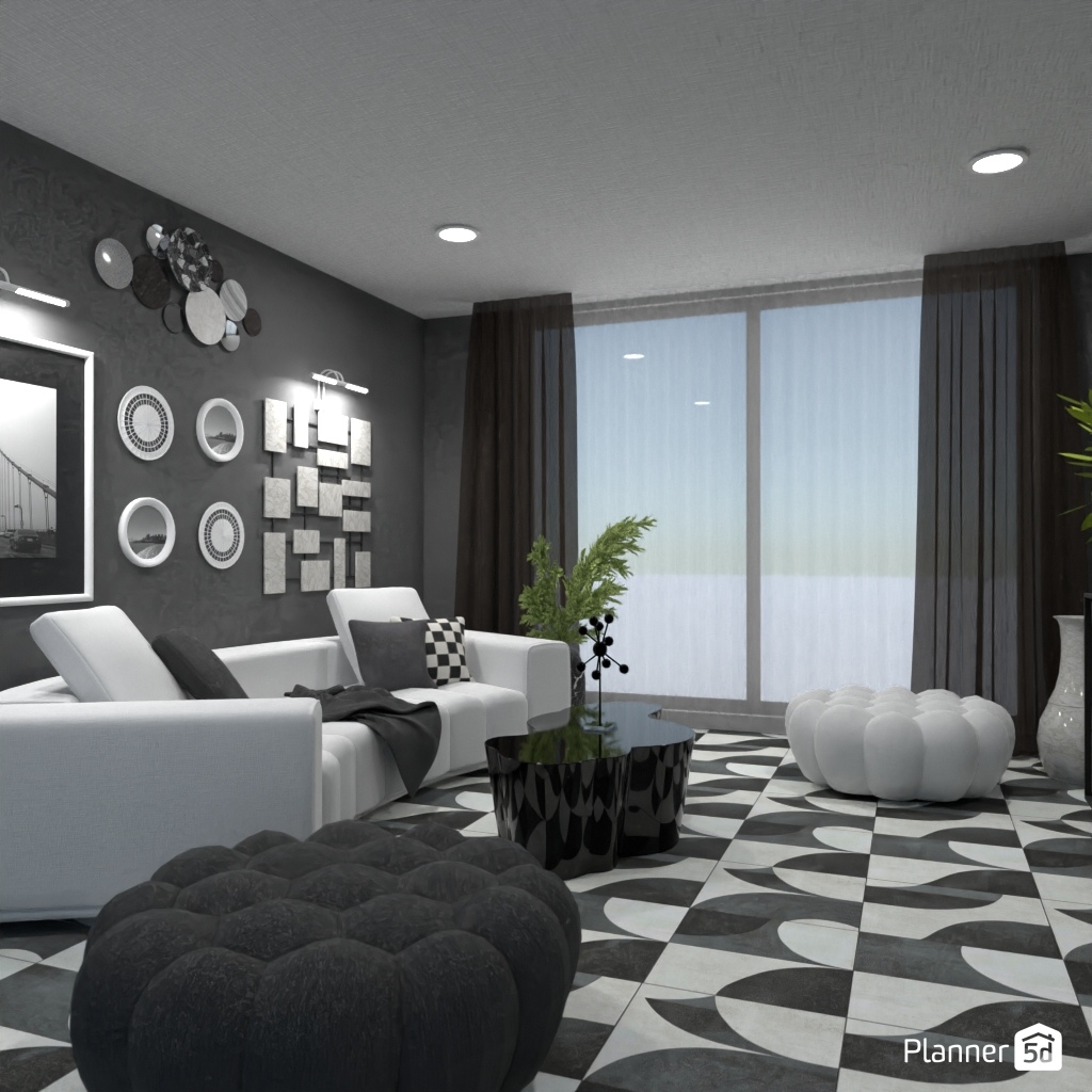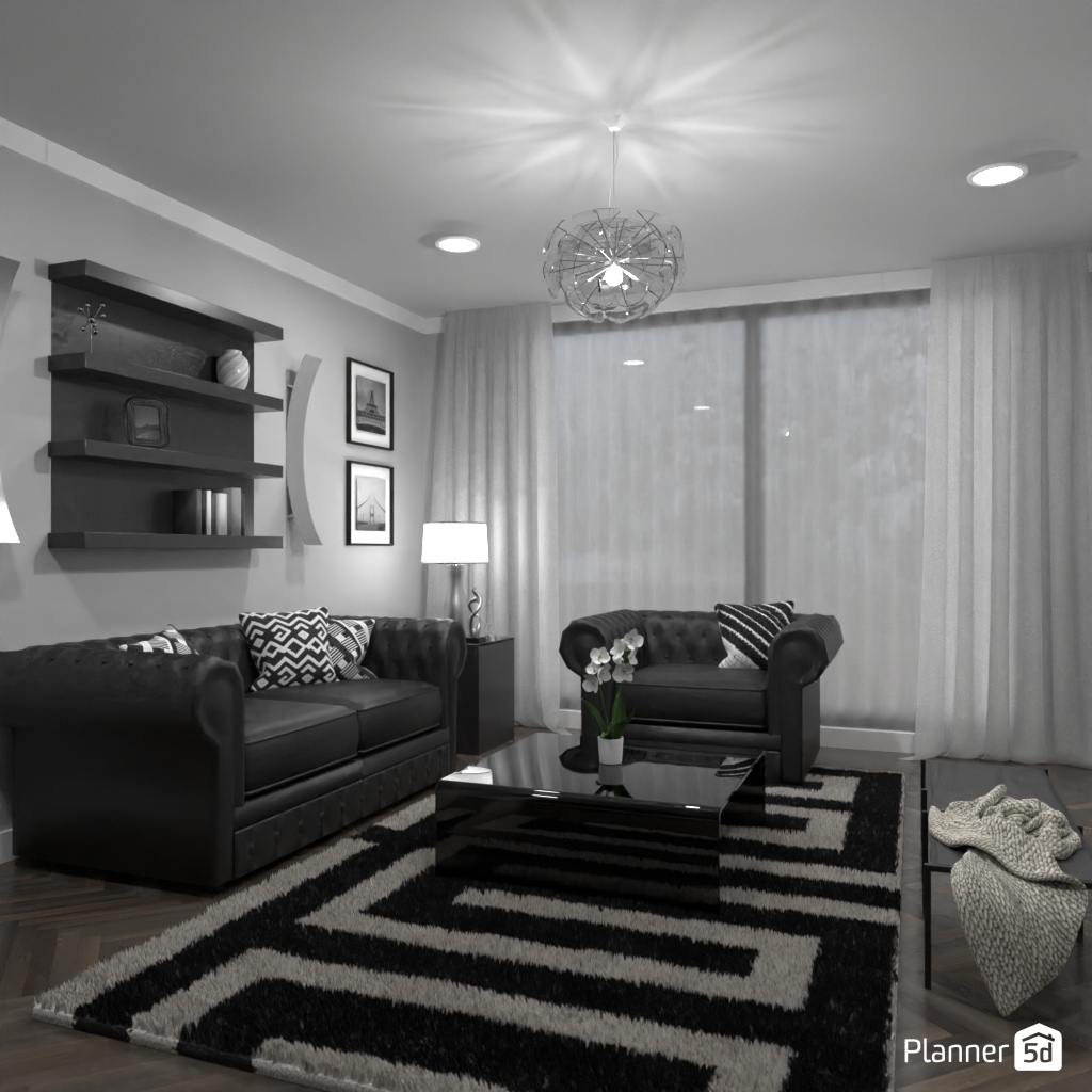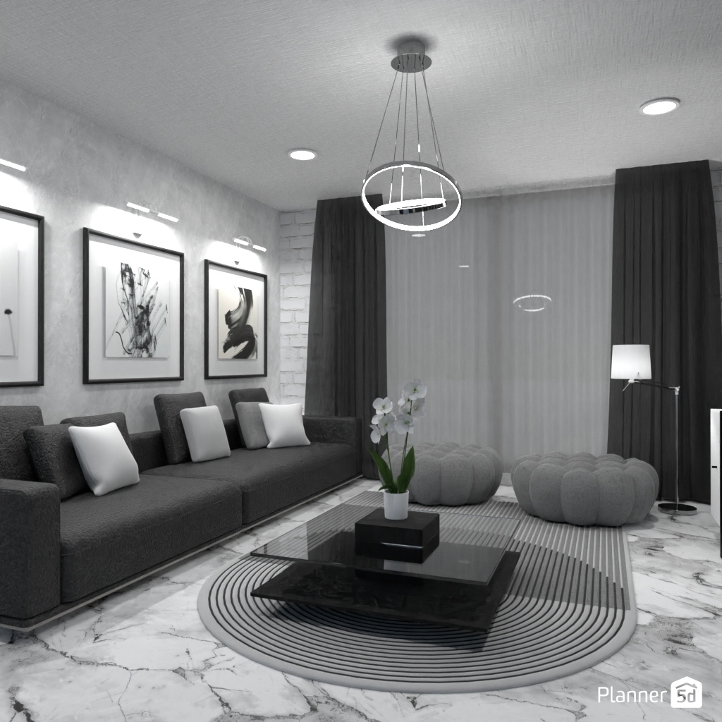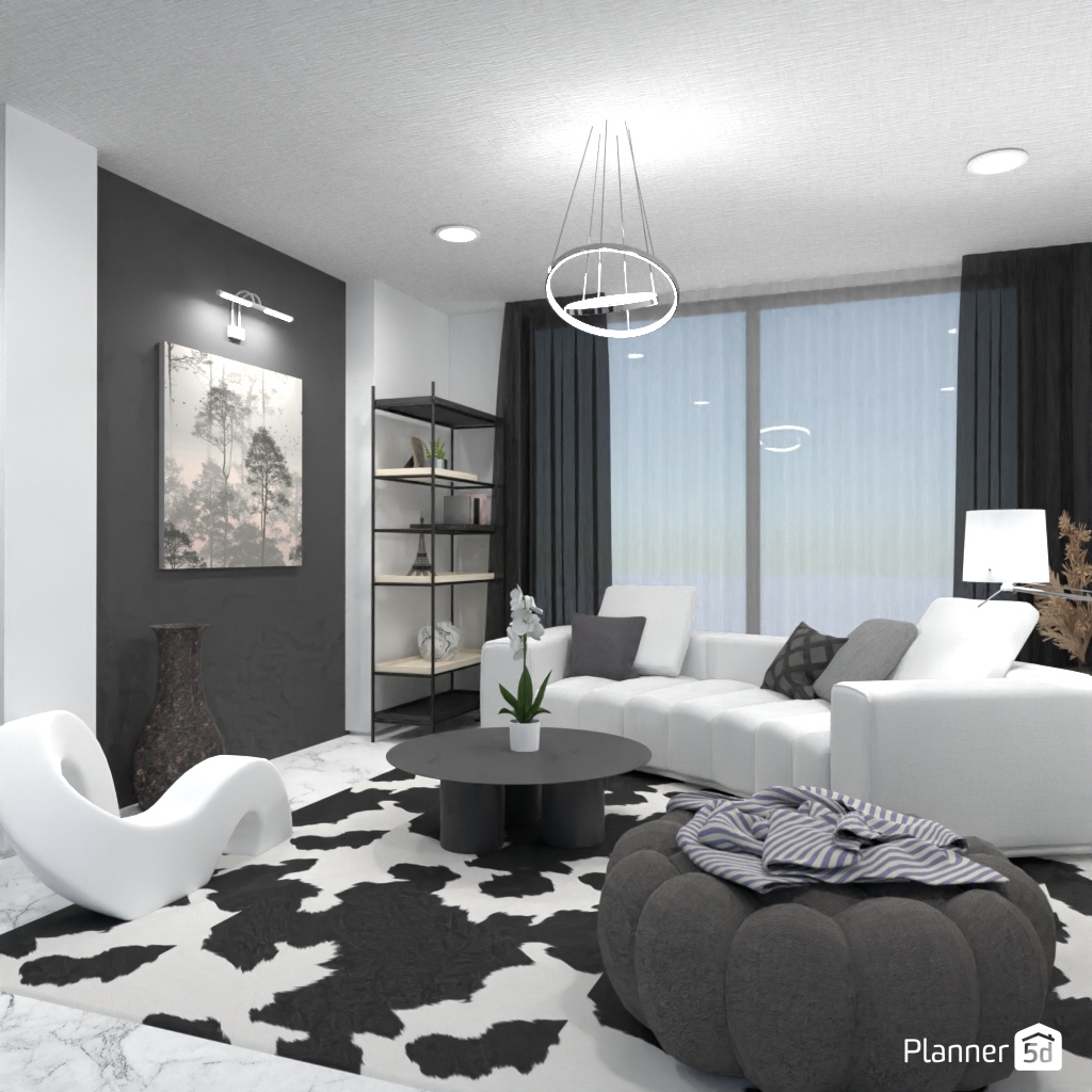Projete um ambiente com alto contraste usando apenas preto, branco e tons de cinza.