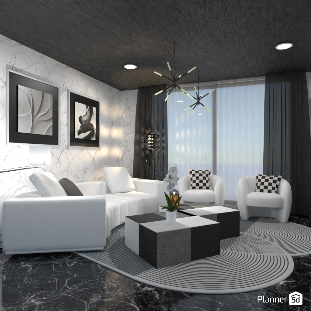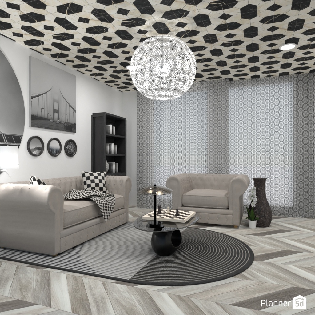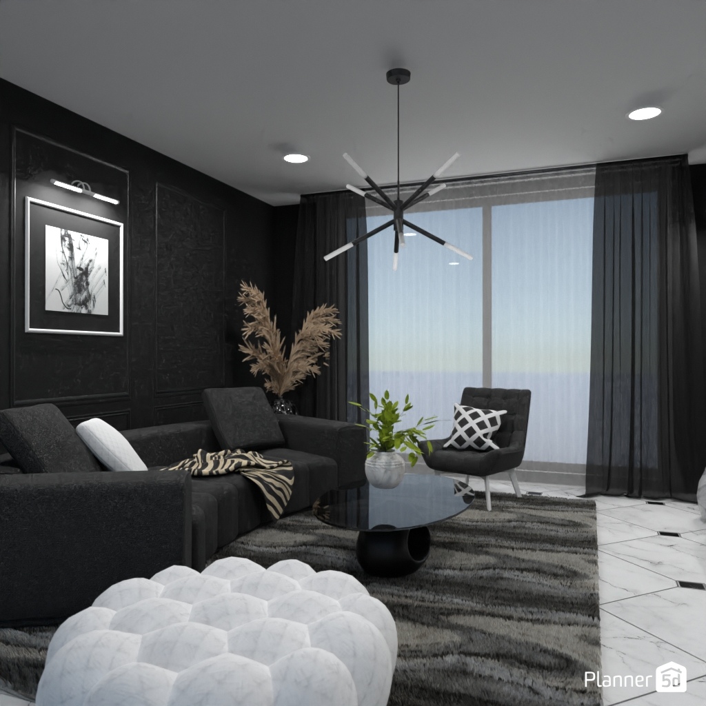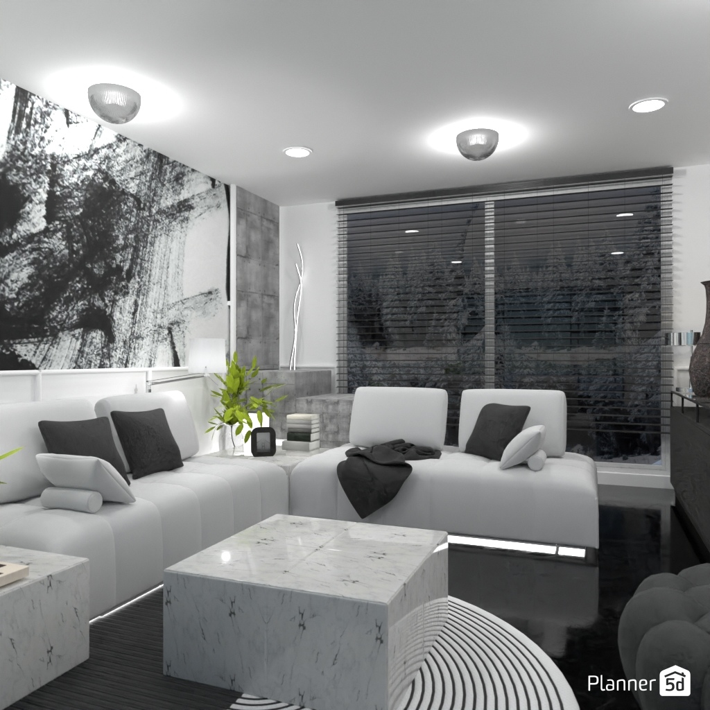 Projete um ambiente com alto contraste usando apenas preto, branco e tons de cinza.