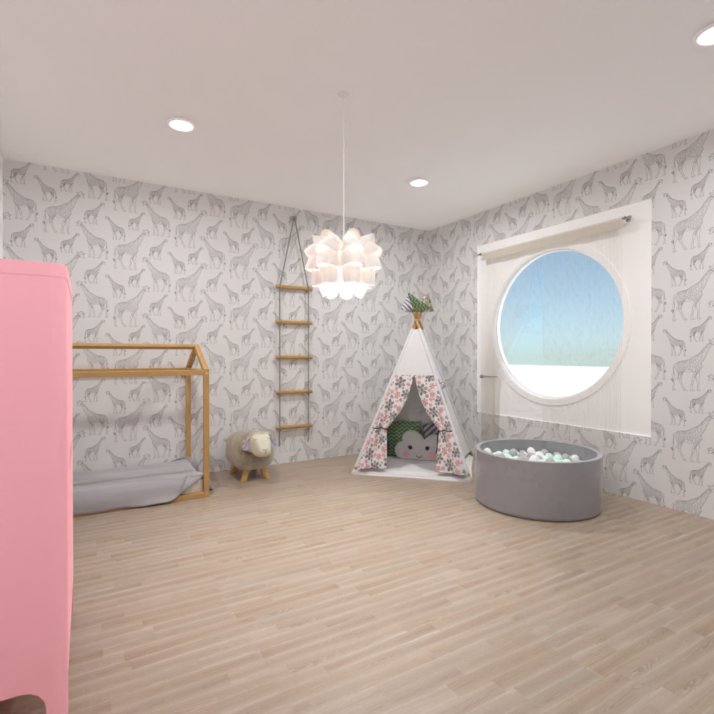 Projete um interior de quarto infantil em cores pastel.