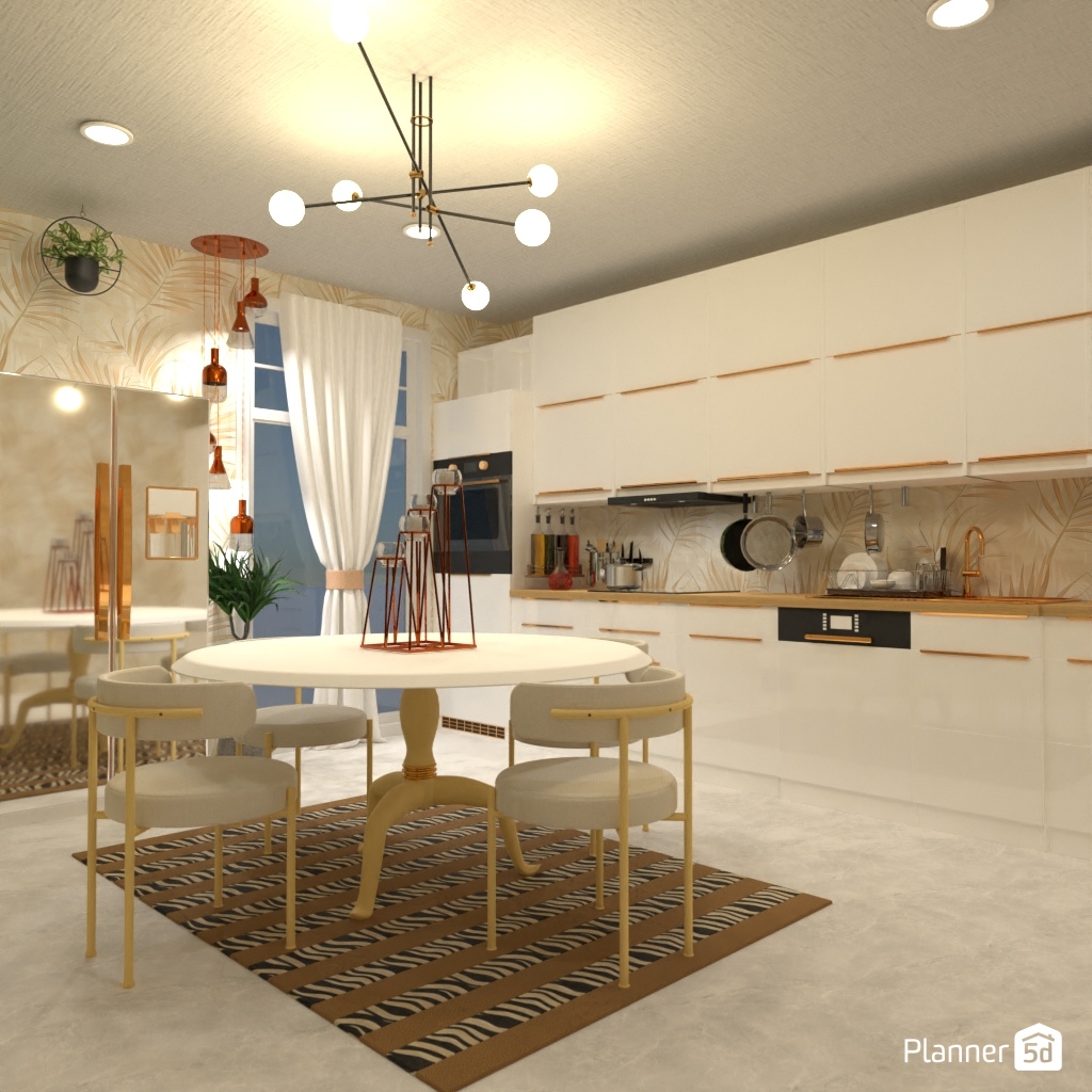 Projete uma cozinha com elementos dourados.