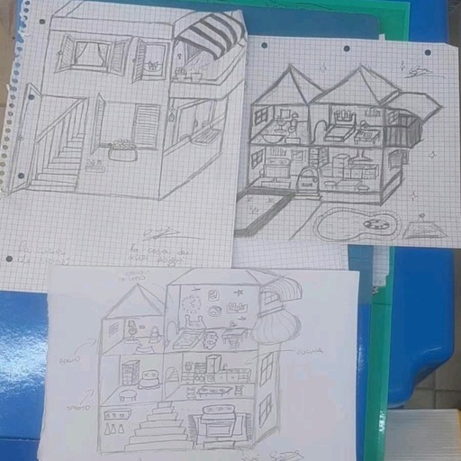 Desenhe uma sala de estar com muitas pinturas na parede."