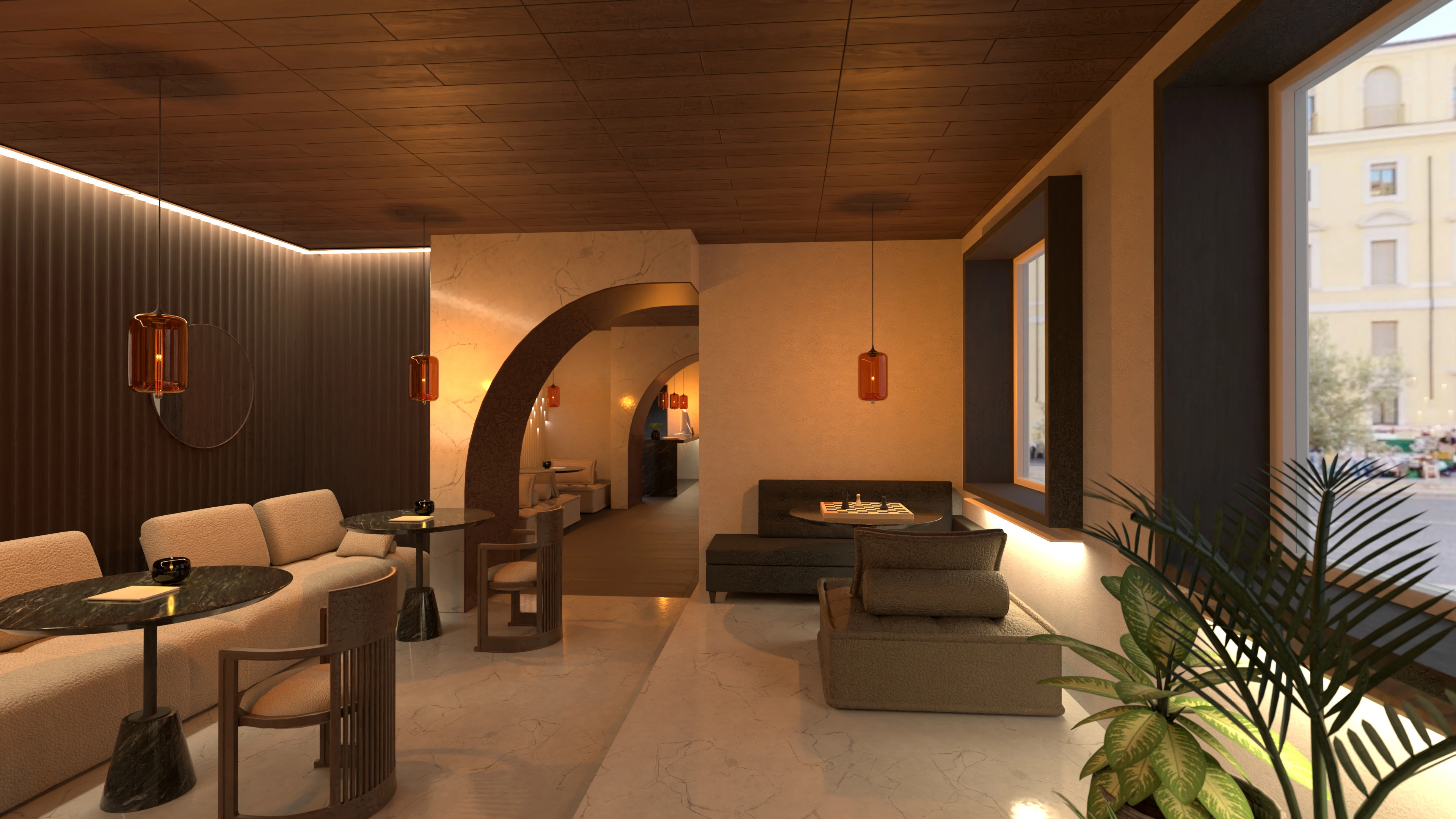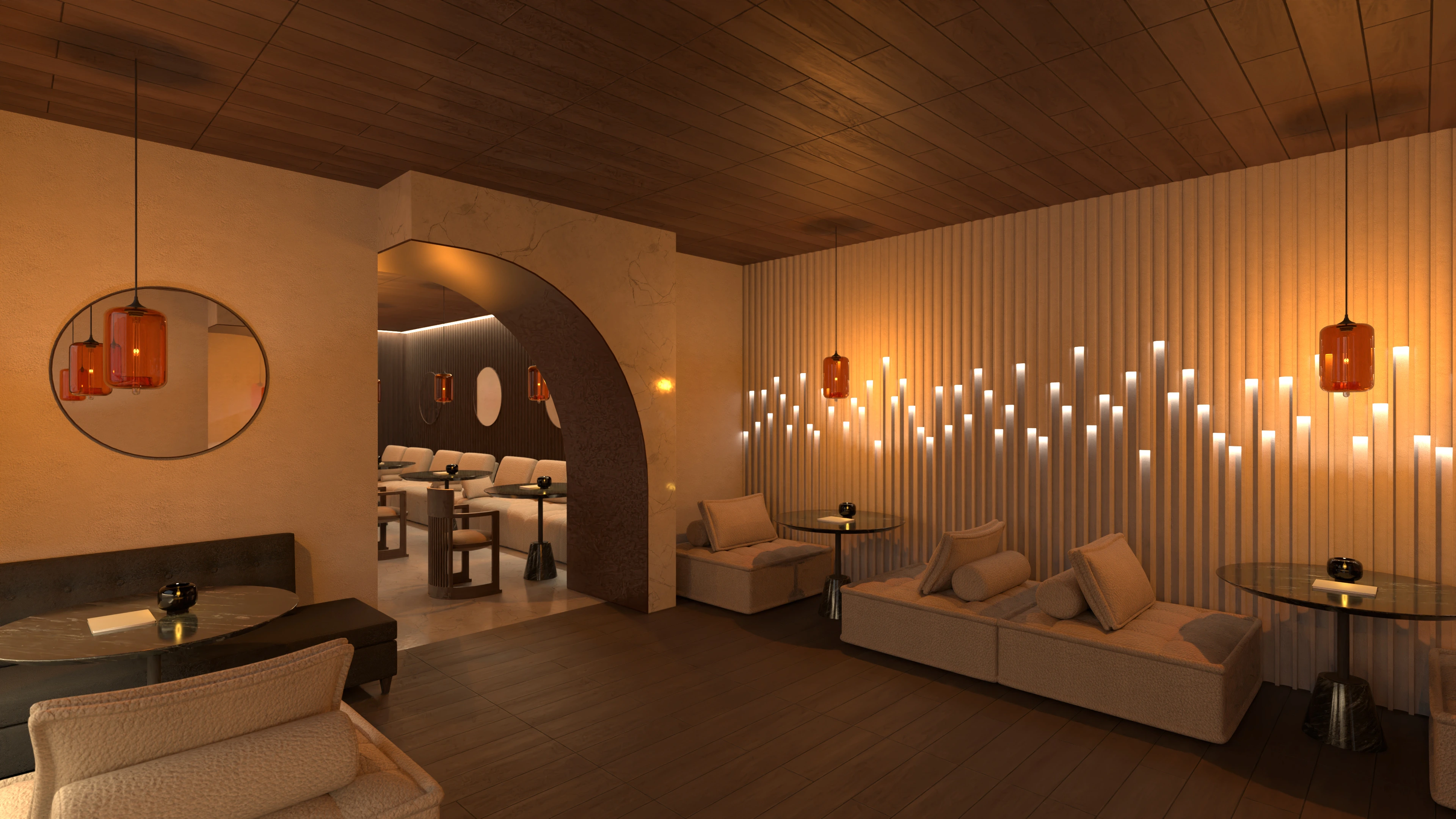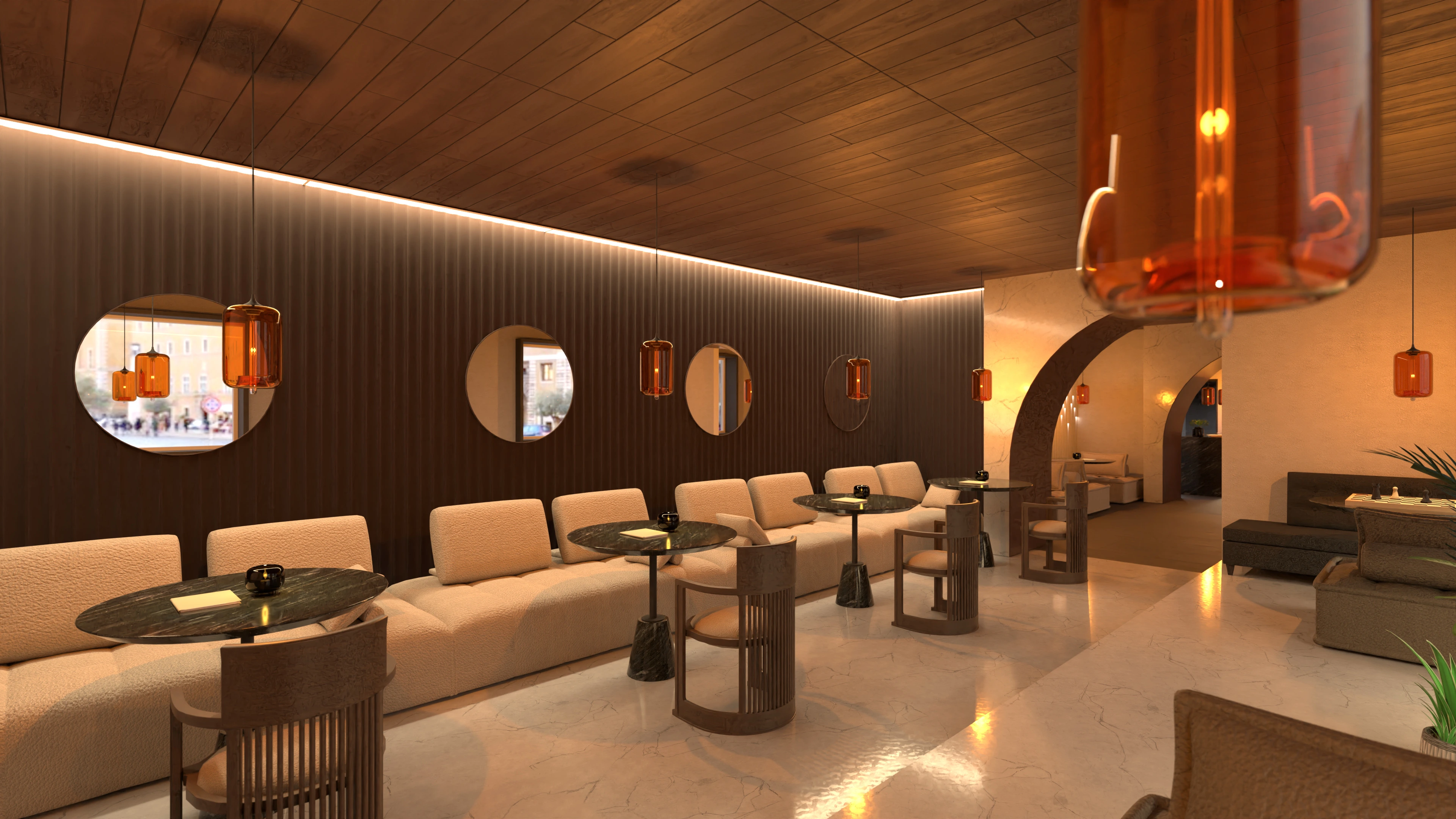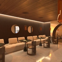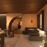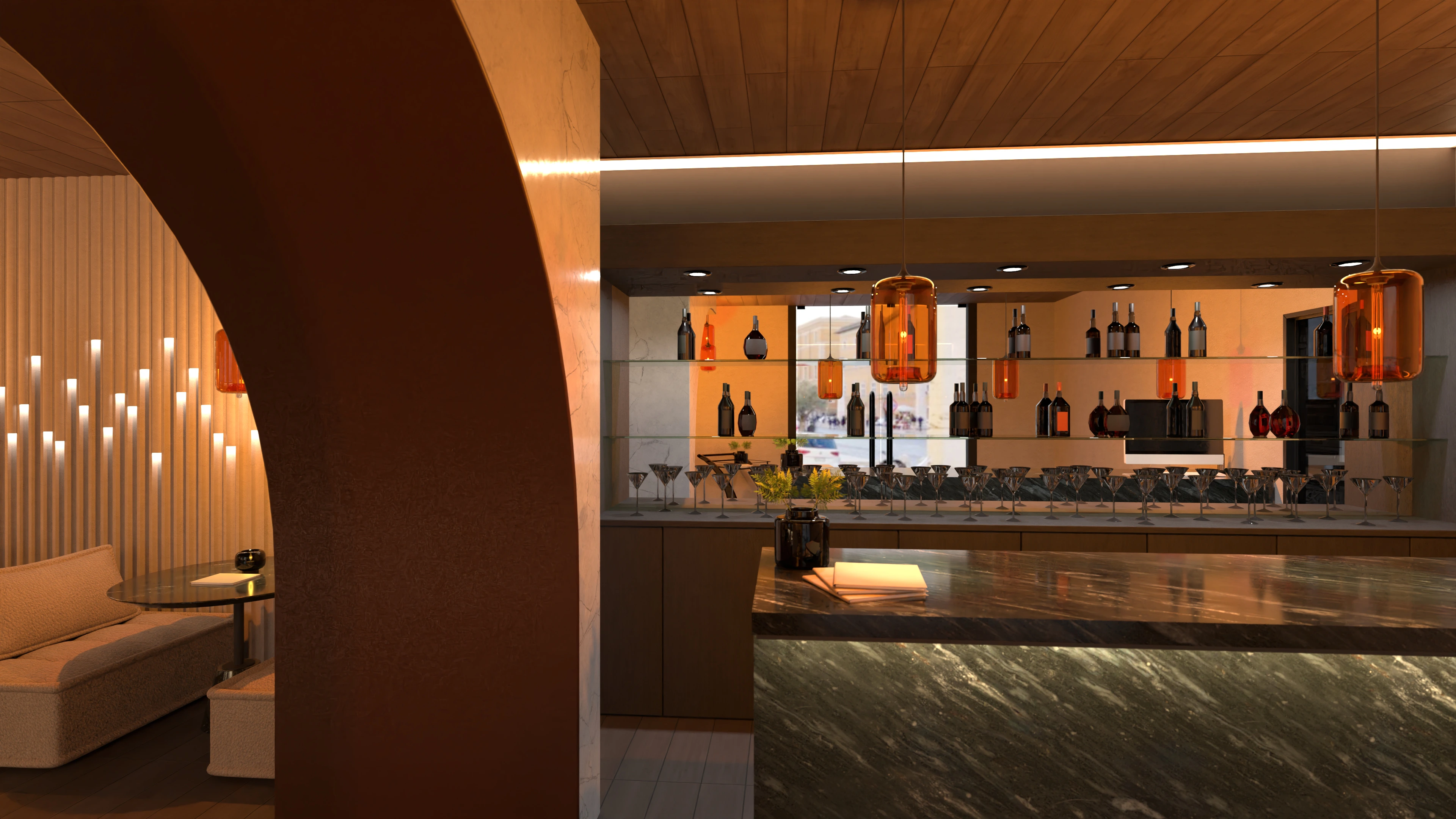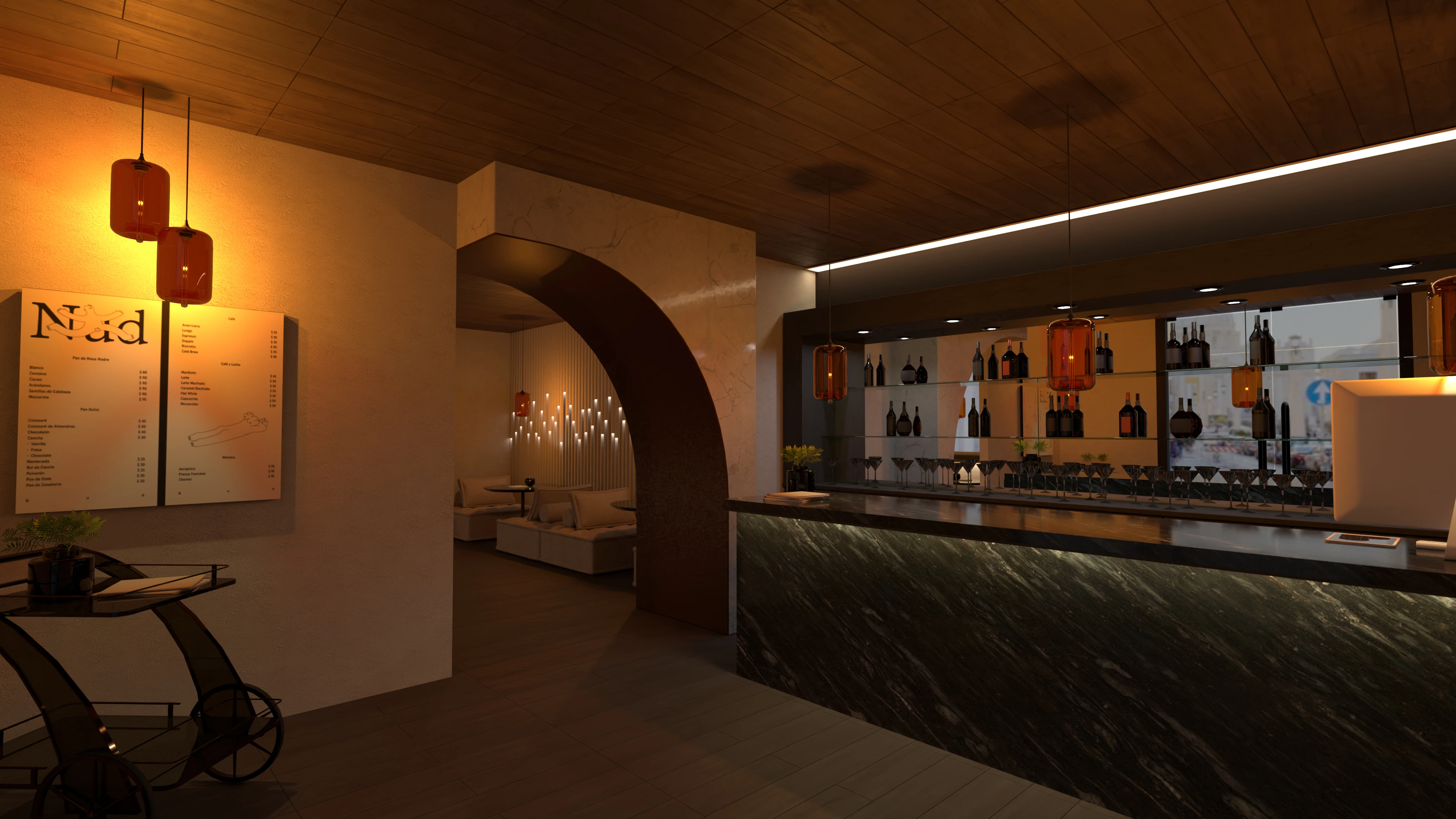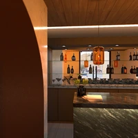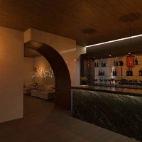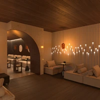 café with ambient lighting and stone accents