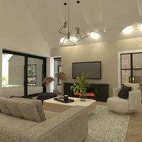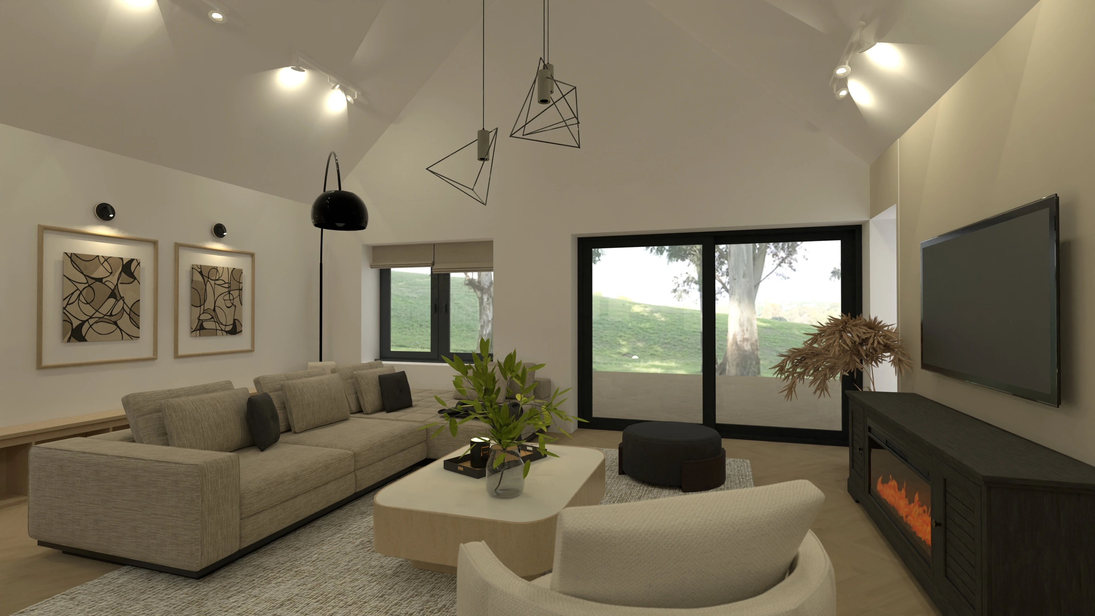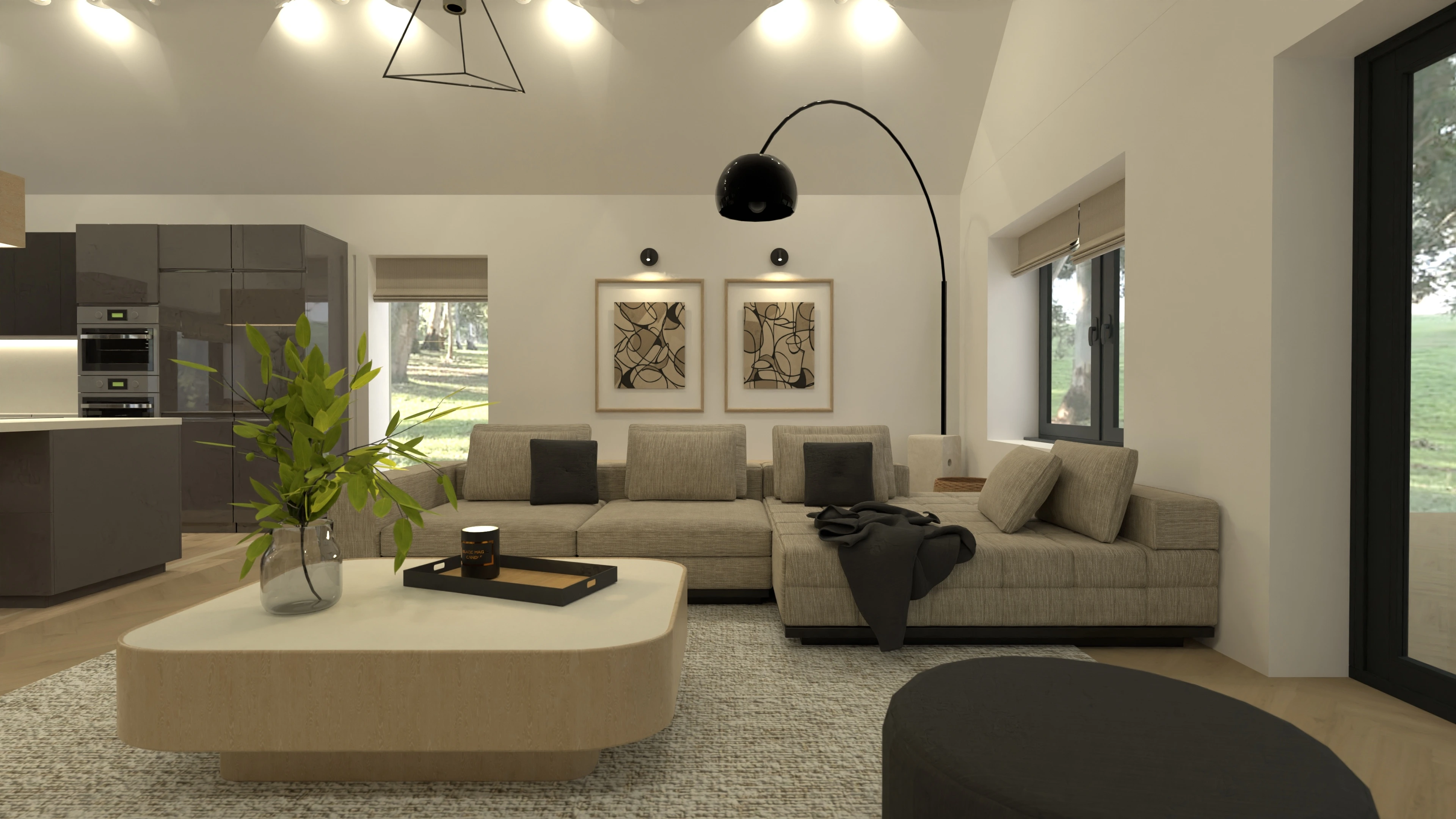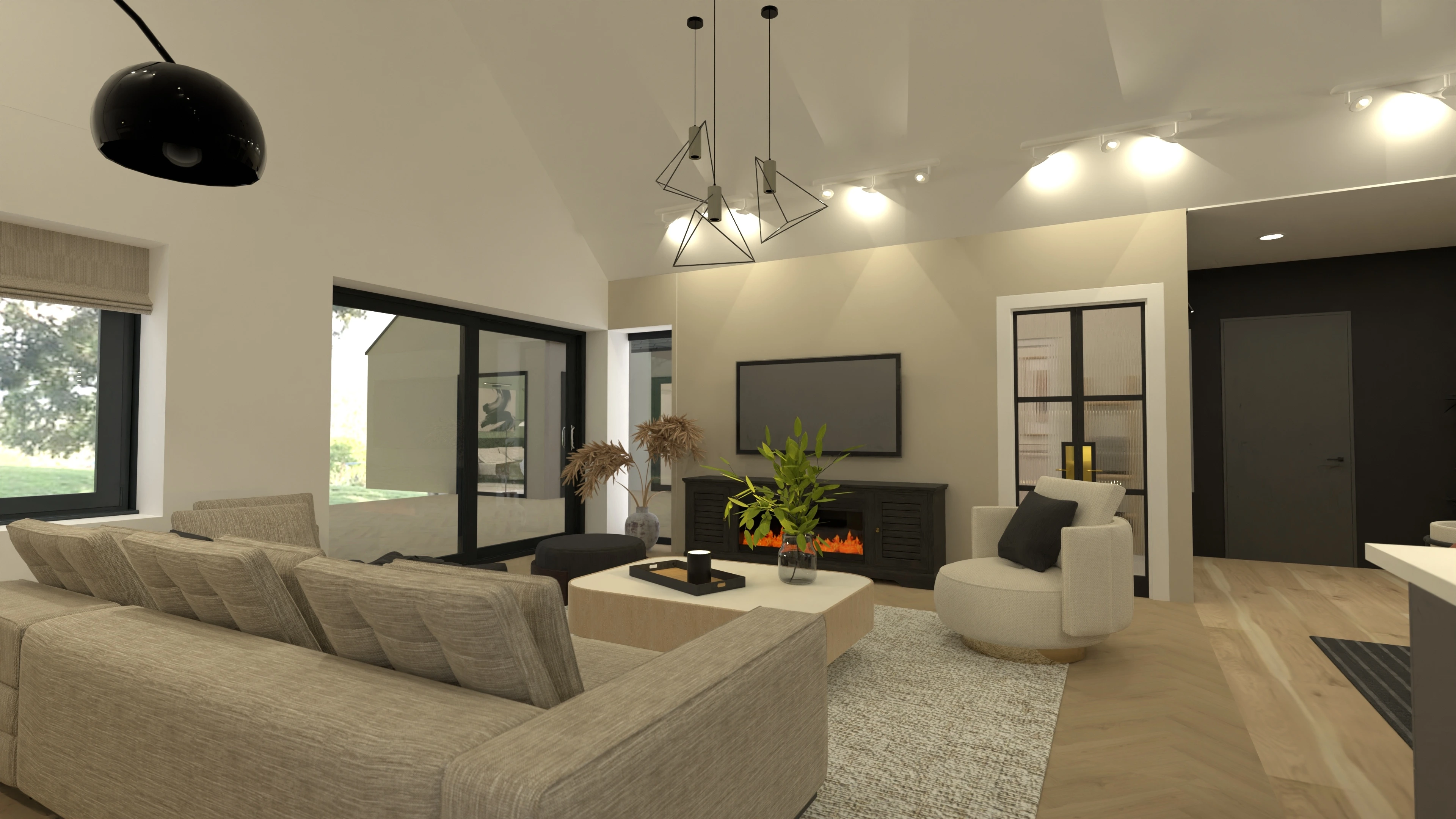 3 bedroom home design in Ireland, with large open concept kitchen/dining/living room with vaulted ceilings.