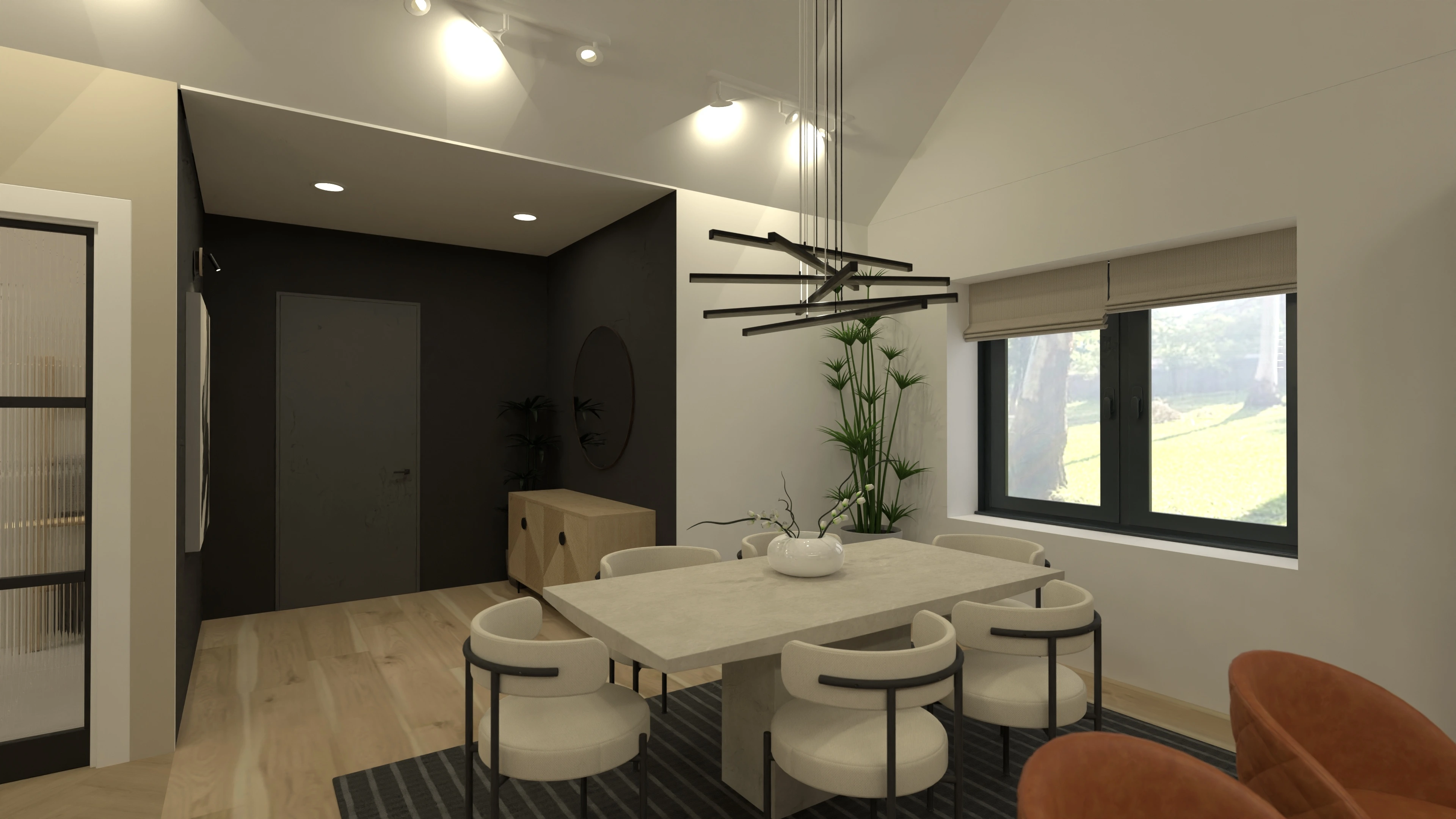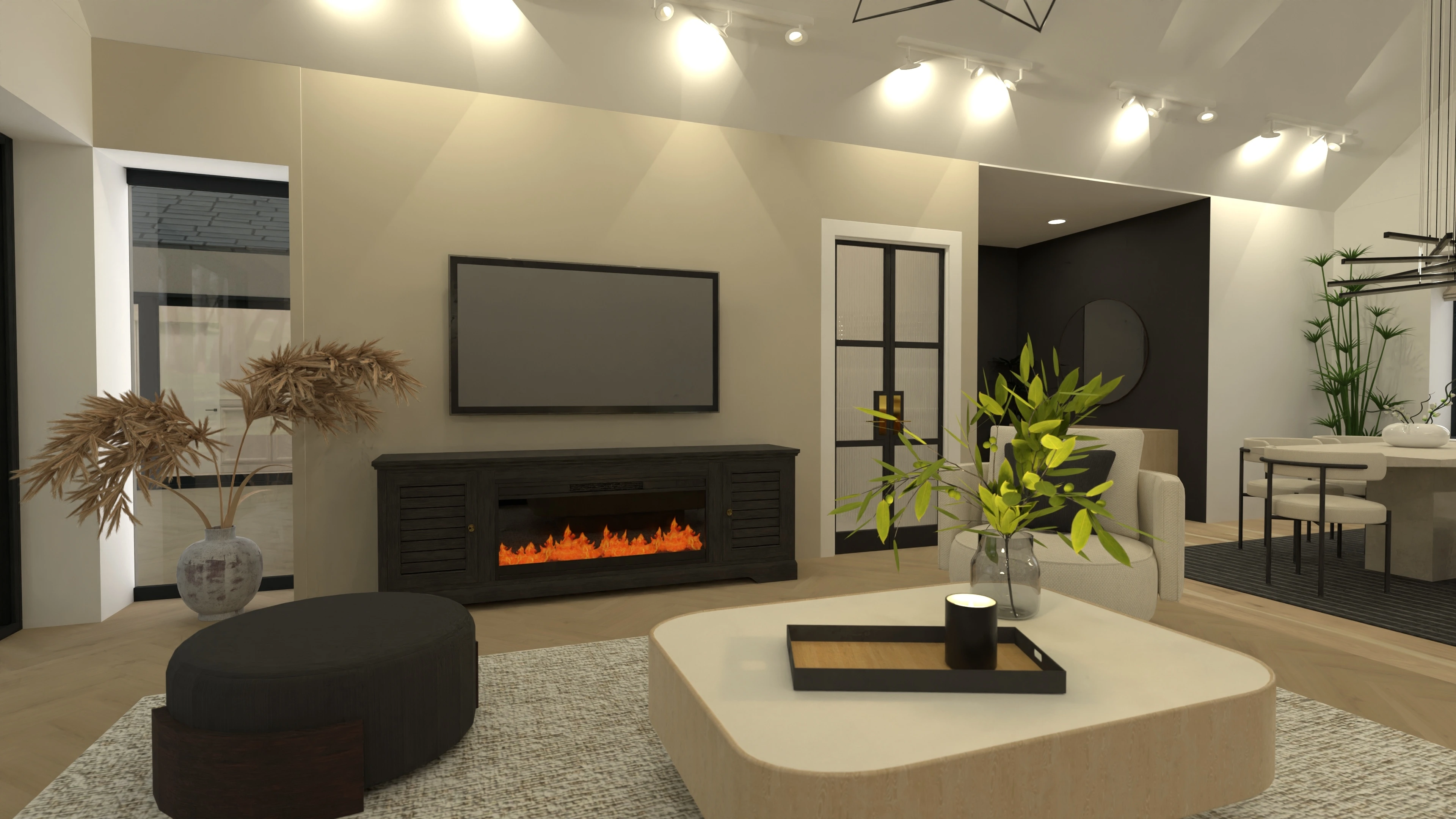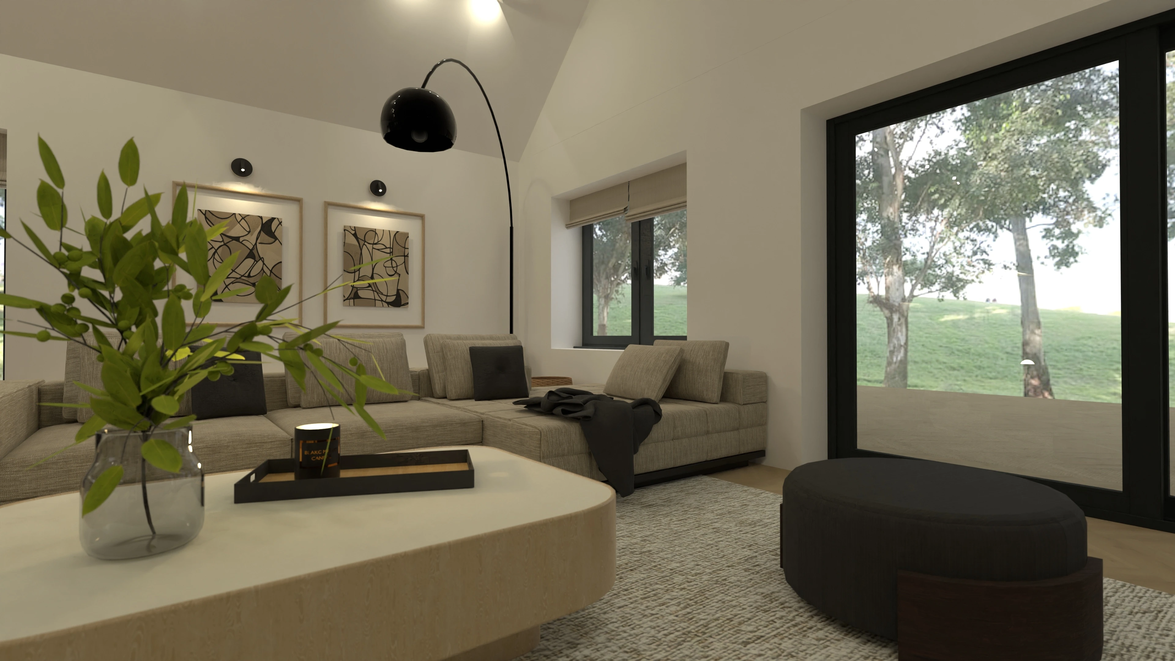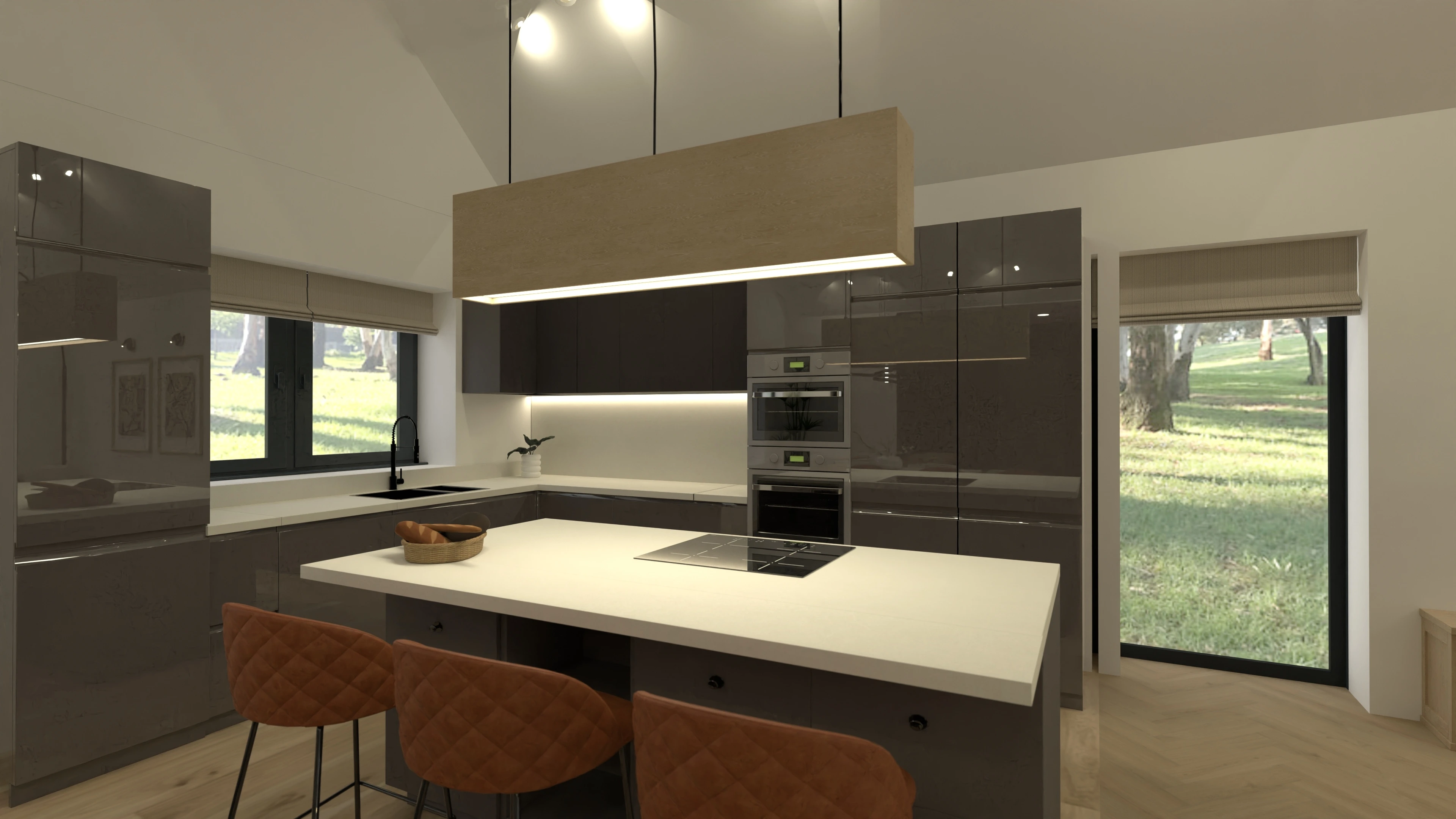 3 bedroom home design in Ireland, with large open concept kitchen/dining/living room with vaulted ceilings.