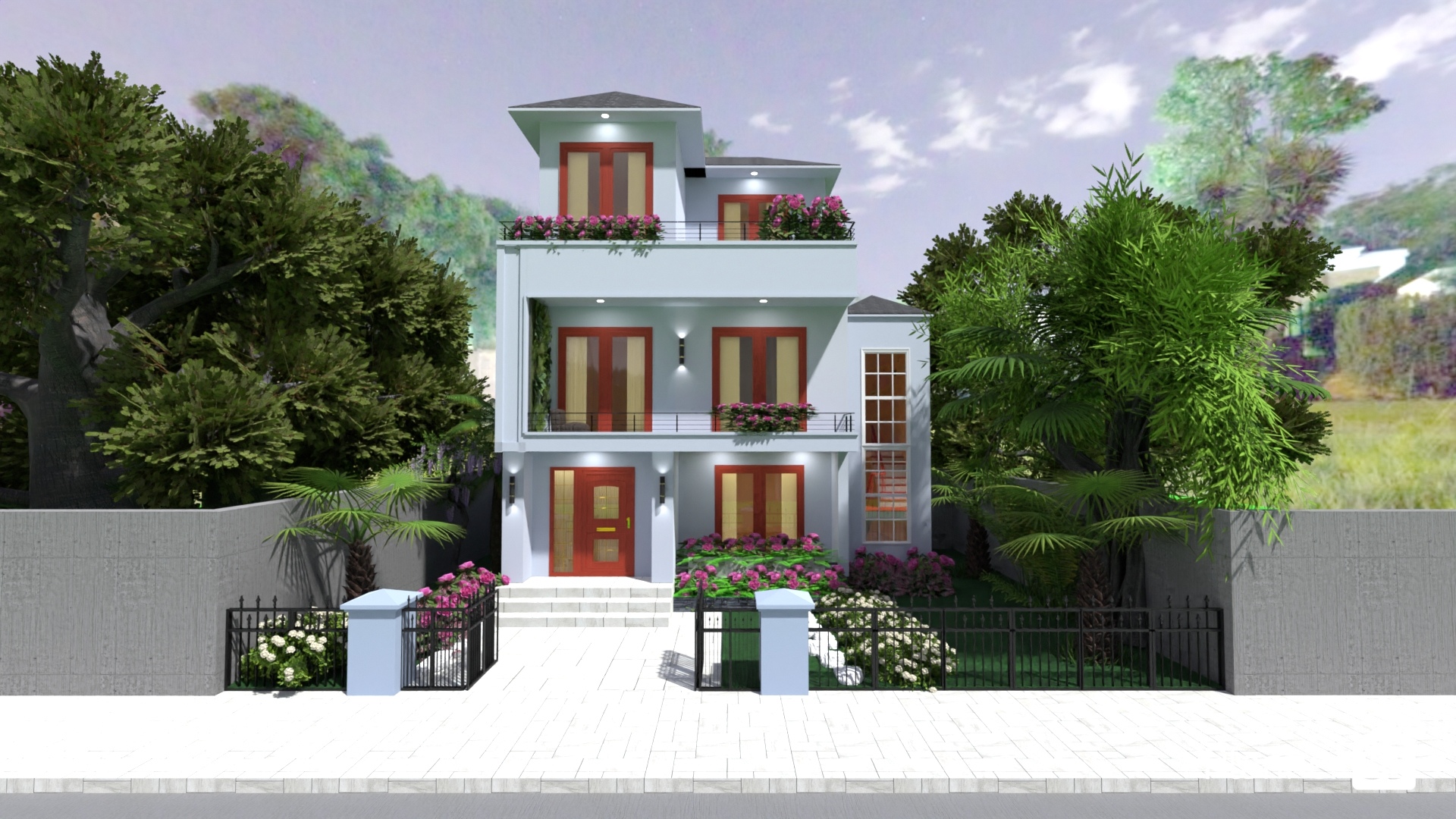 Casa familiar de tres plantas con terraza y jardines exteriores