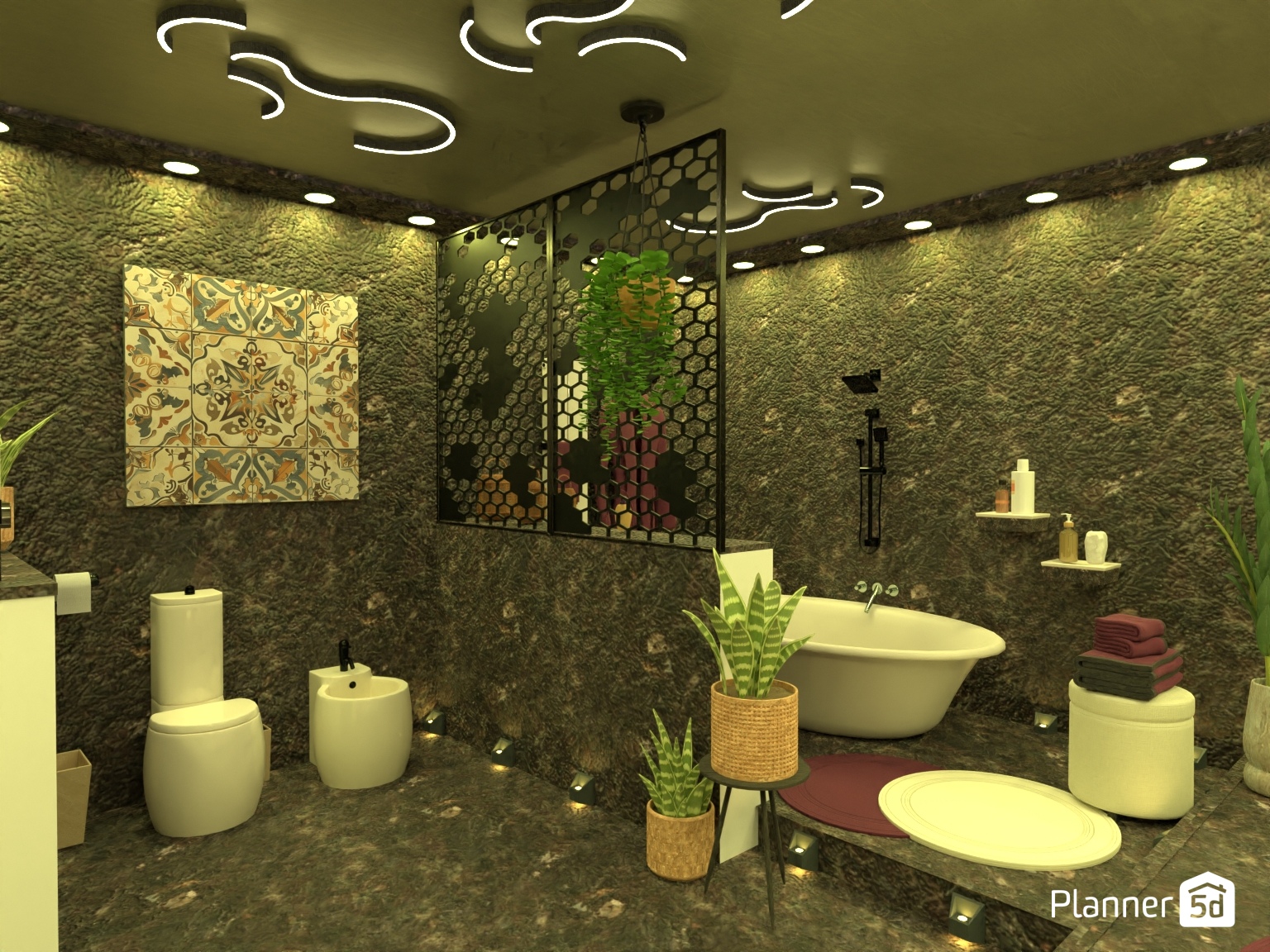 Baño contemporáneo en tonalidad oscura en contraste con los sanitarios blancos. iluminación lineal. atmósfera sobria y elegante. detalles en forja y madera