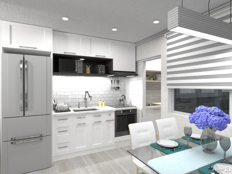 Espaço pratico para o dia a dia, equipado com suporte para aparelhos de cozinha. Local em tons neutros e bem iluminado. Visão ampla da cozinha e sala de jantar.